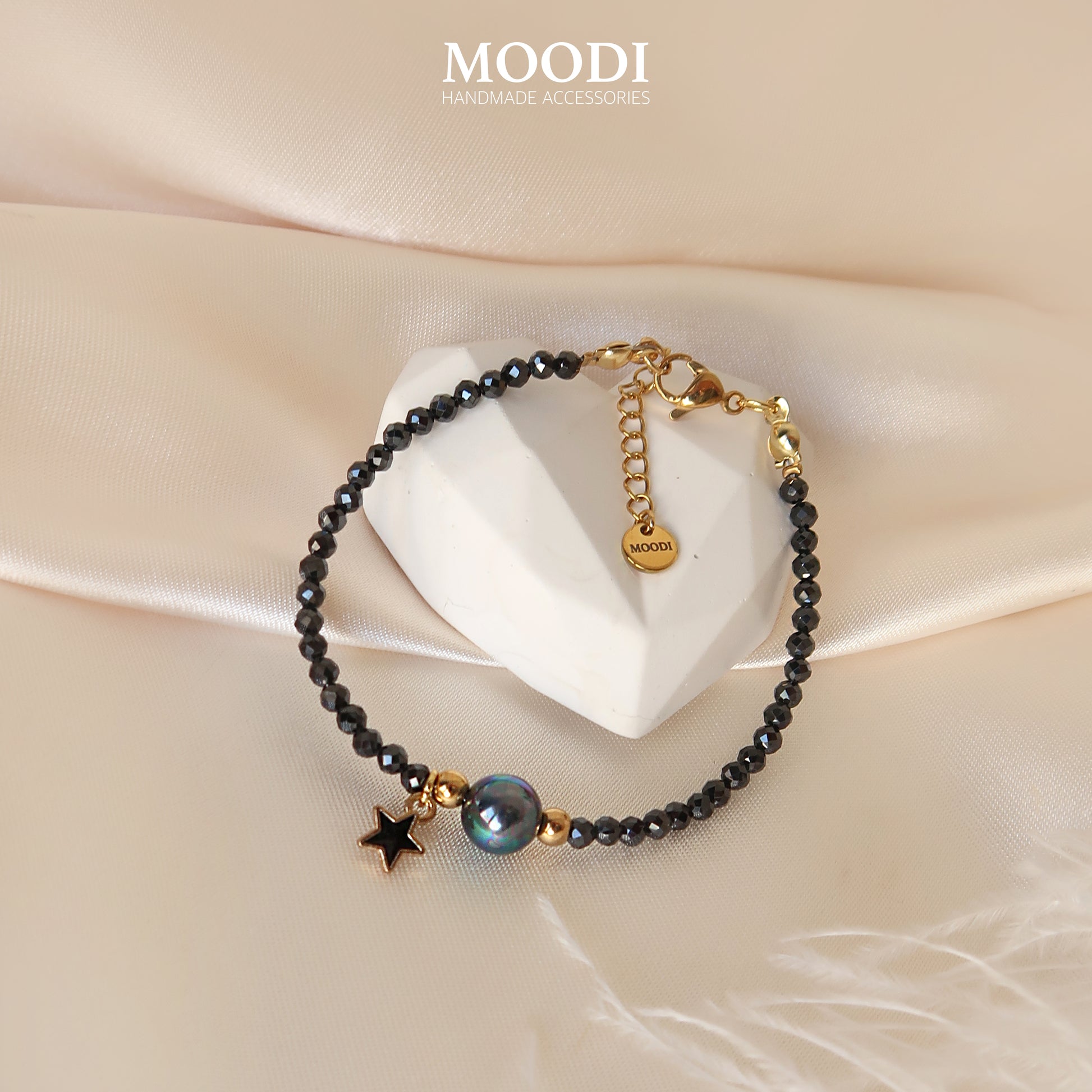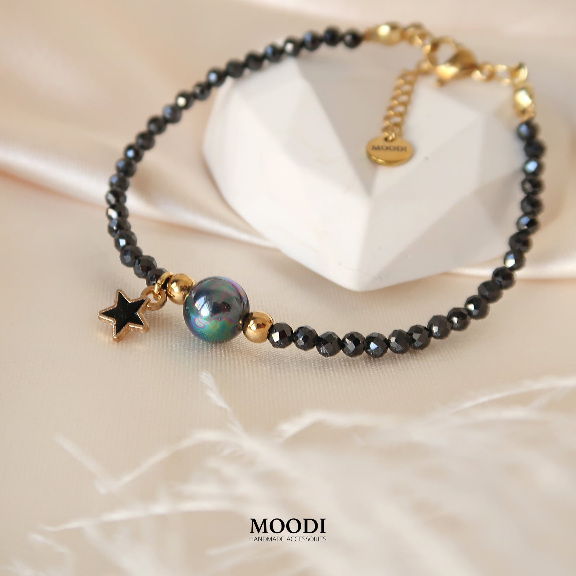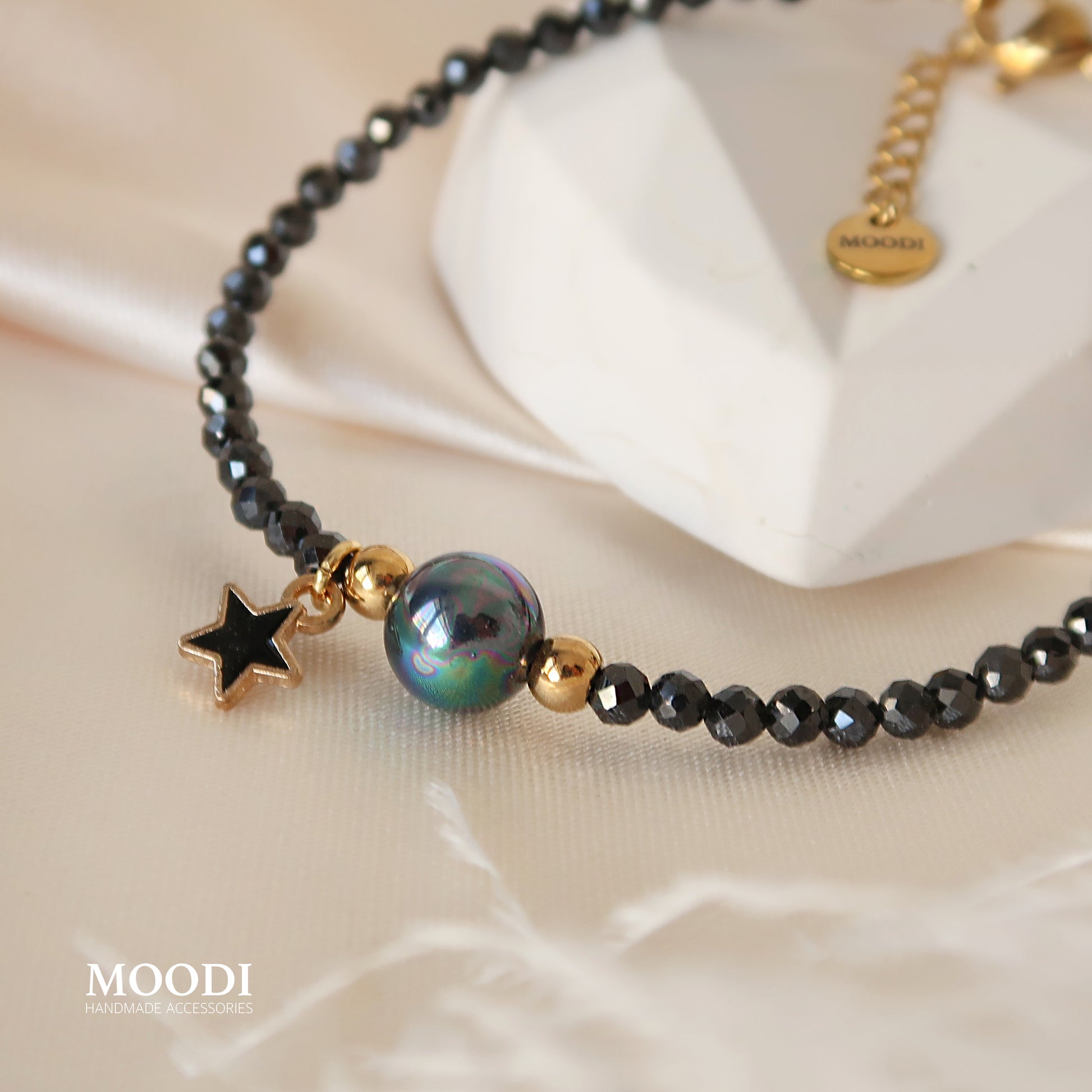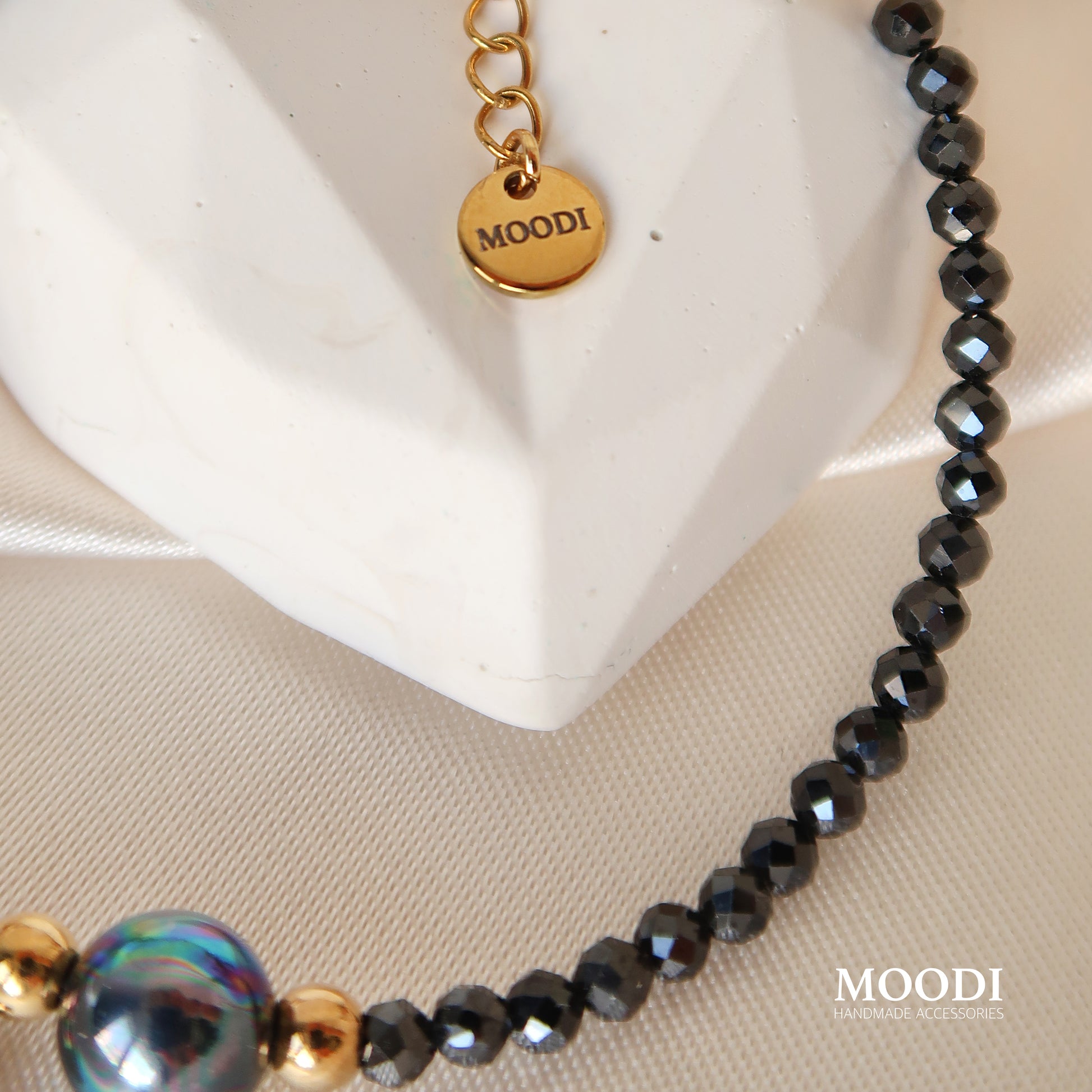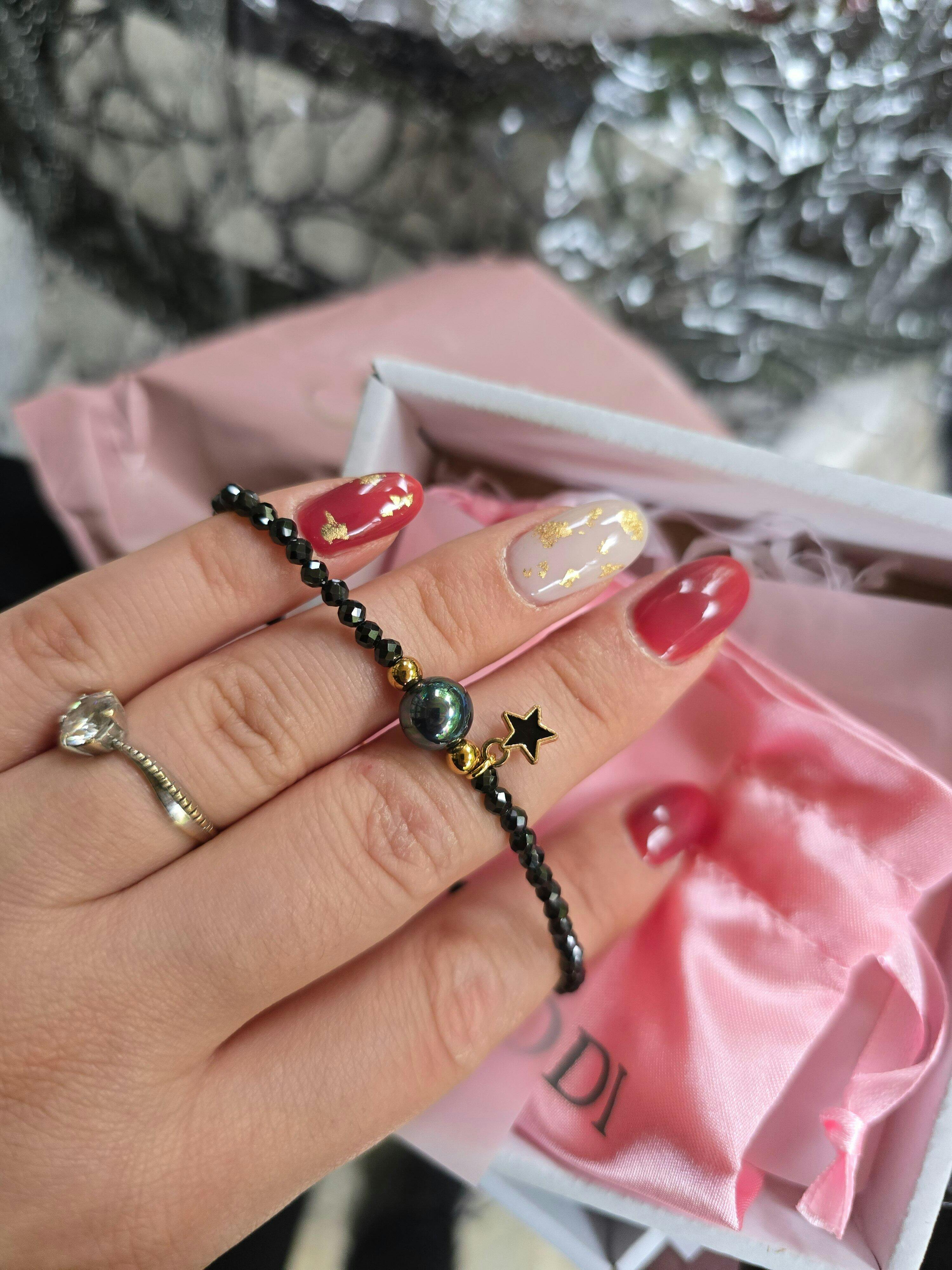 - Материал: Естествени камъни черен турмалин 3мм / черен седеф 8мм/ мъниста, висулка и закопчалки от медицинска стомана
