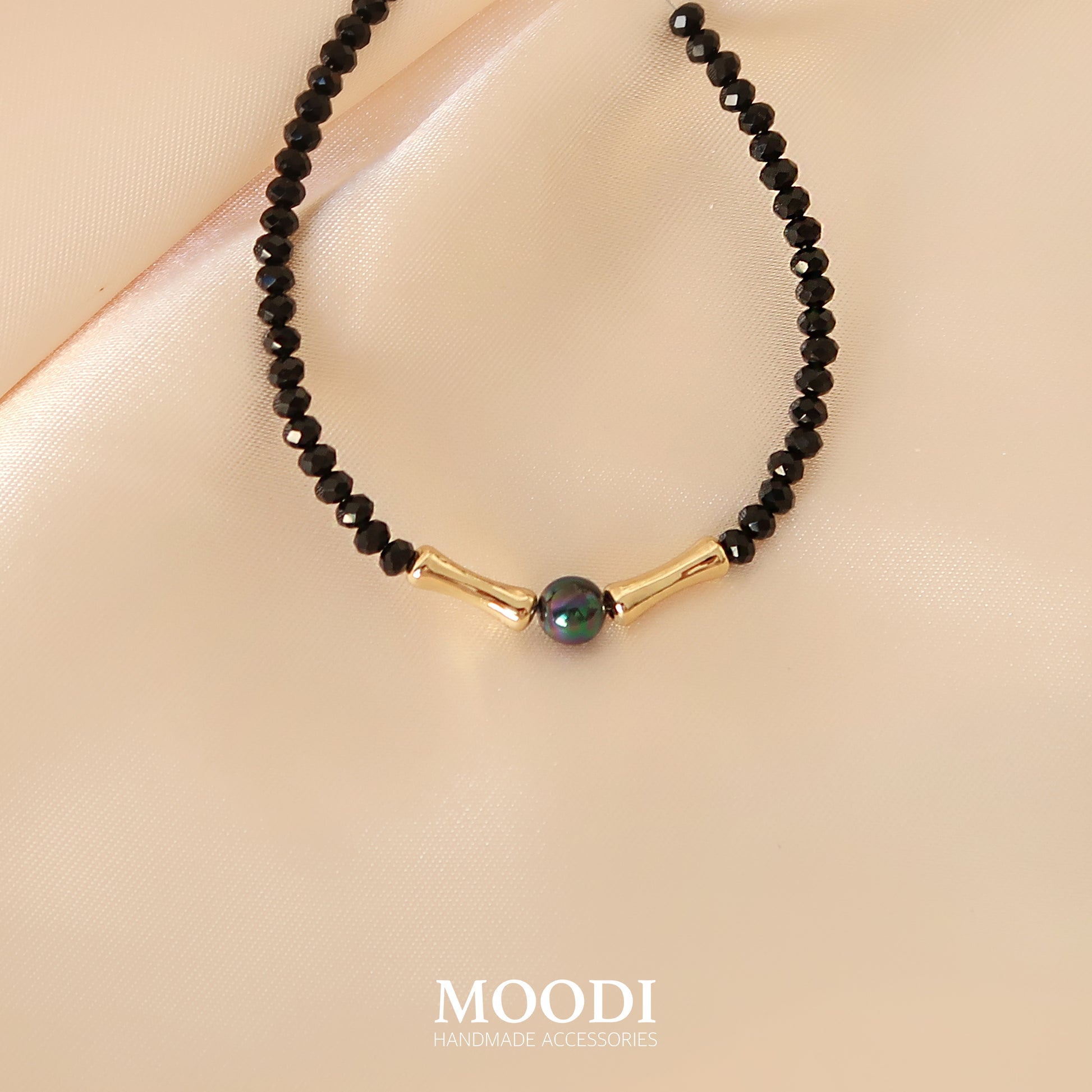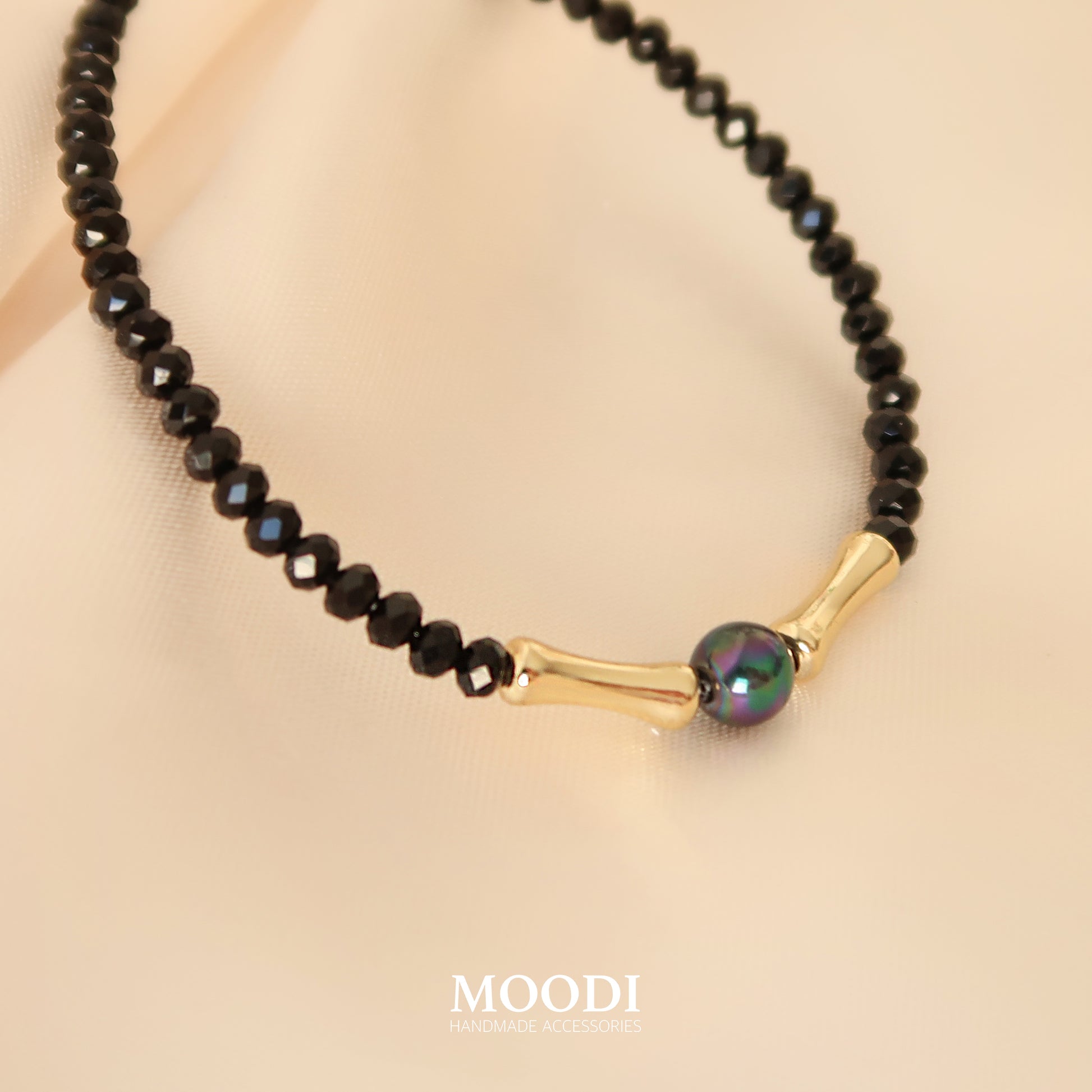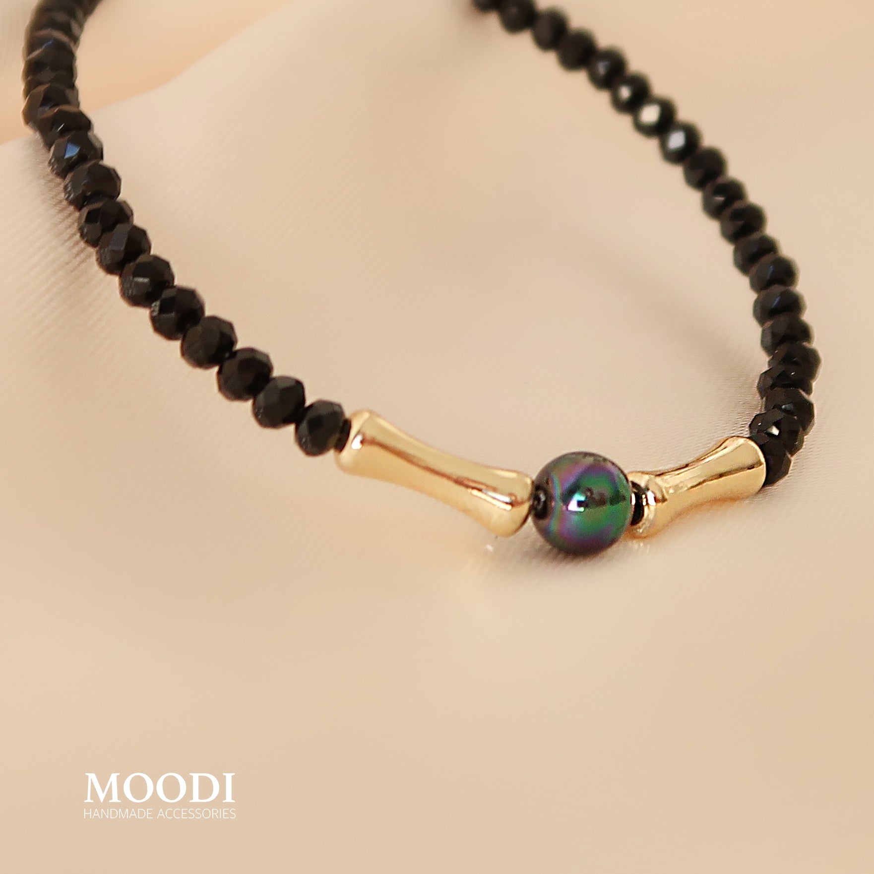 - Материал: Естествени камъни черен турмалин 3мм / продълговати мъниста с позлата / черен седеф / мъниста и закопчалки от медицинска стомана