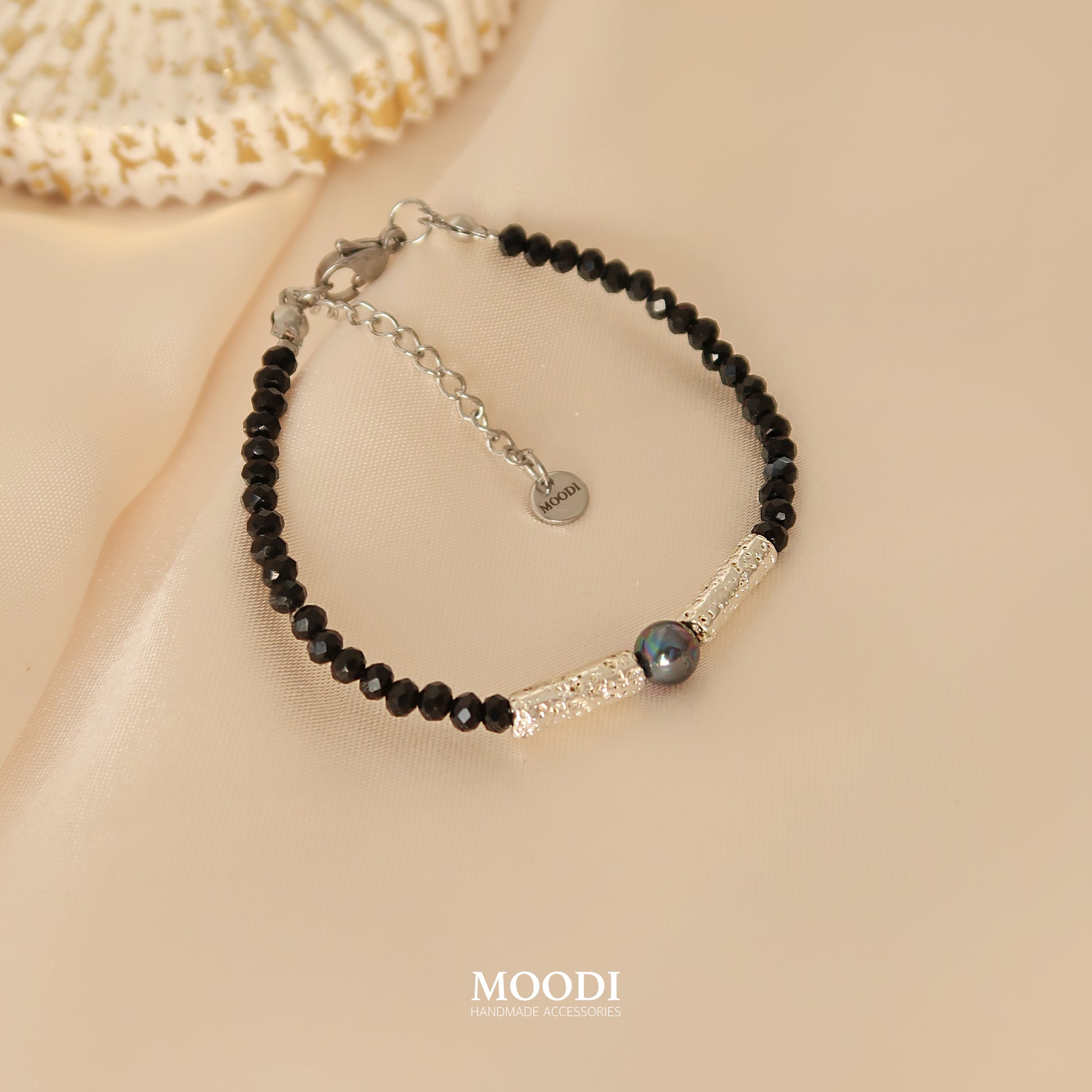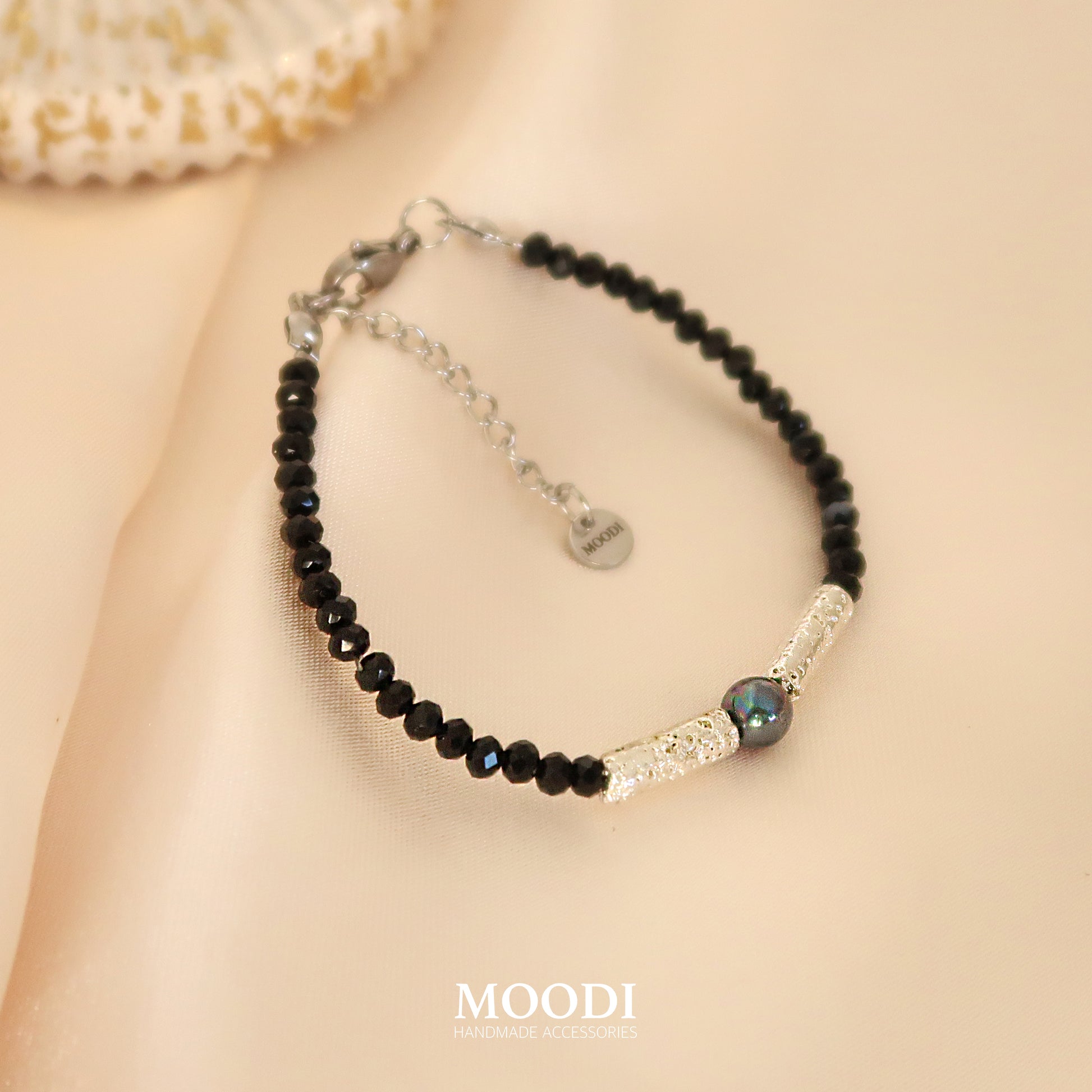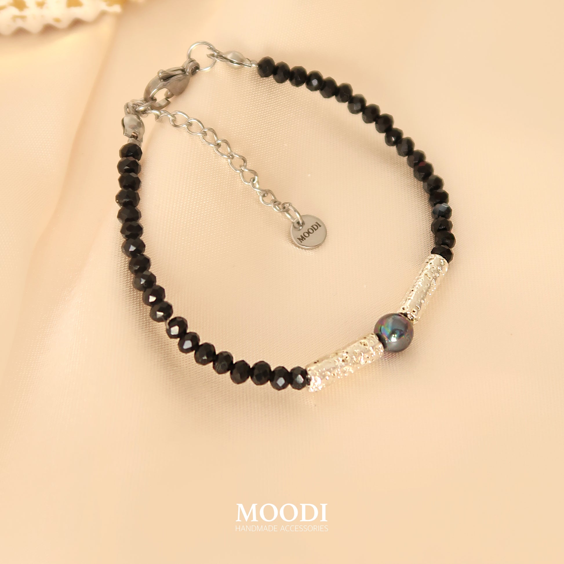 - Материал: Естествени камъни черен турмалин 3мм / продълговати мъниста с позлата / черен седеф / мъниста и закопчалки от медицинска стомана