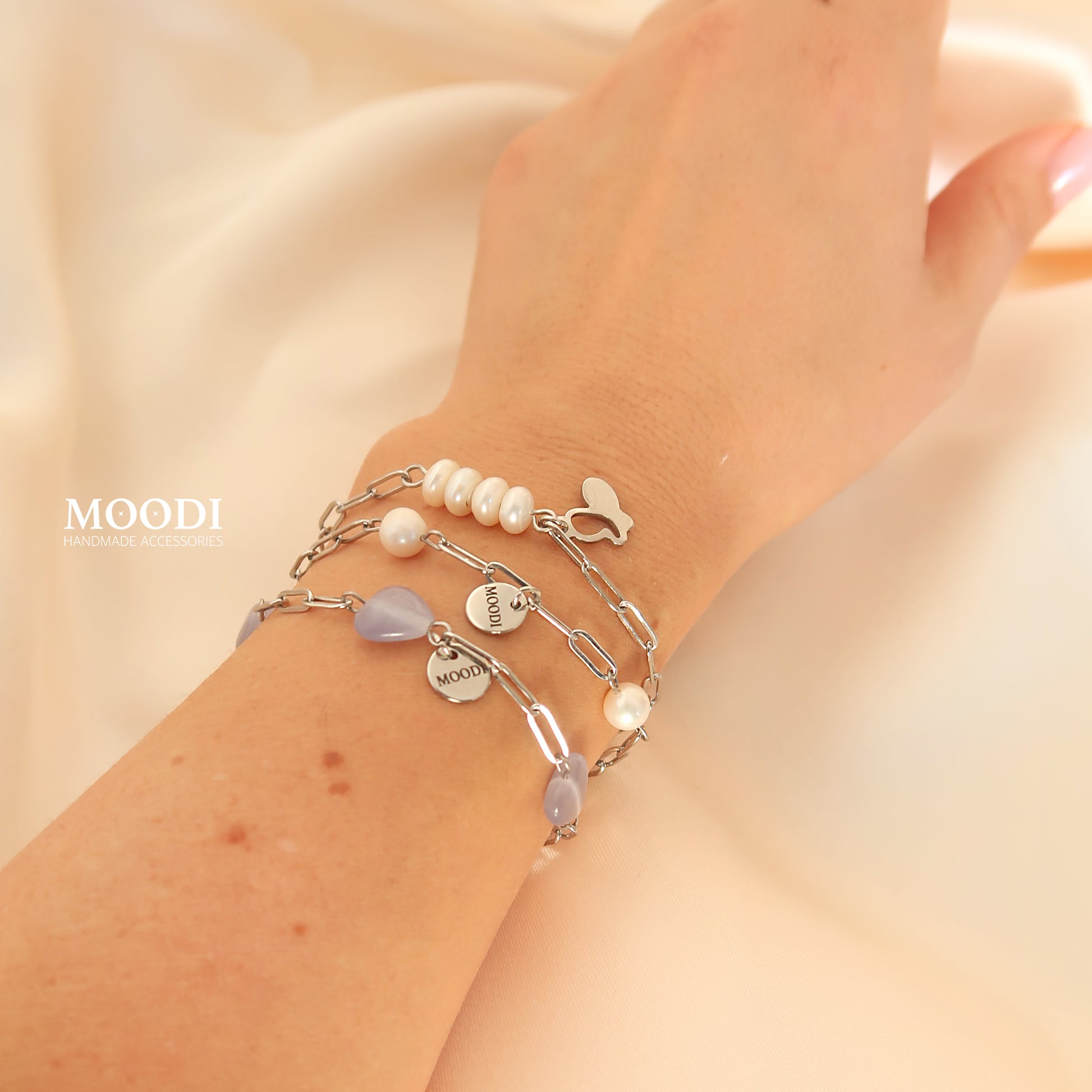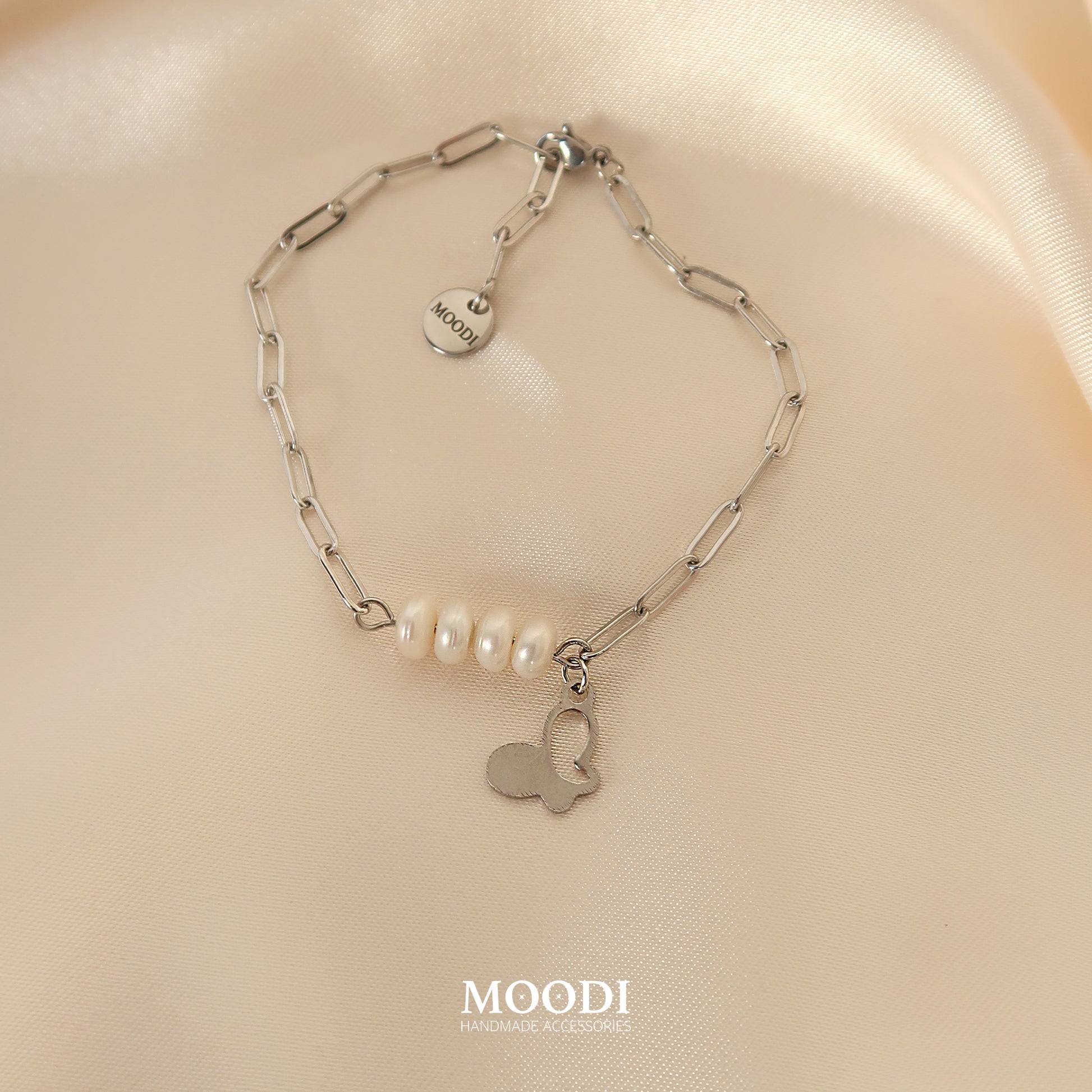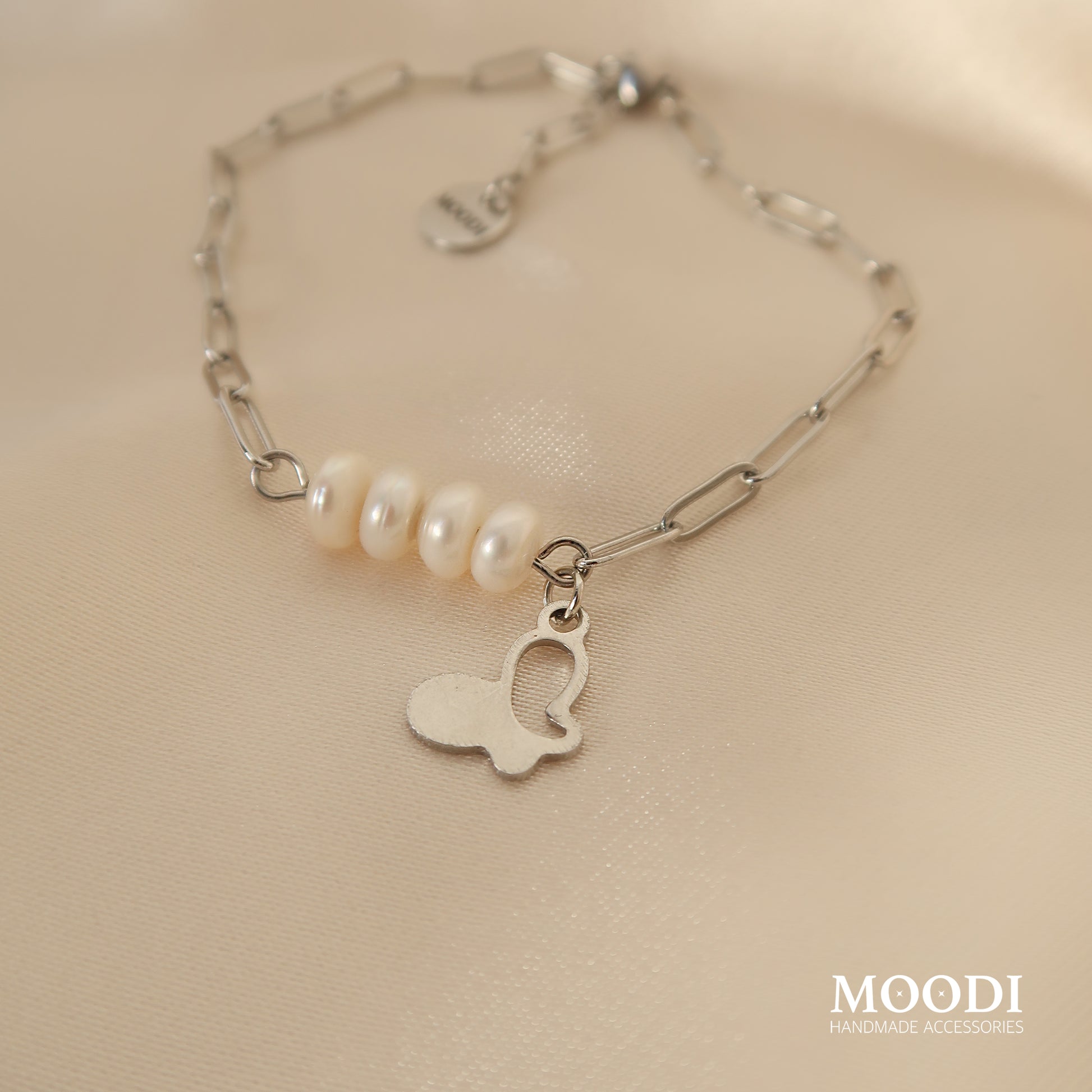 Гривна от посребрена стомана - клас 316L/ Сплескани сладководни перли и висулка пеперуда