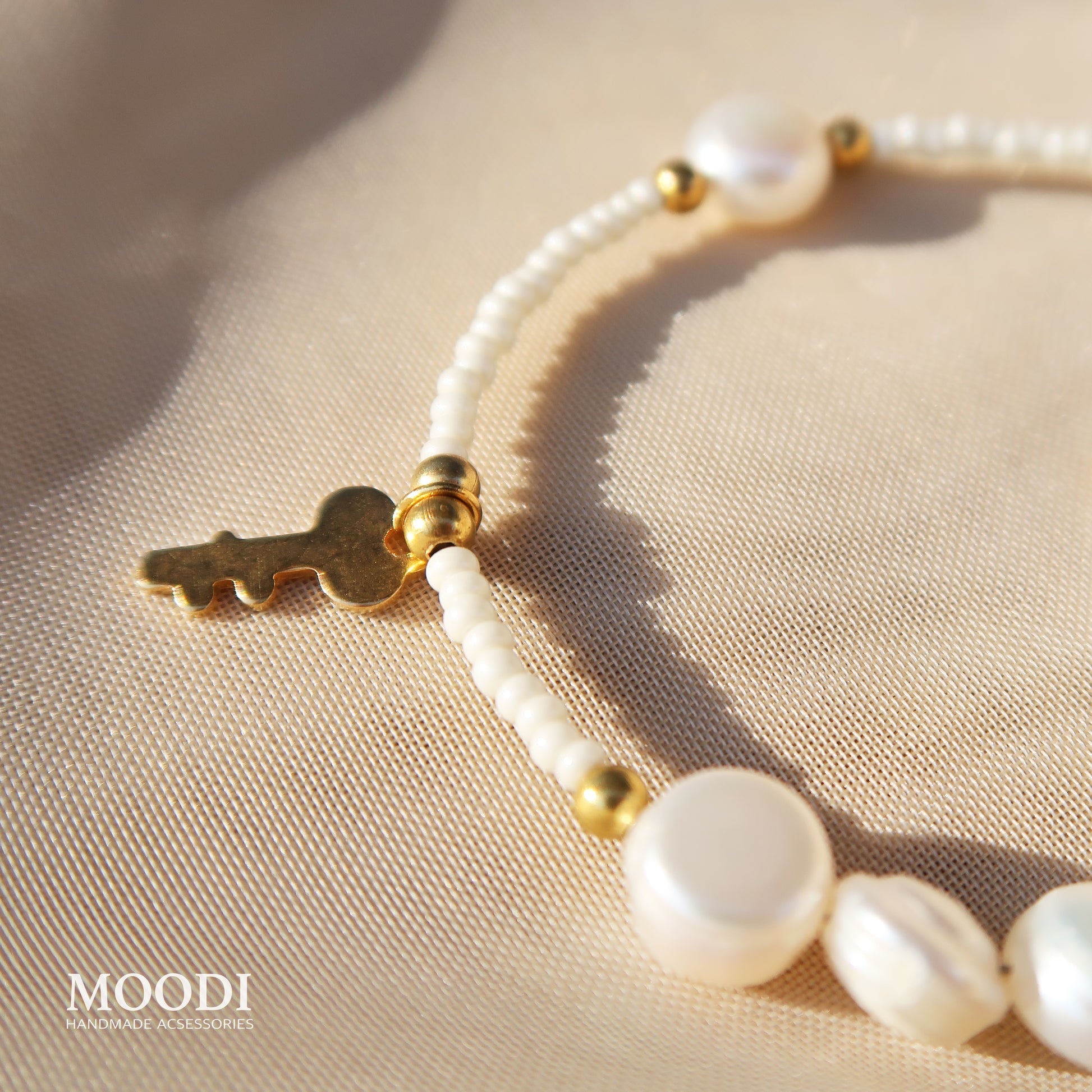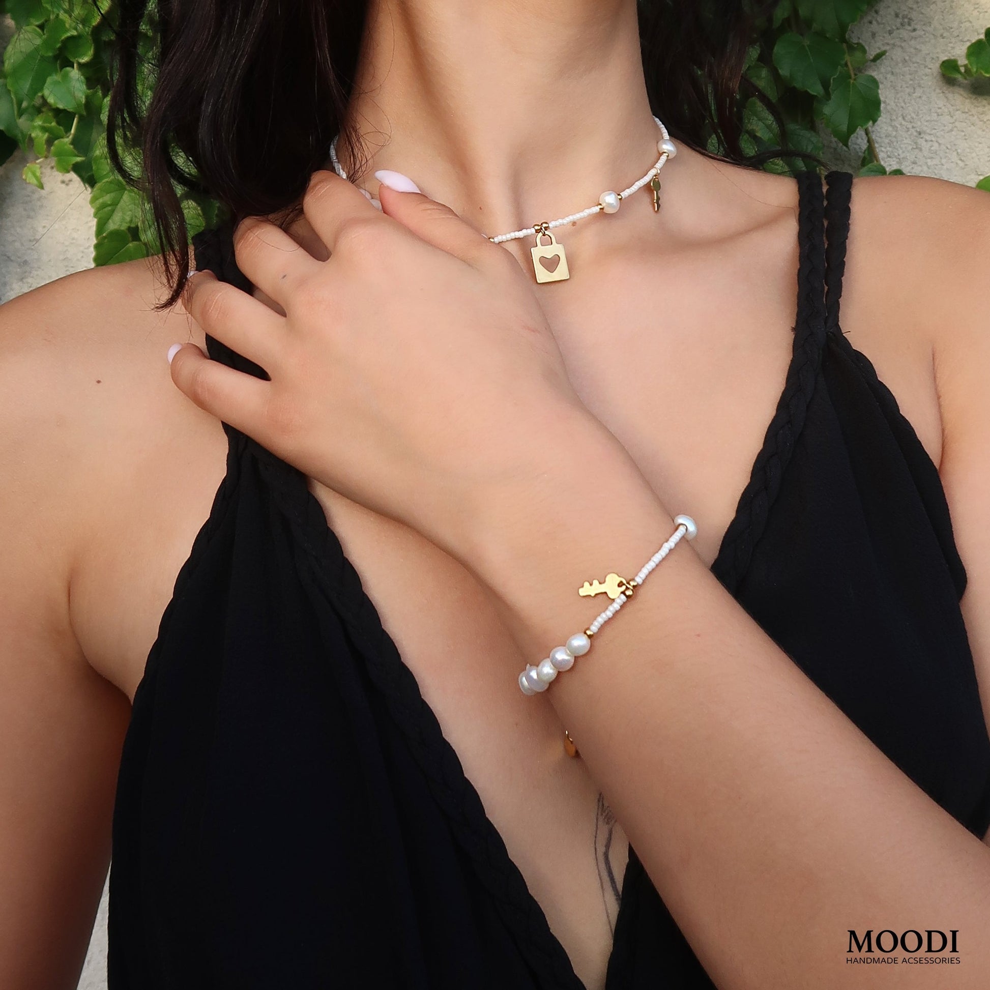 - Материал: Естествени сладководни перли / стоманени мъниста / Стоманена висулка ключе / ситни мъниста miuki / закопчалки от медицинска 316L стомана