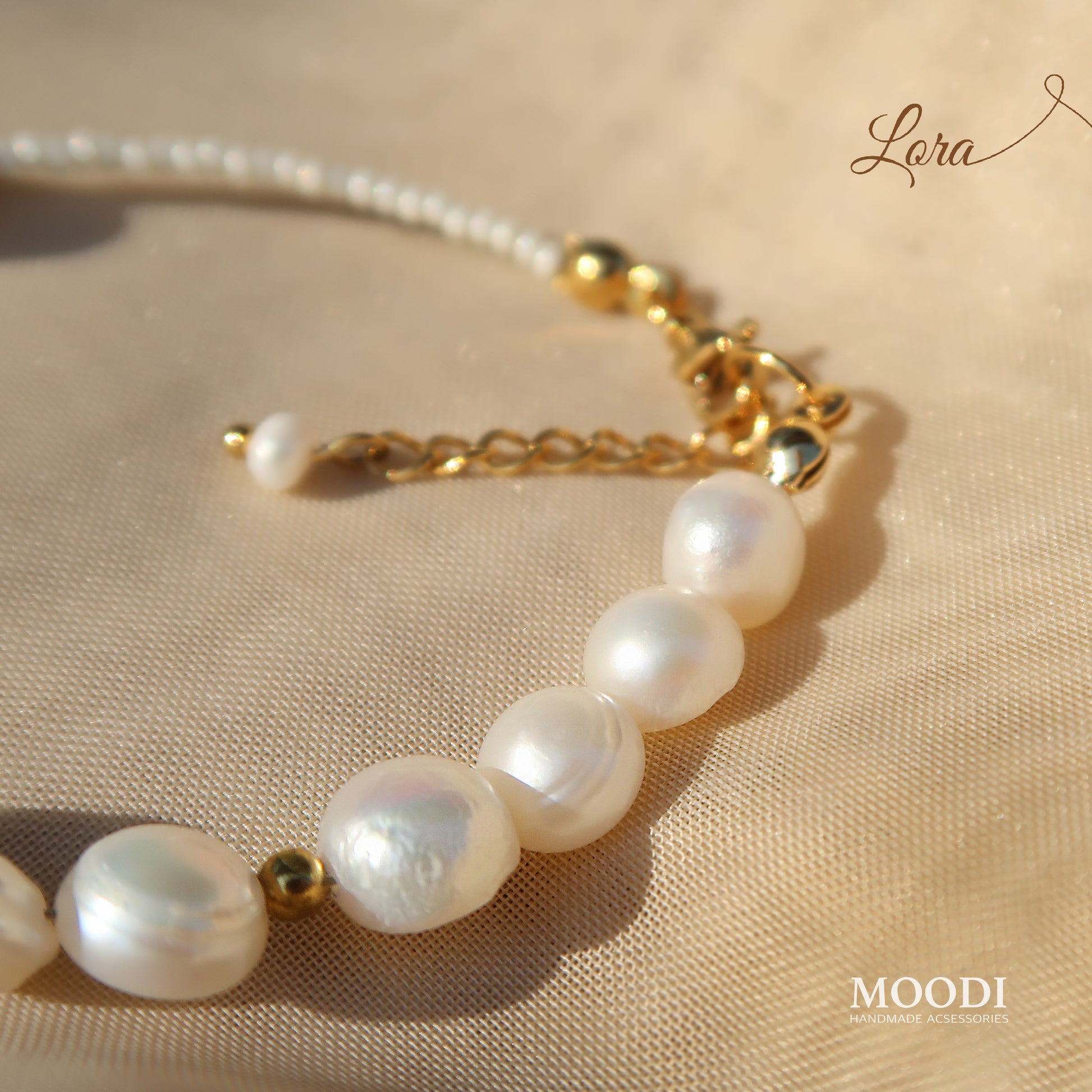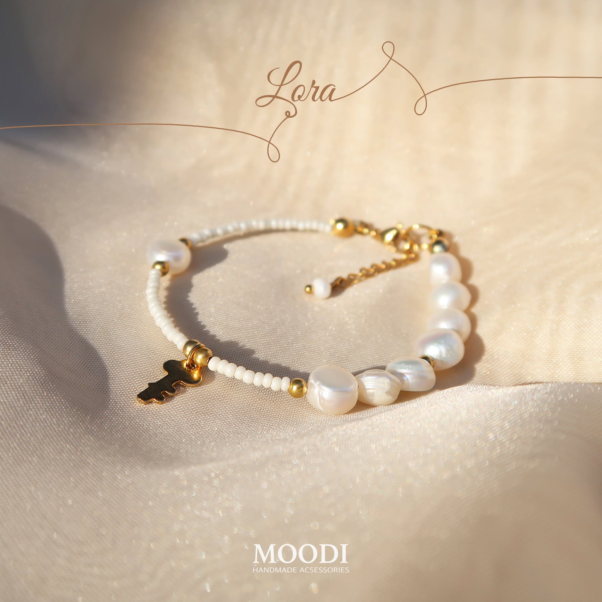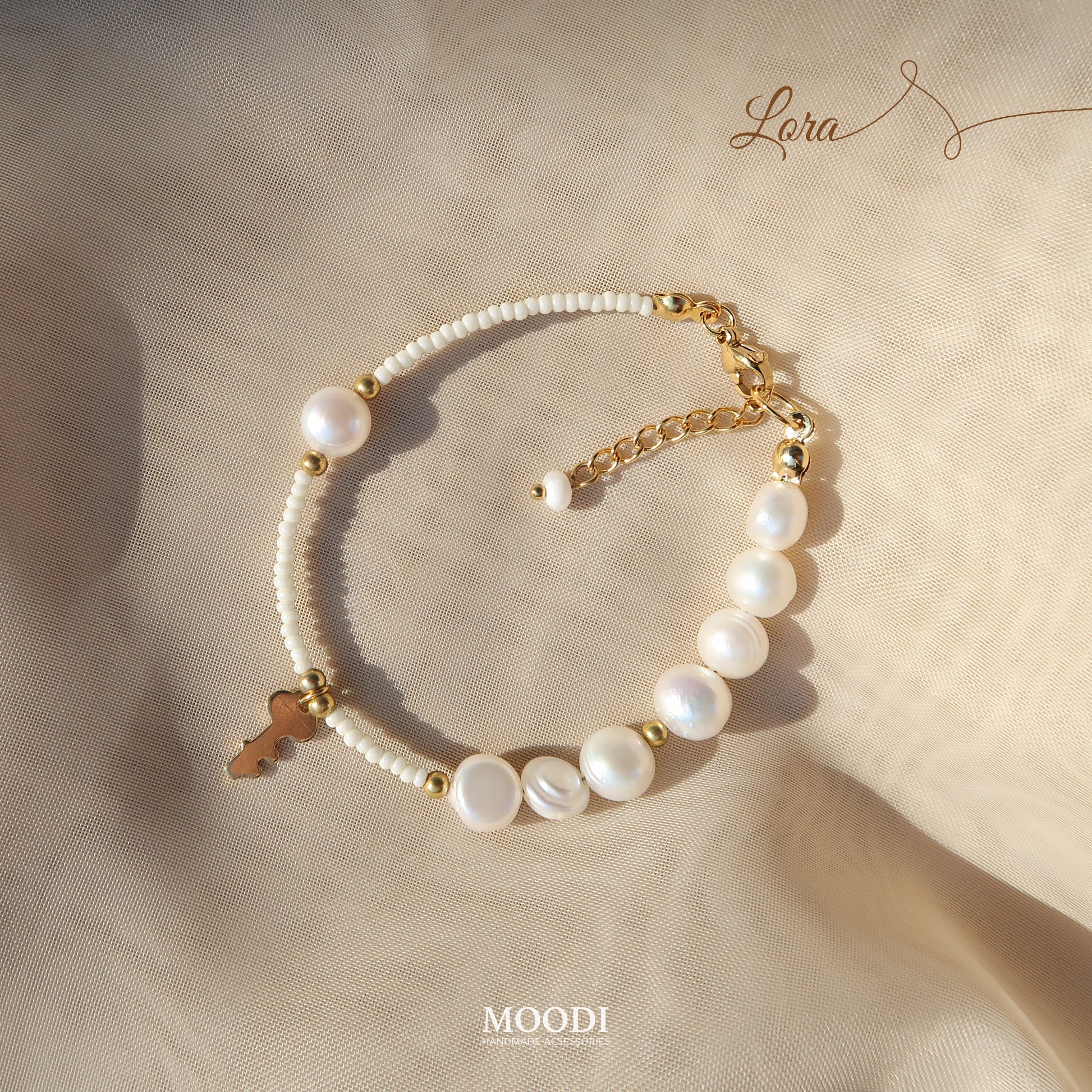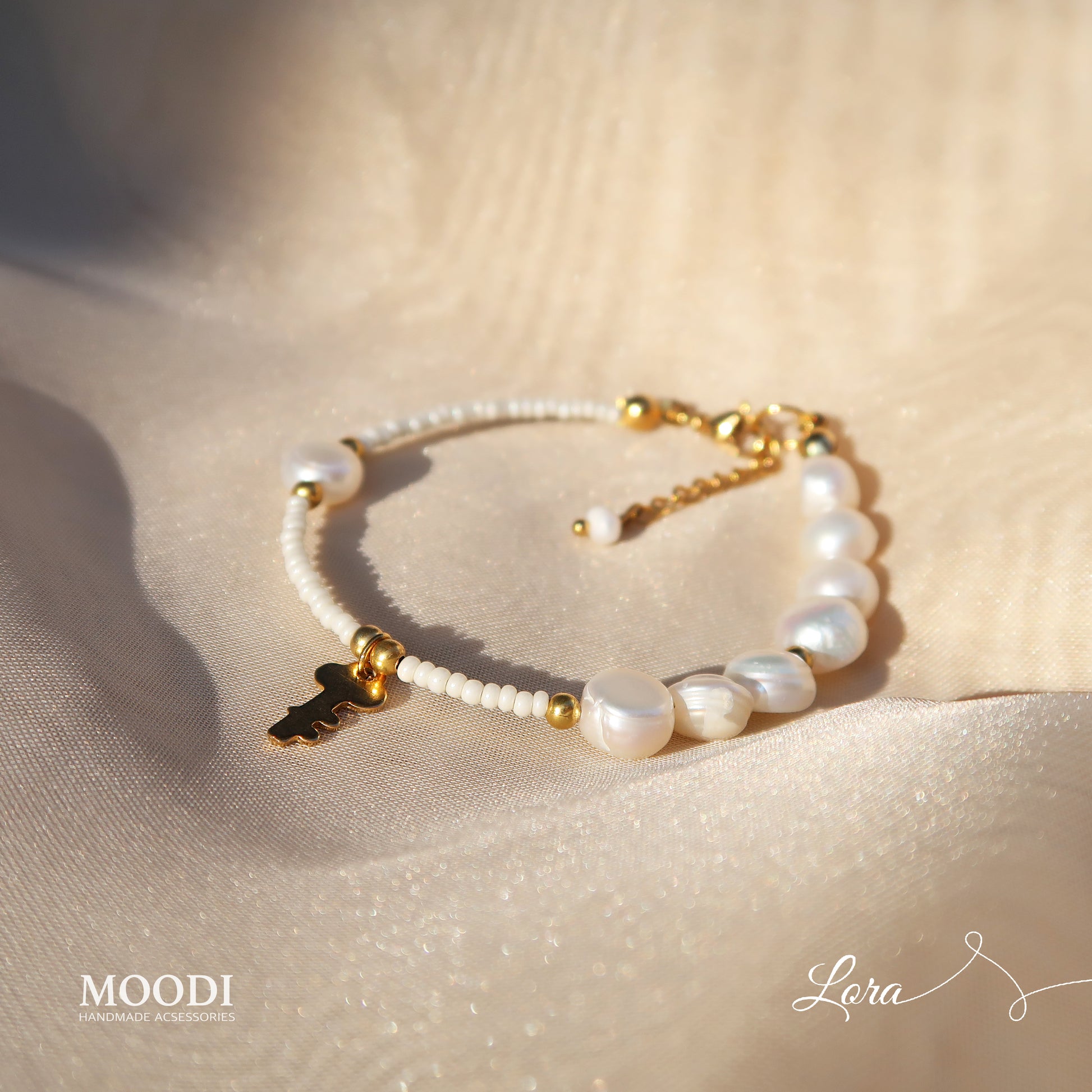 Елегантна гривна "Lora" Key e с нестандартна асиметрична форма. Тя е от перлената колекция "Lora" и е с качествени естествени сладководни перли.