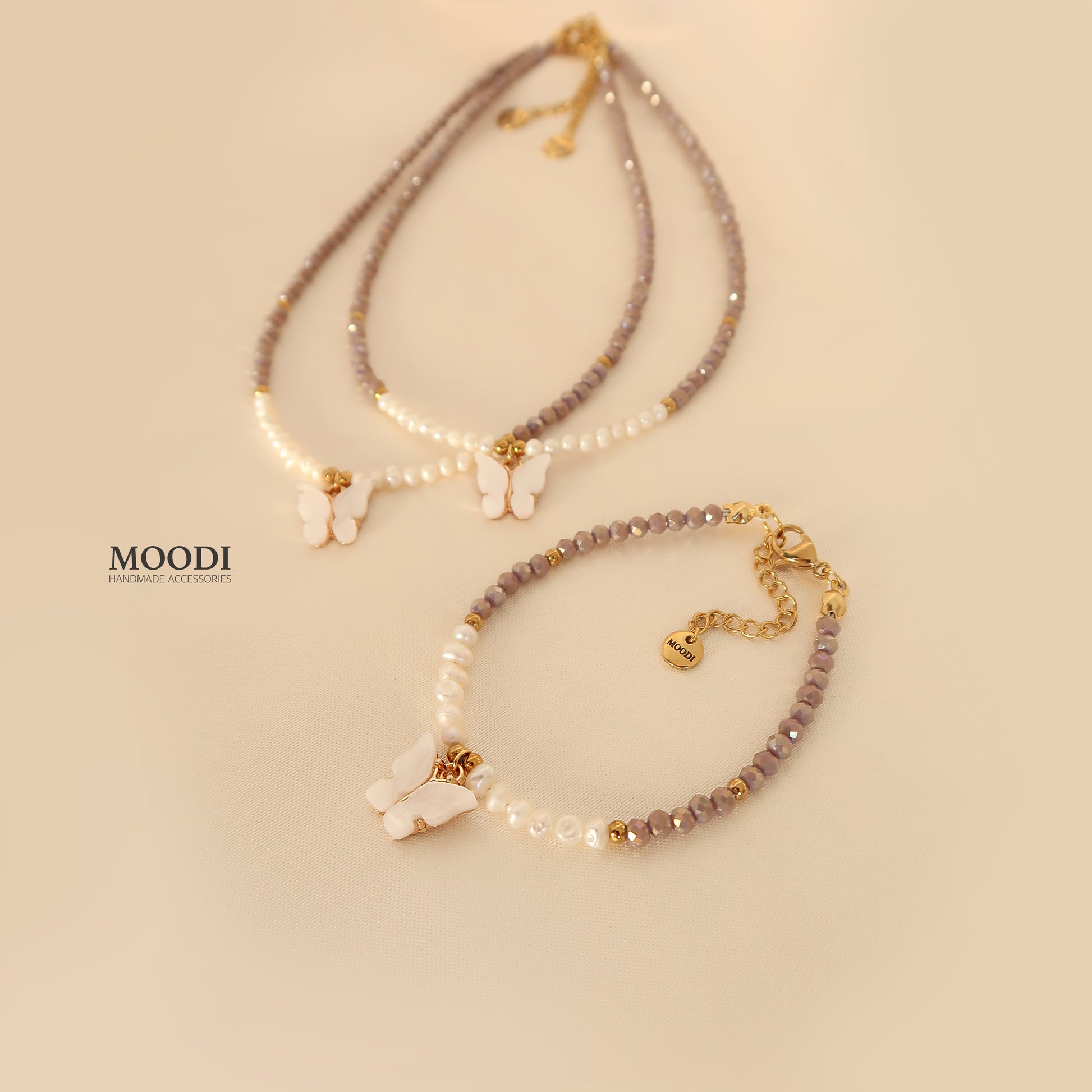 - стъклени мъниста / позлатени с 18к злато стоманени мъниста / Пеперуда бяла от седеф