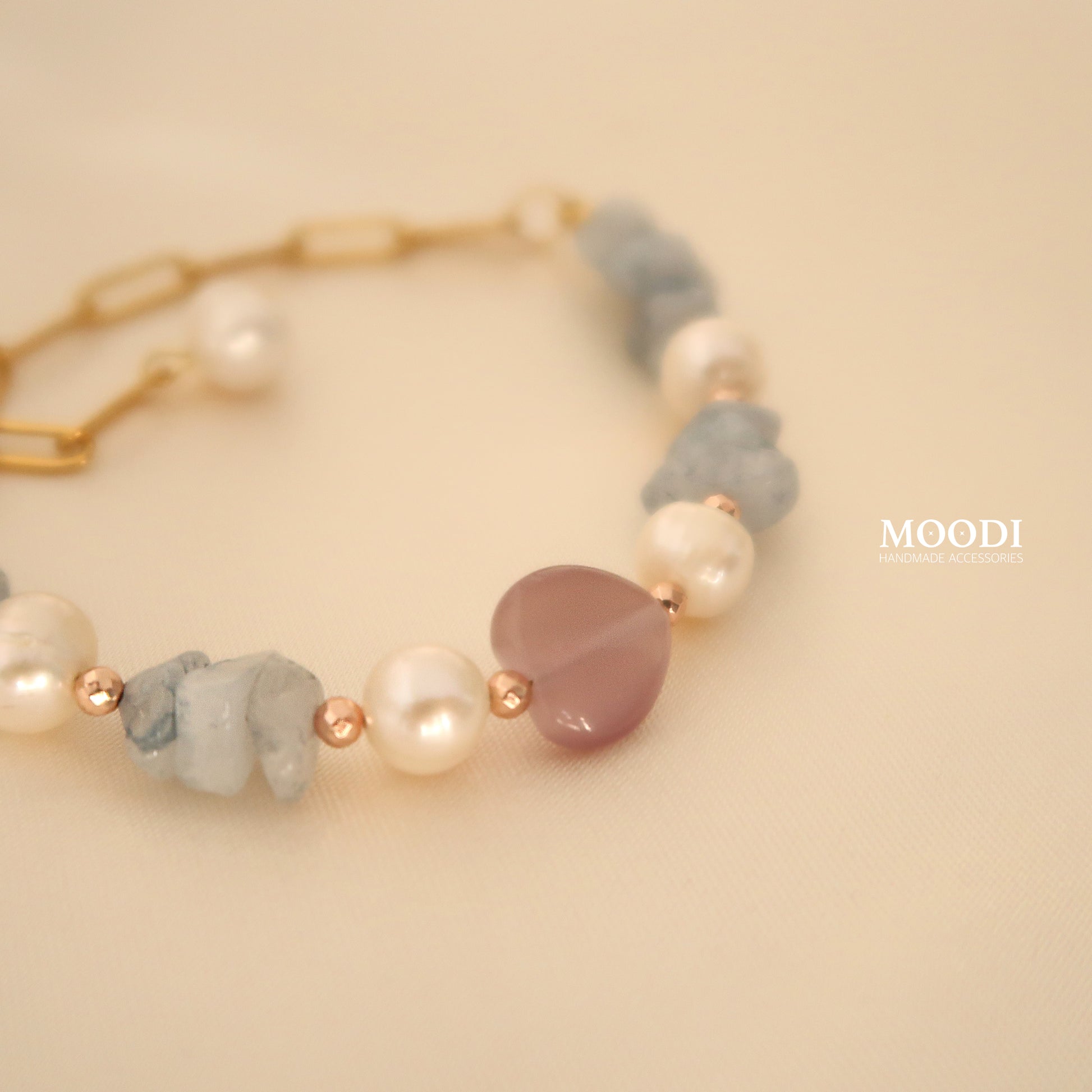 Гривна от Аквамарин, Естествени перли, Сърца от естествени камъни в лилаво котешко око, мъниста хематит и ицяло от неръждаема посребрена стомана верига.