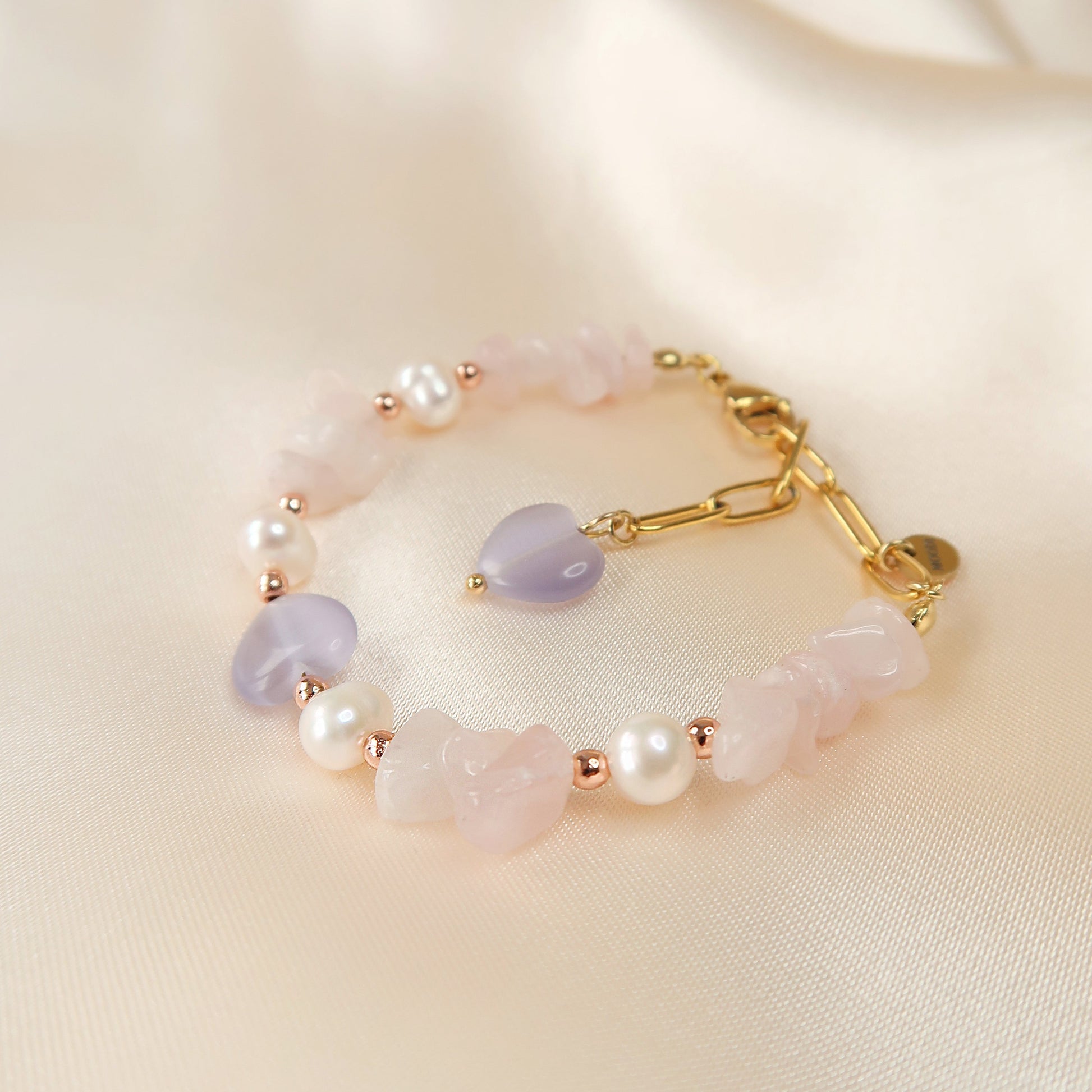Гривна от розов кварц, Естествени перли, Сърца от лилаво котешко око, мъниста хематит и ицяло от неръждаема мецизинска стомана.