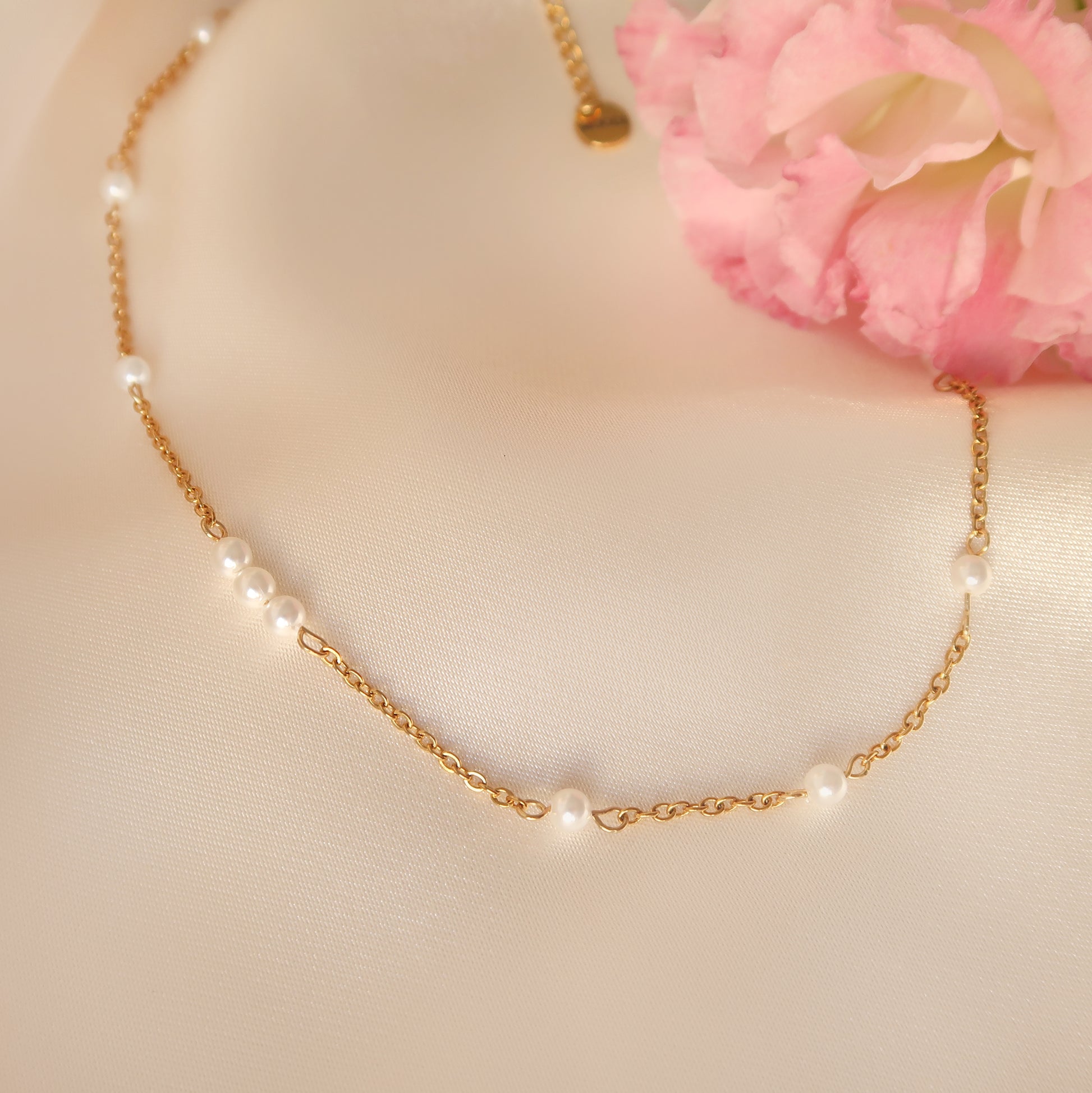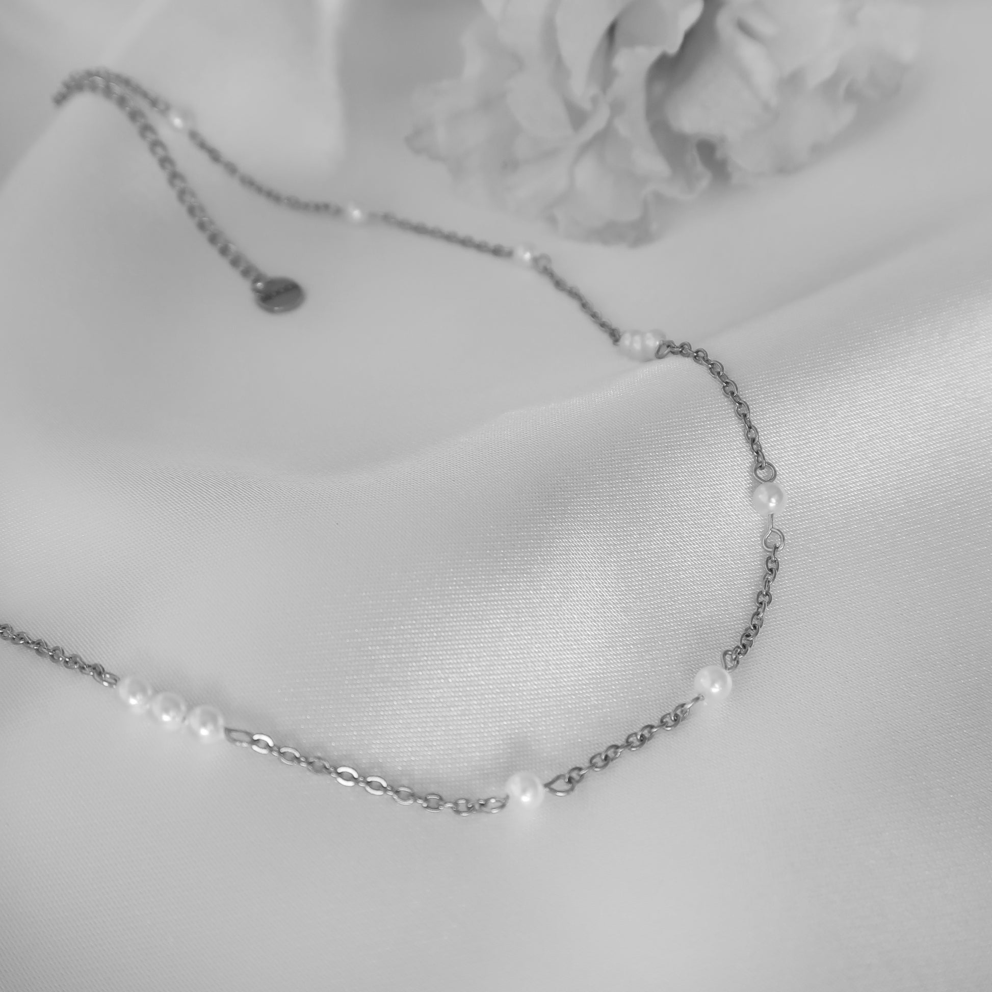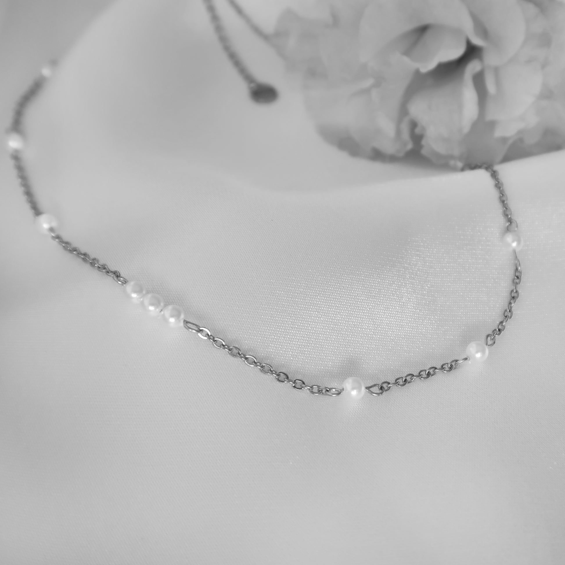 - Материал: Перлено колие с малки стъклени перли на стоманена верижка