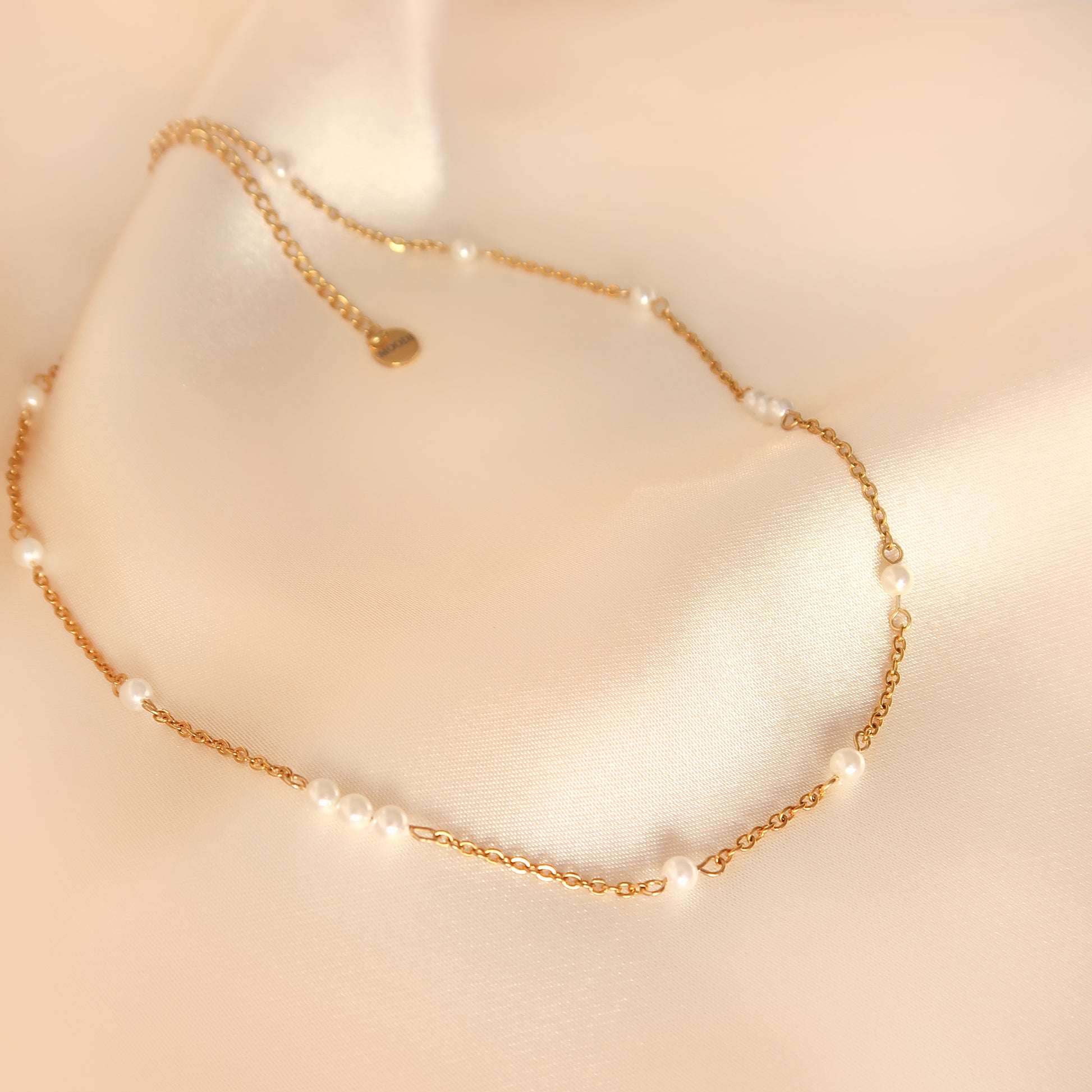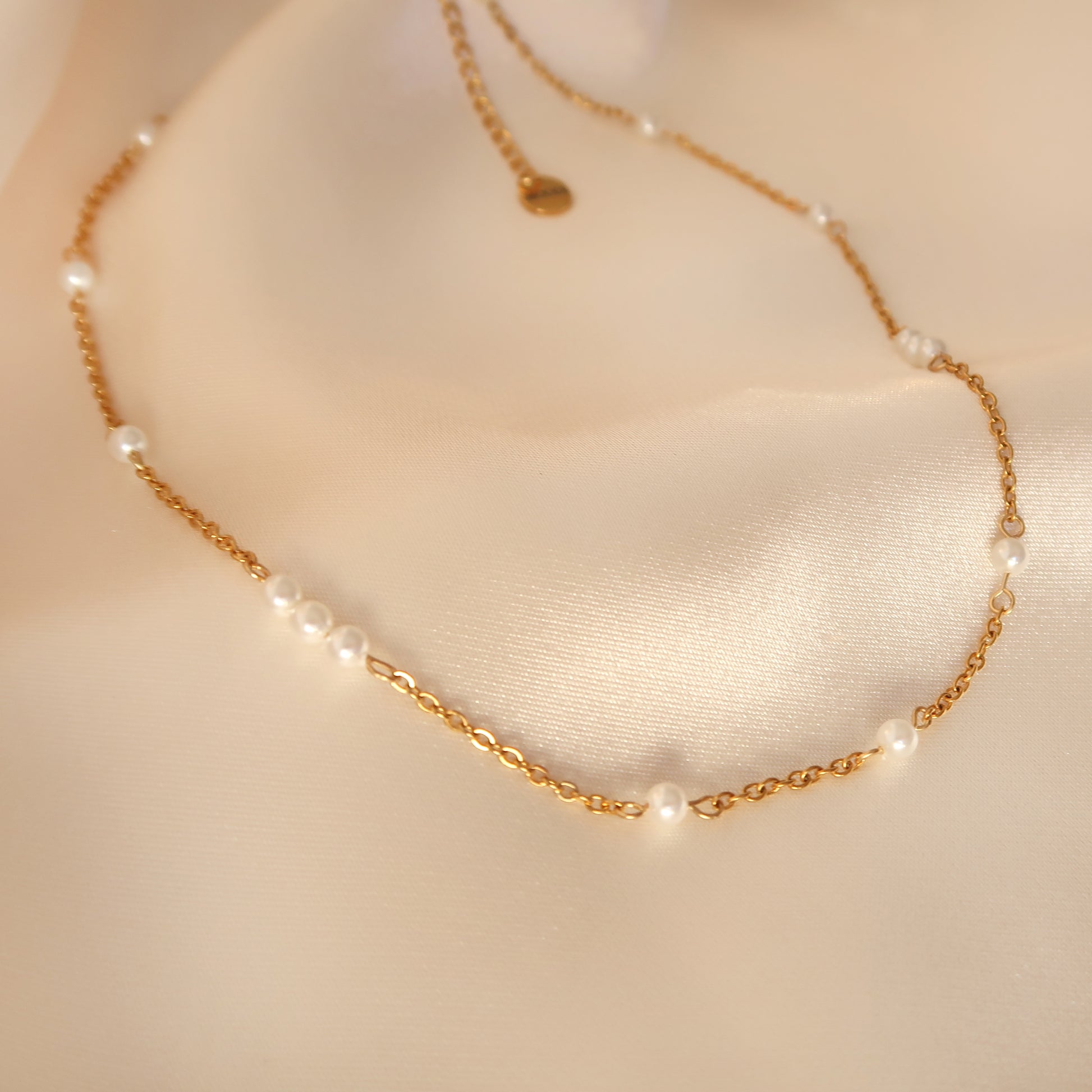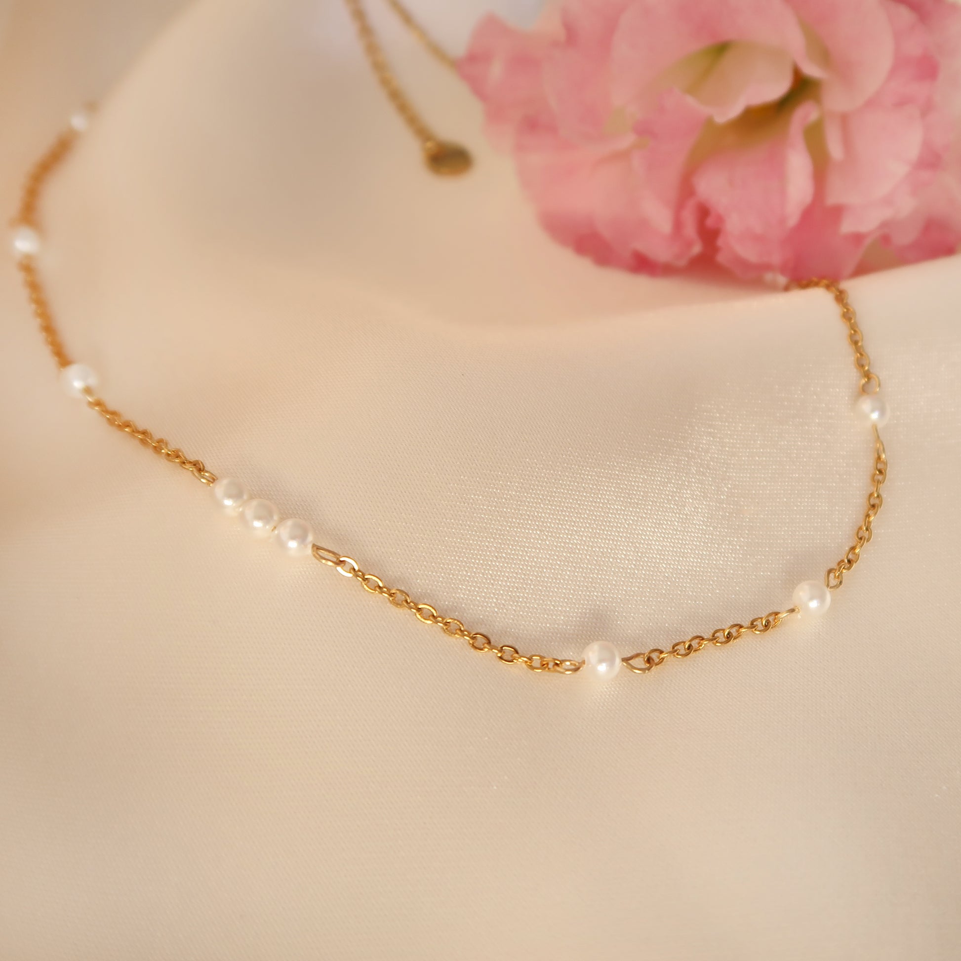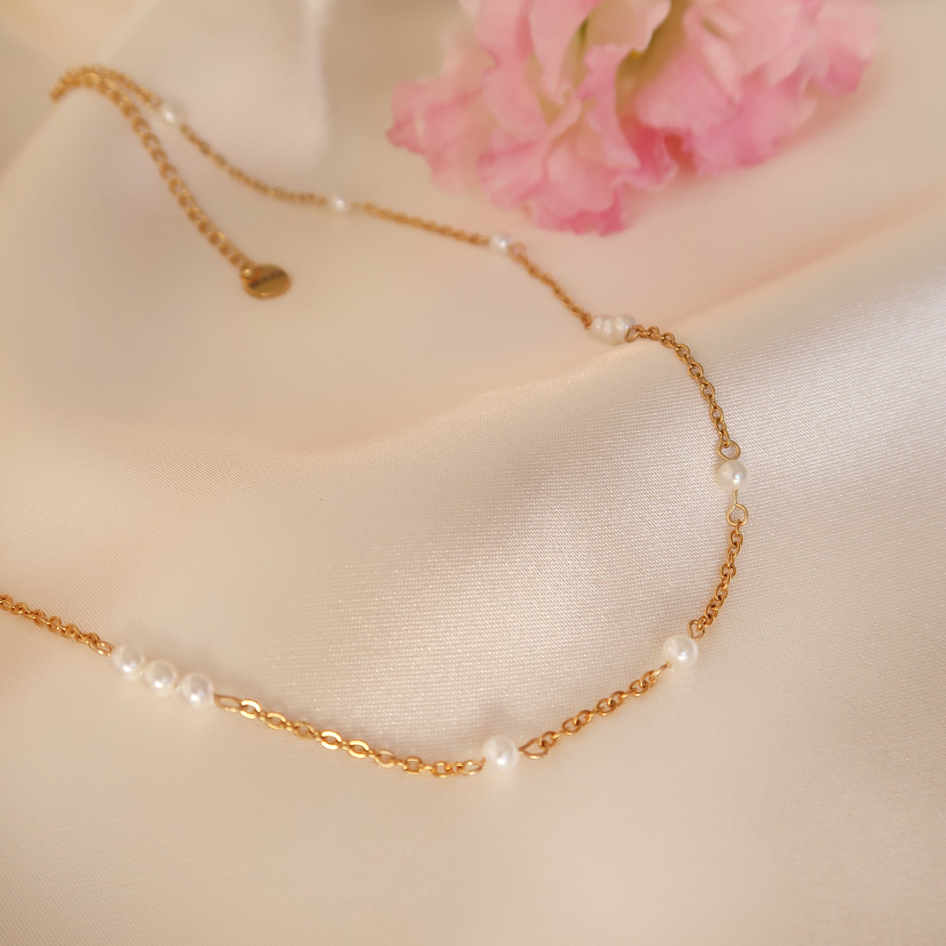 - Материал: Перлено колие с малки стъклени перли на стоманена верижка