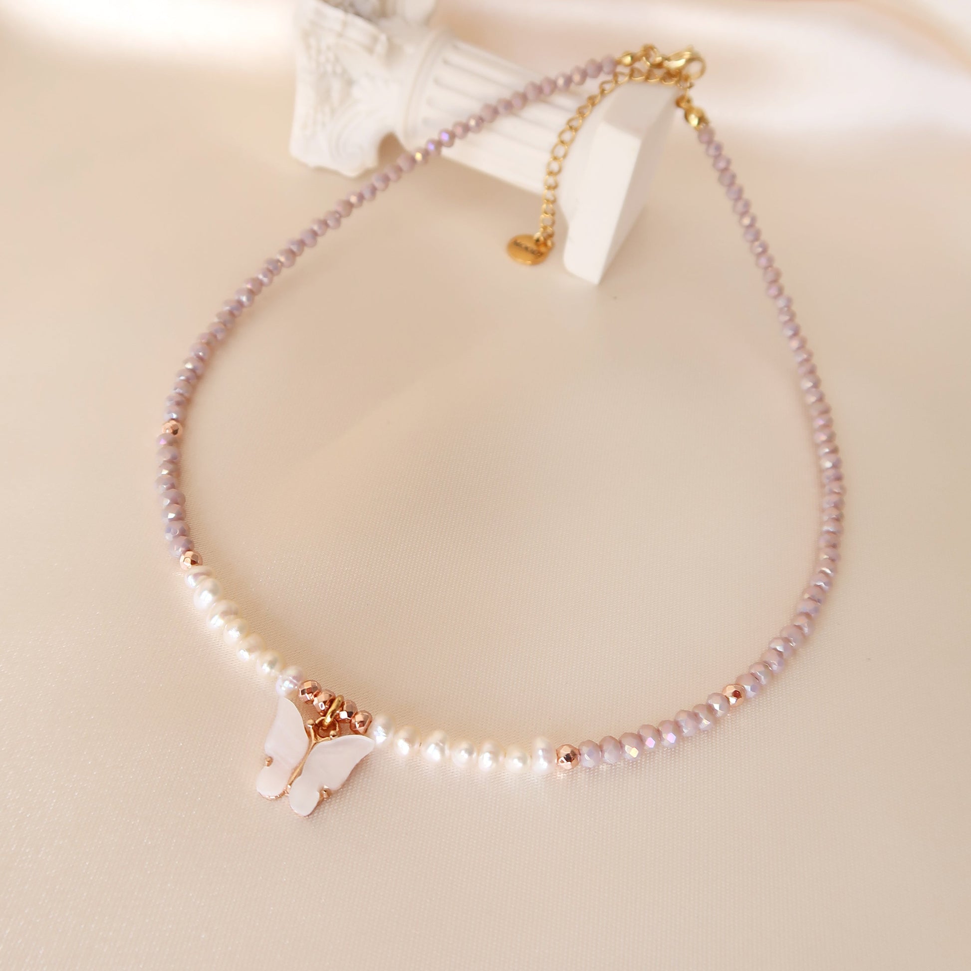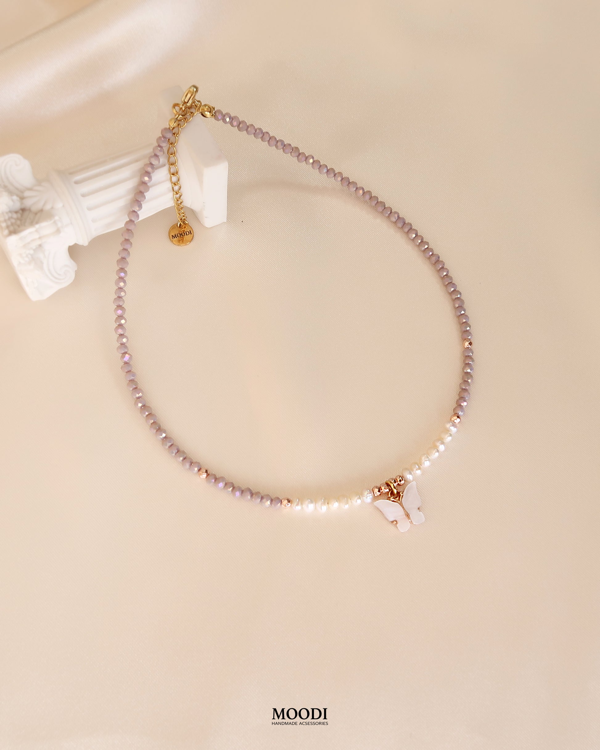 Нежно колие тип чокър в цвят пепел от рози "Reni" е от серия Butterfly ще ви впечатли с елегантно и нежно излъчване със седефен блясък.