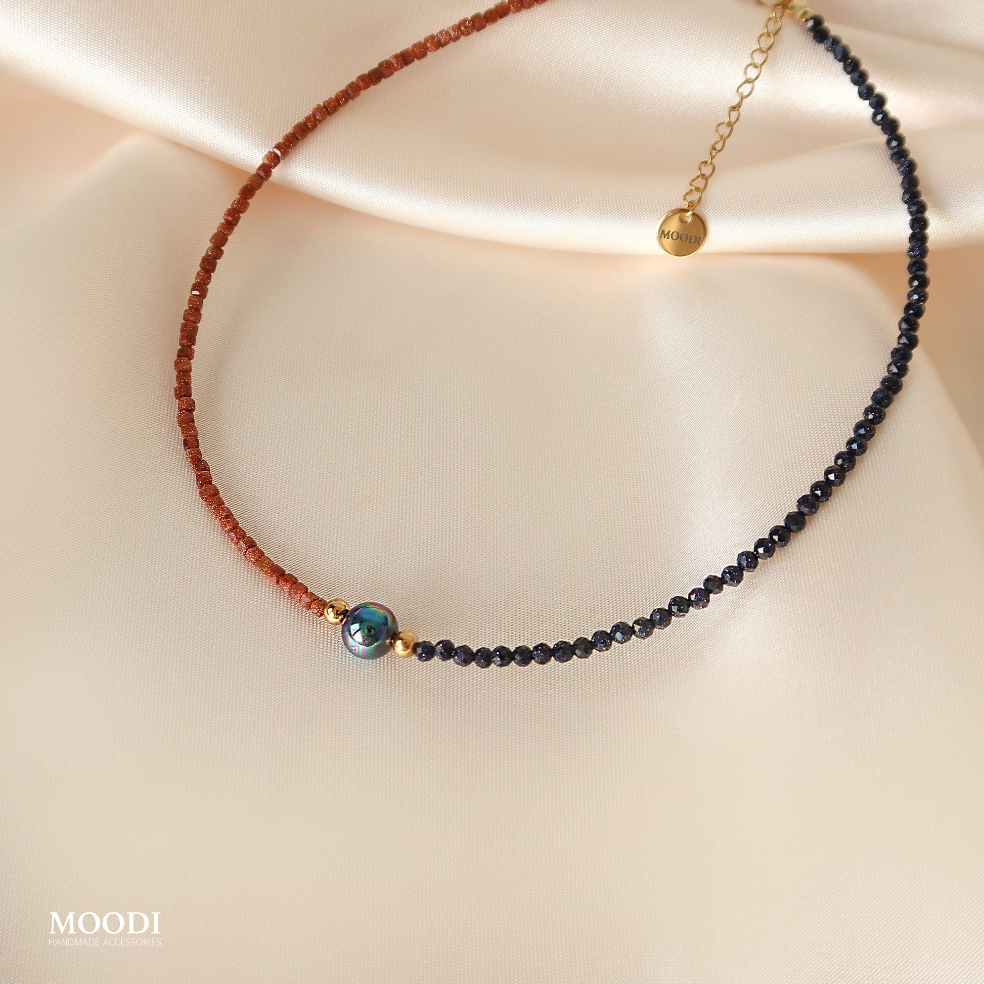 Комбинацията от пясъчен слънчев камък и син слънчев камък е като среща между деня и нощта – златисти искри и тъмносини отблясъци, които танцуват заедно в хармония.