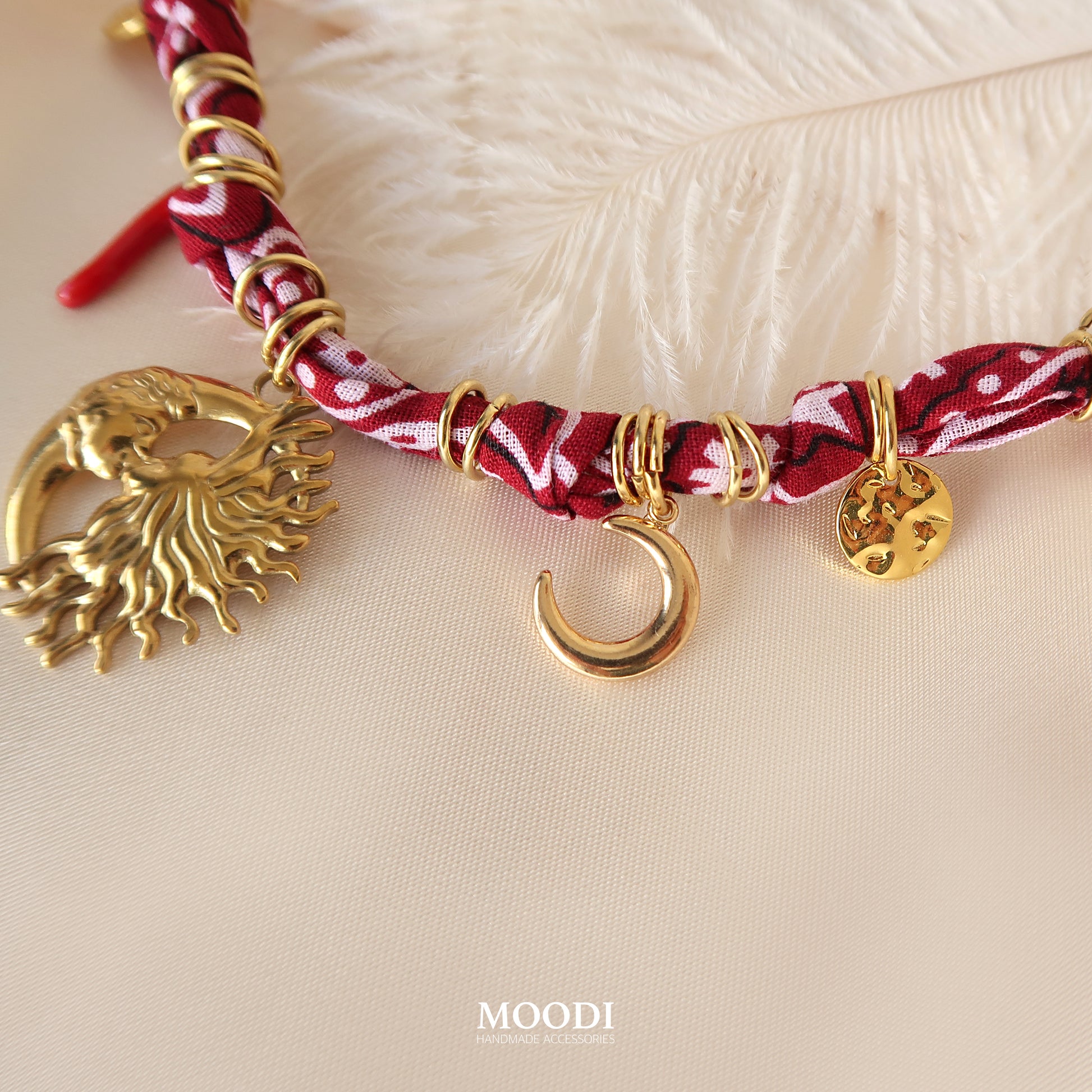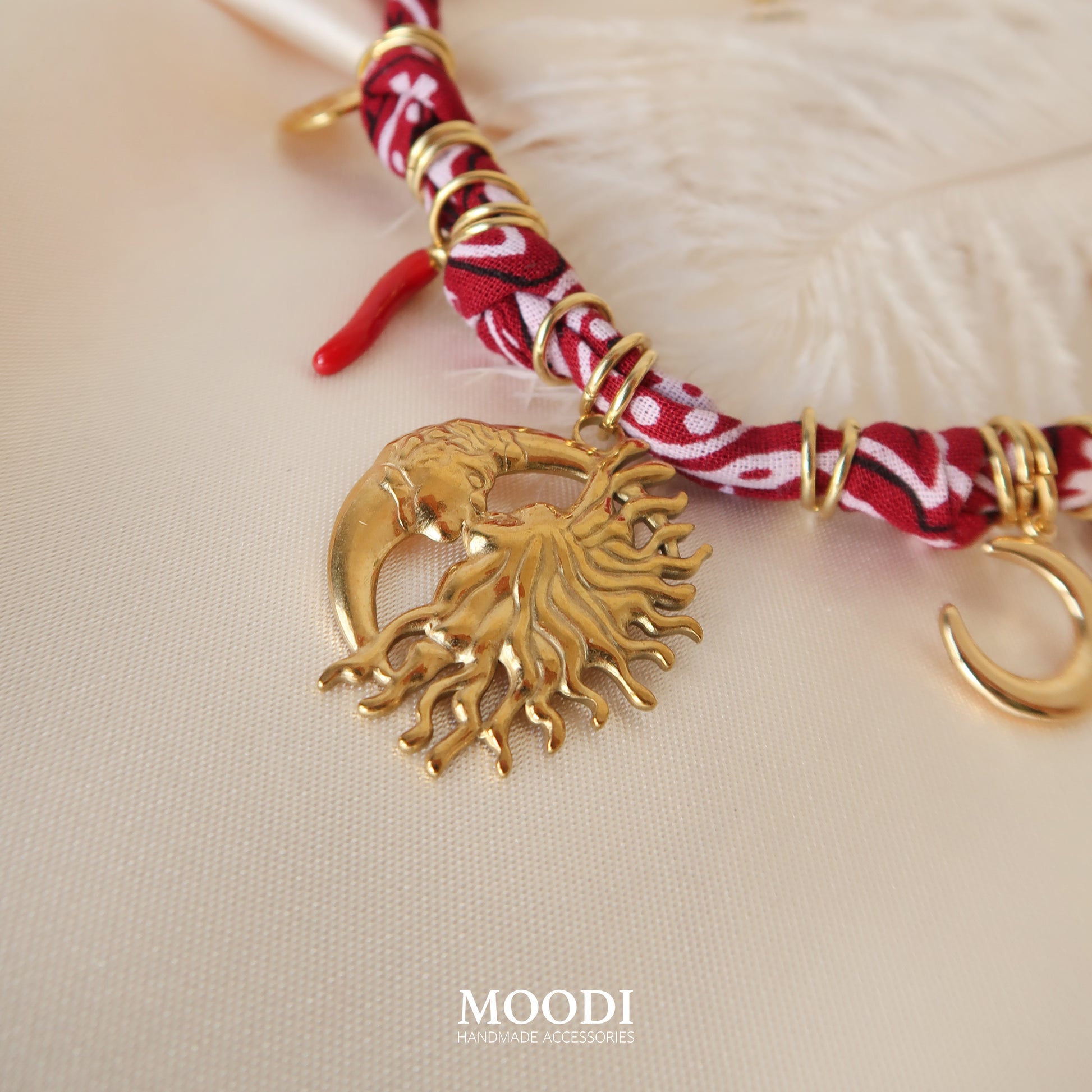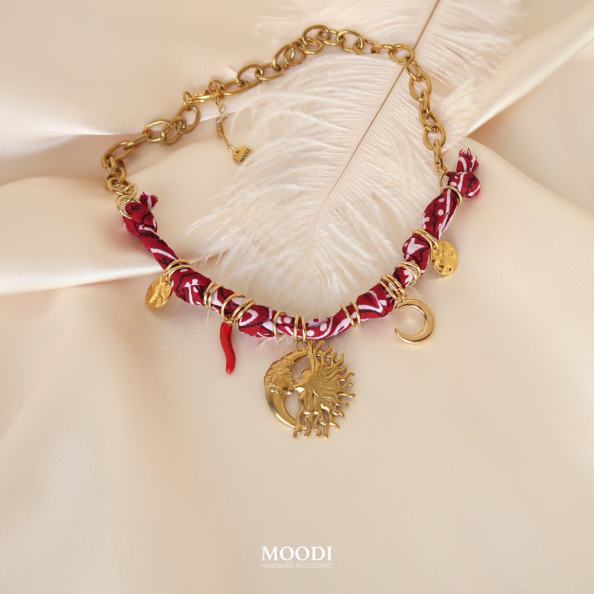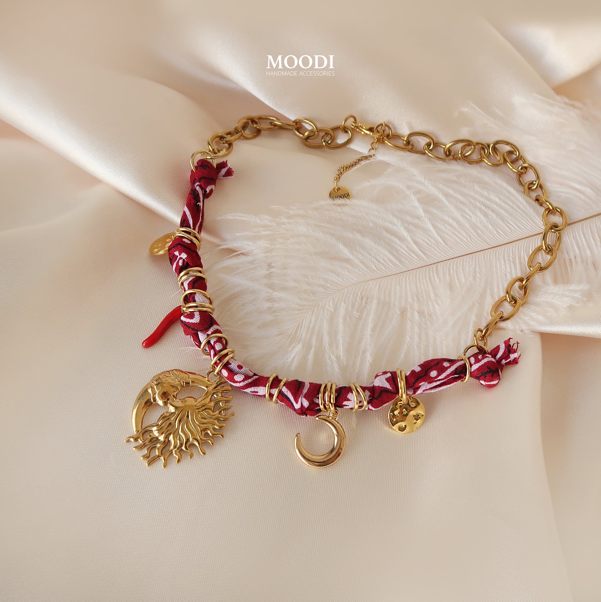 Това колие е съчетание от златист блясък, червен плат с етно мотив и символи на силата – слънце, луна, амулети и талисмани. Всяка висулка носи своята енергия – закрила, светлина и женствена магия.
