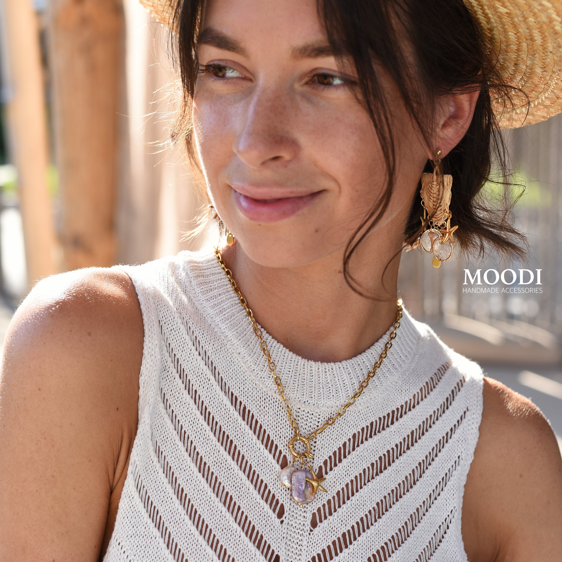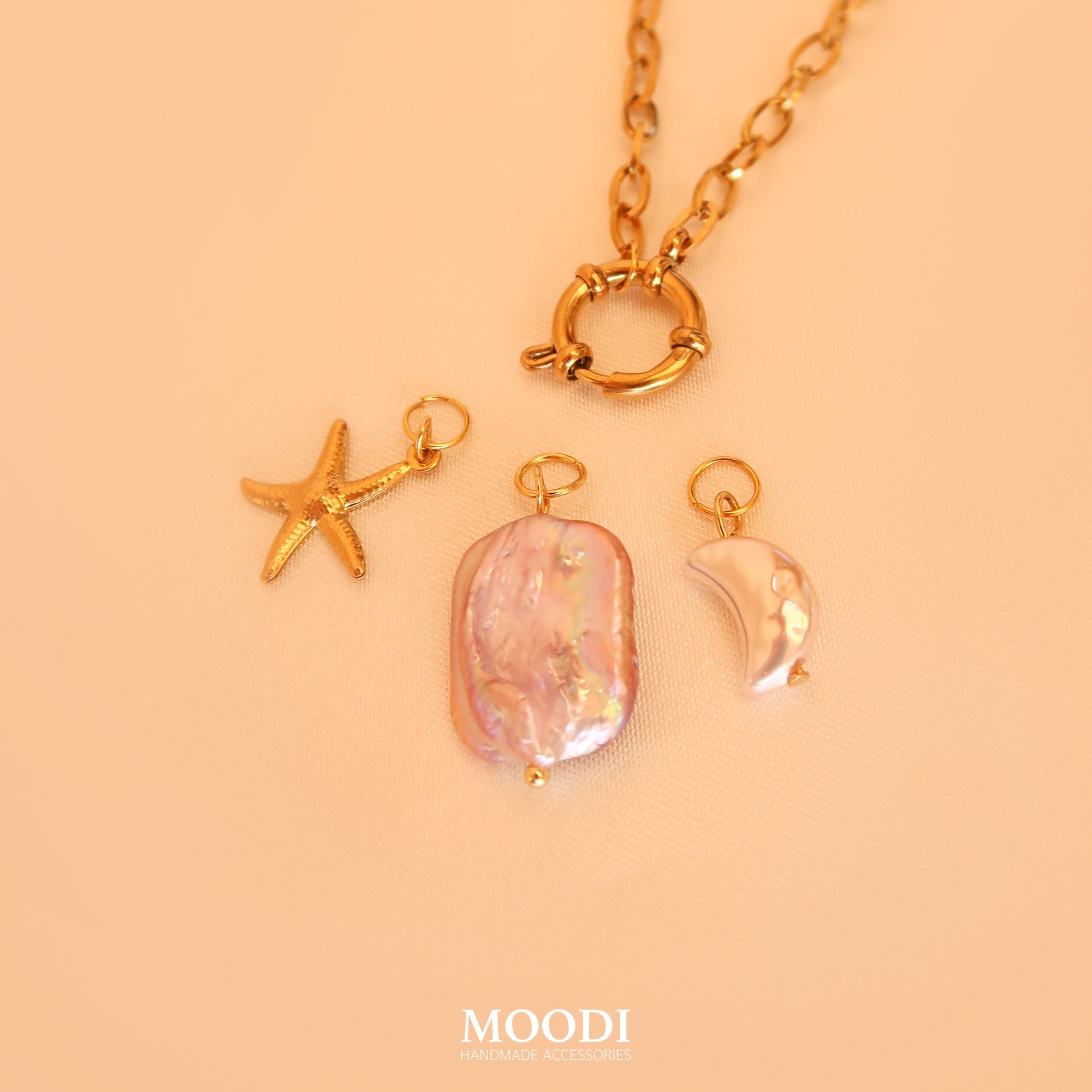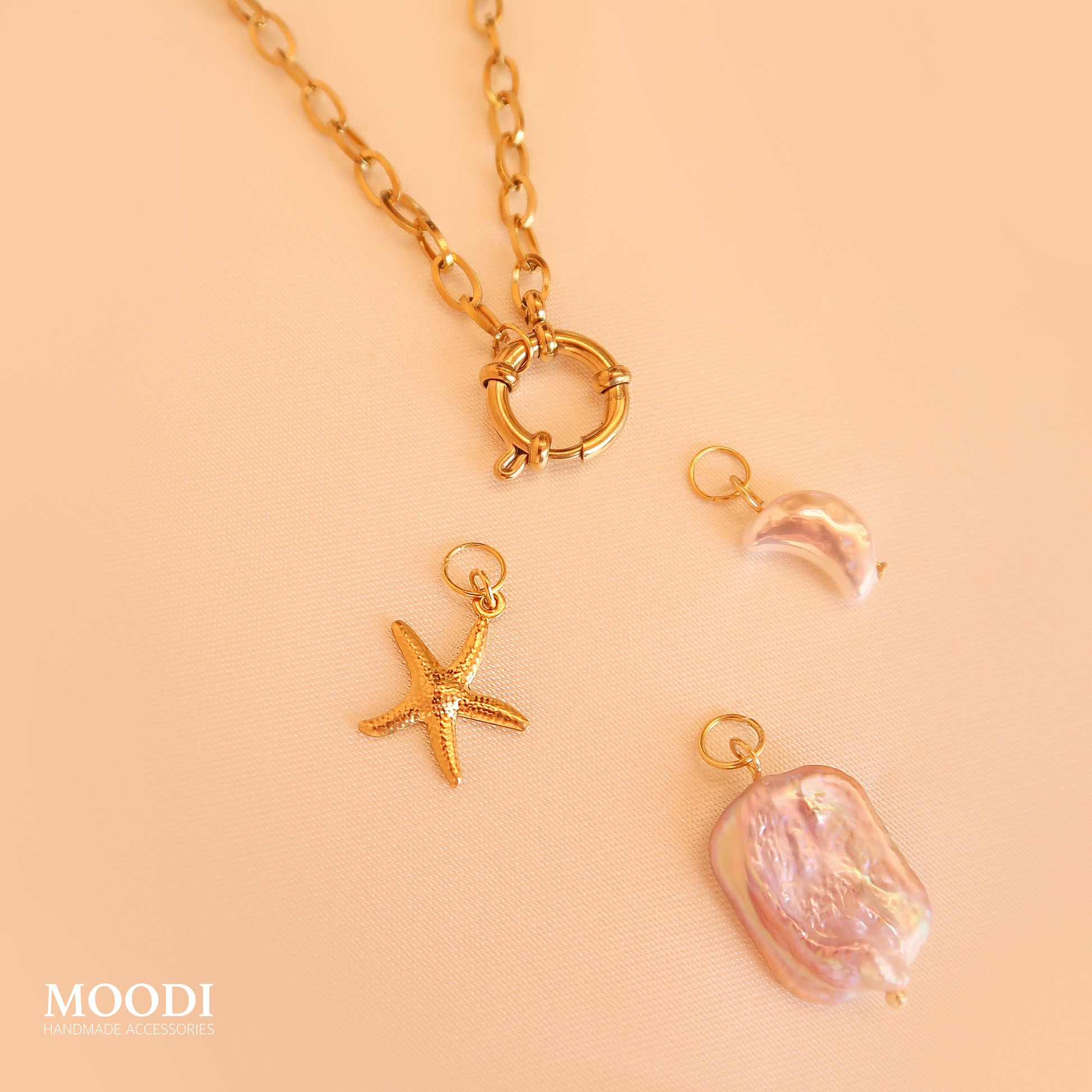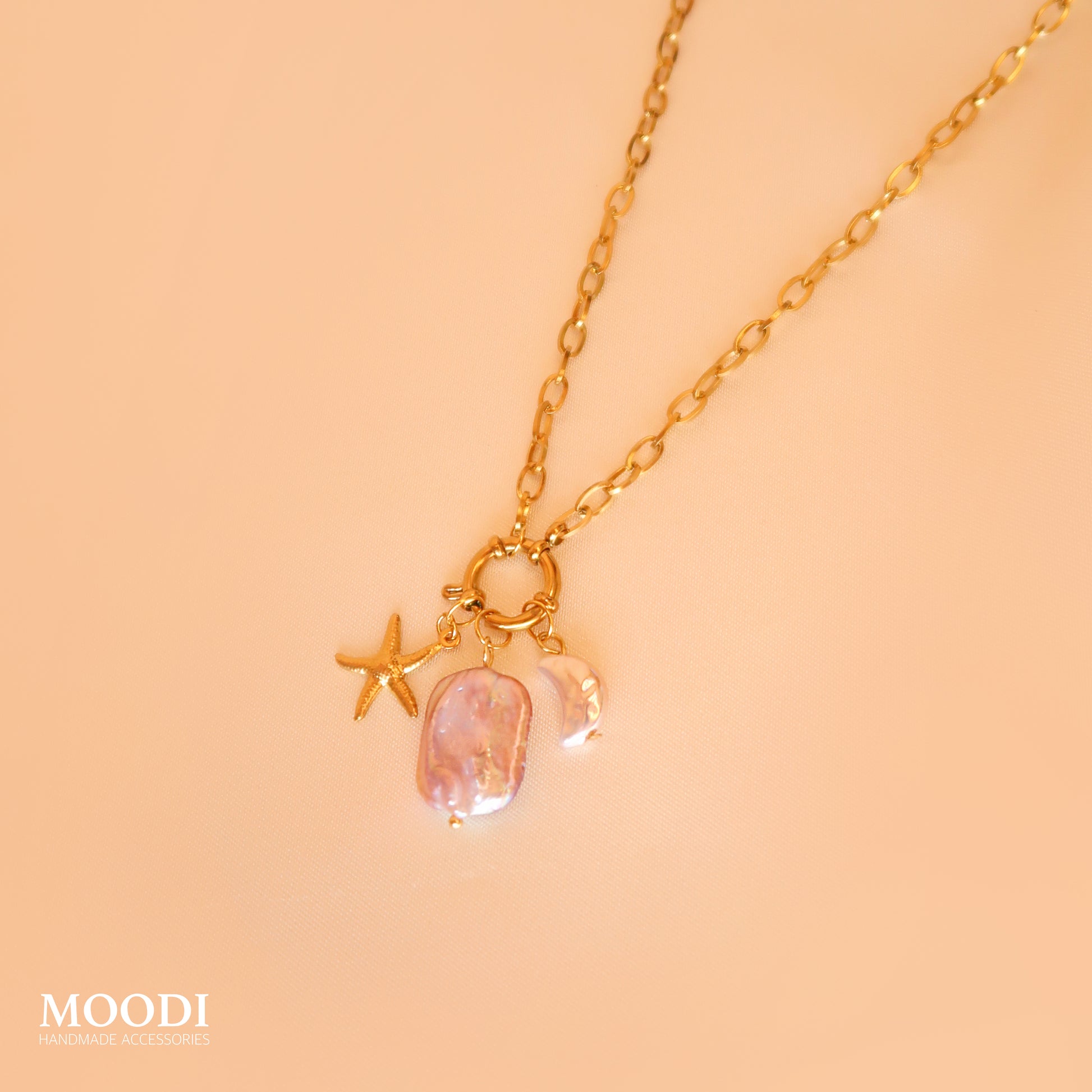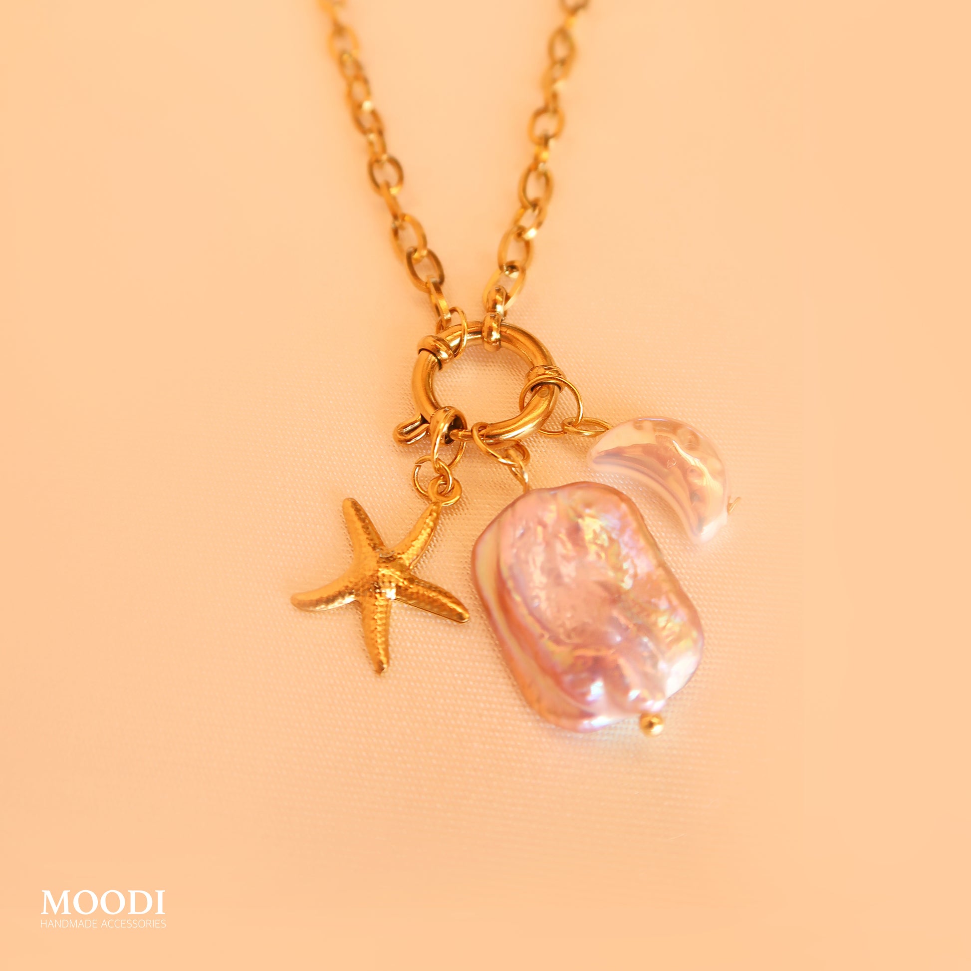 Материал: Колие тип верига от позлатена медицинска стомана / Висулка морска звезда със циркониеви камъни / Златиста мида / Висококачествена Барокова естествена перла