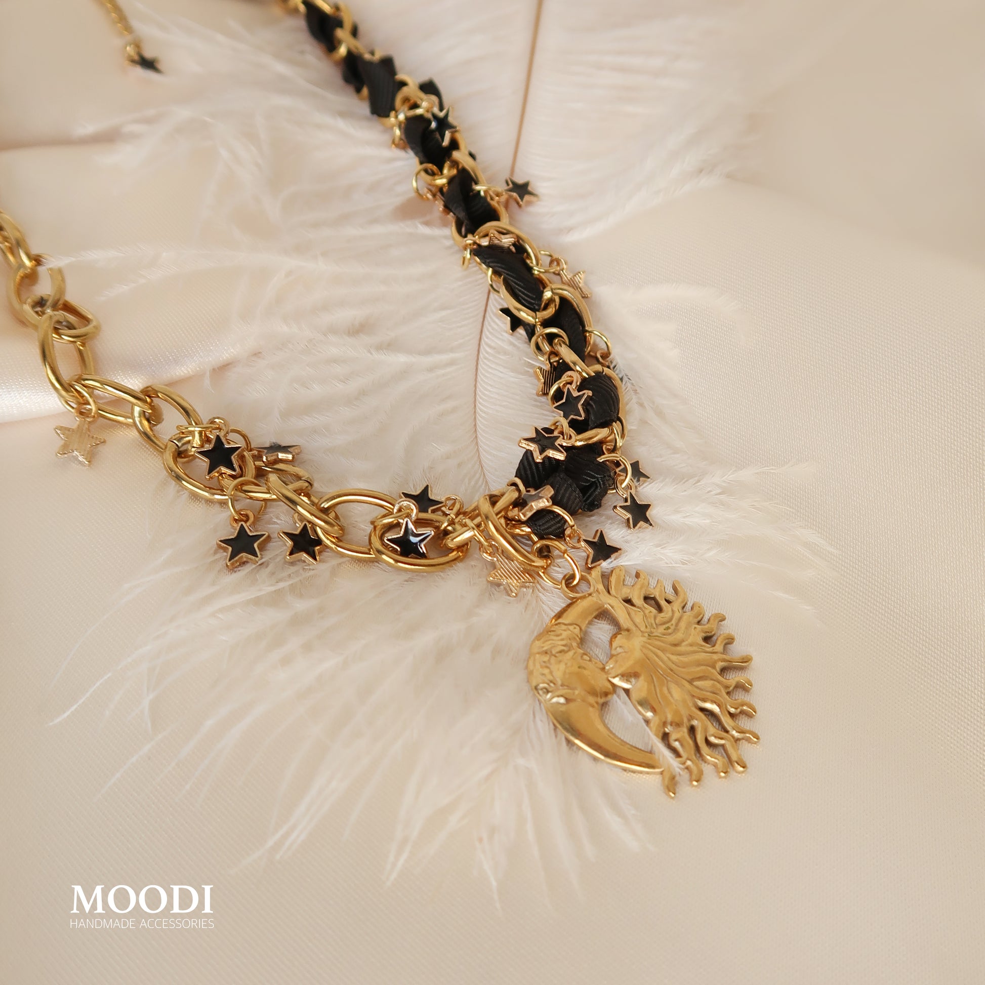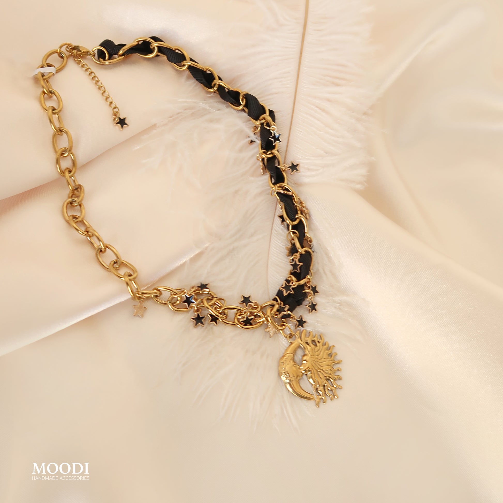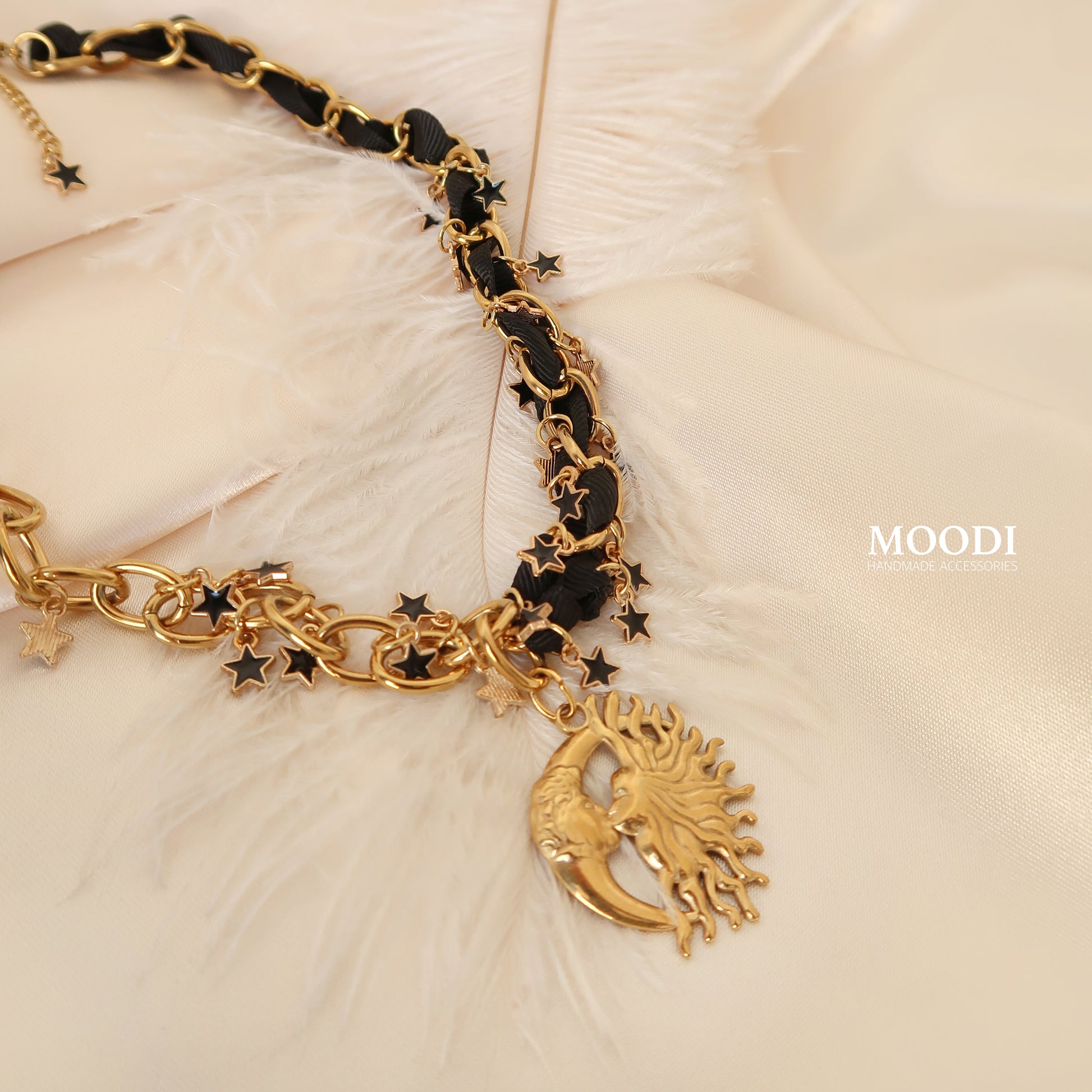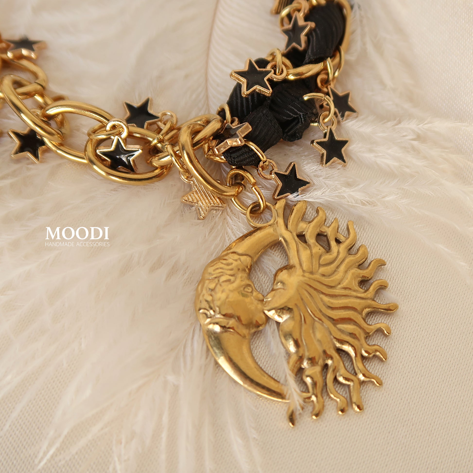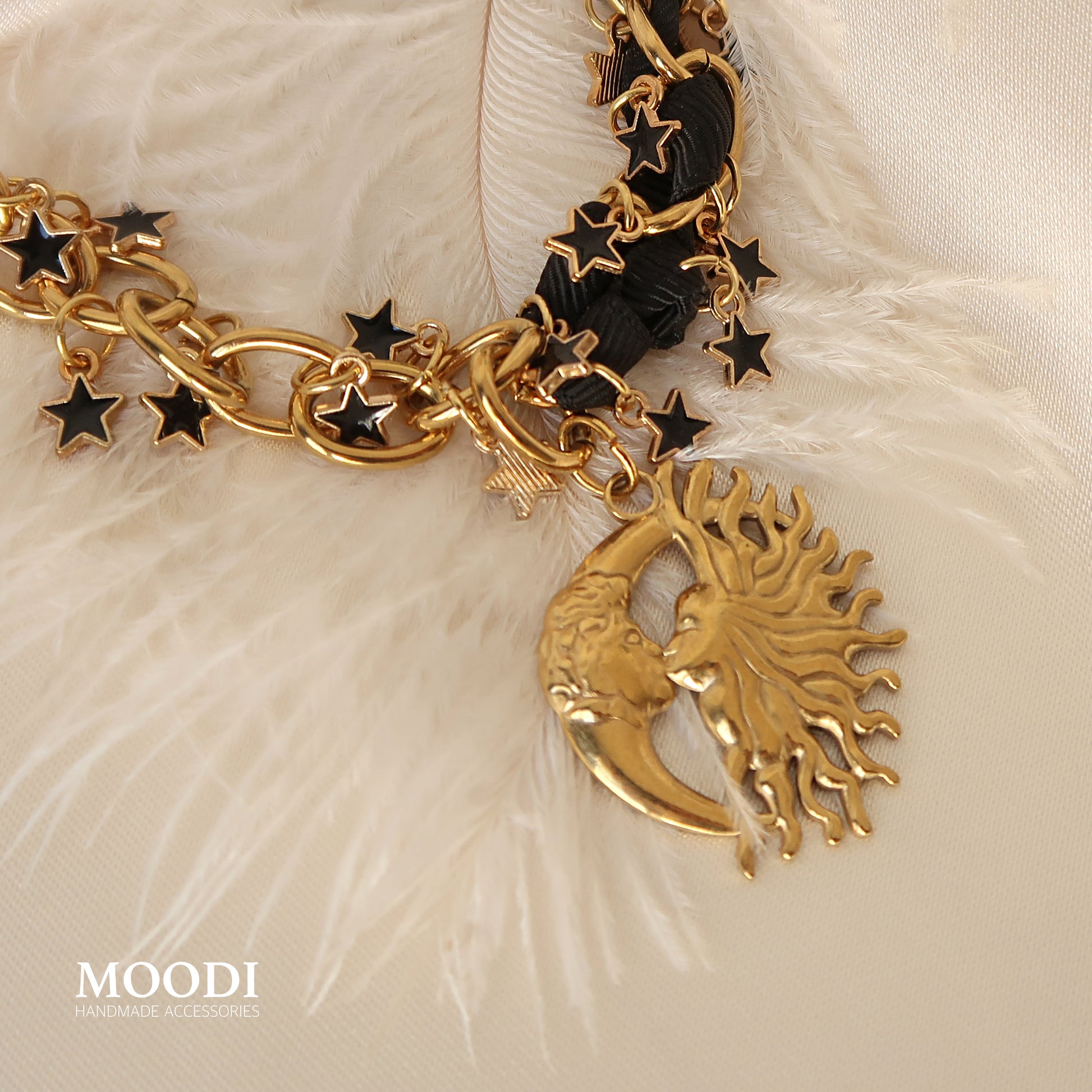 Златисти звезди, вплетени в черна панделка, срещат символа на вечния баланс – слънцето и луната в едно.