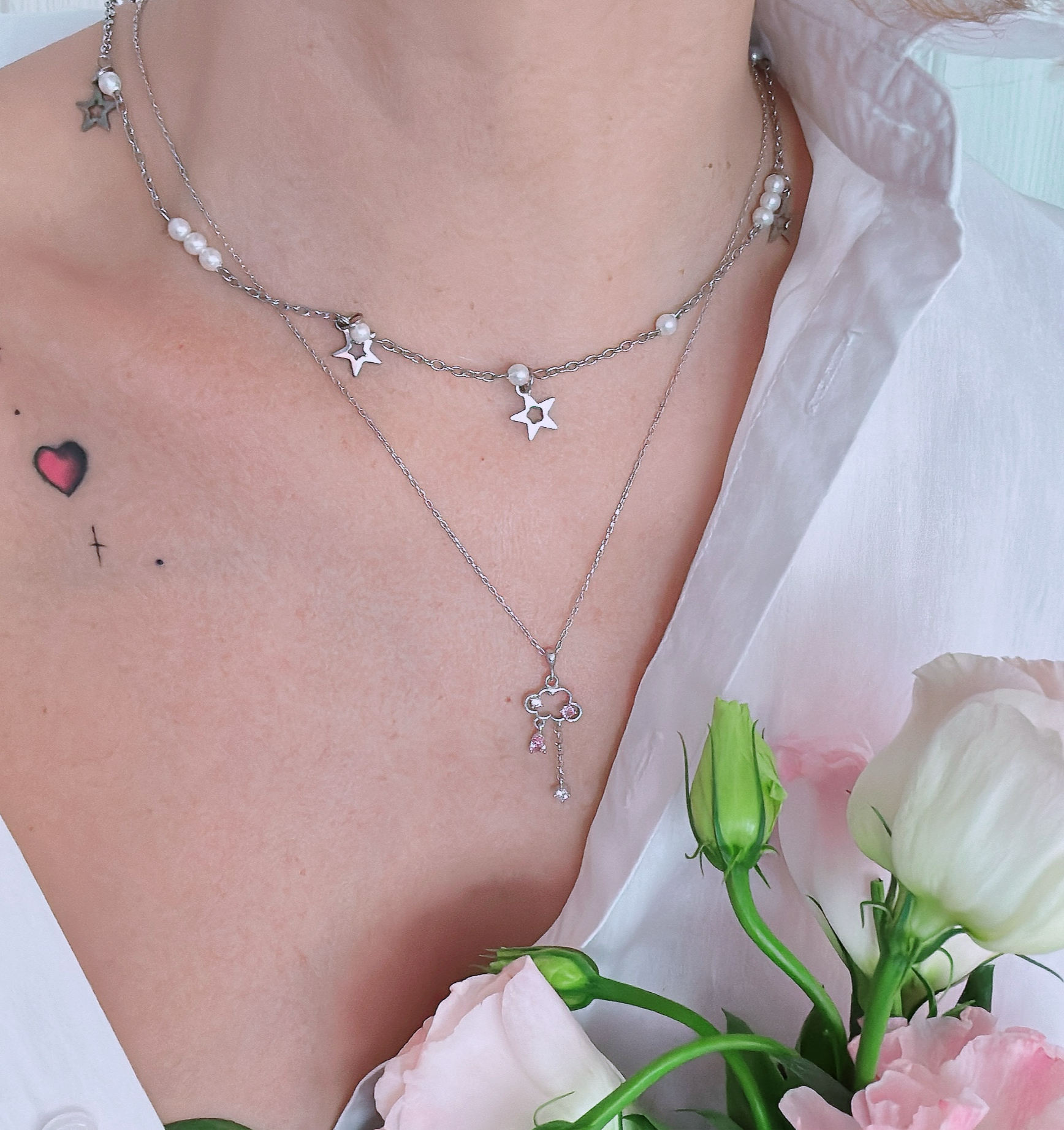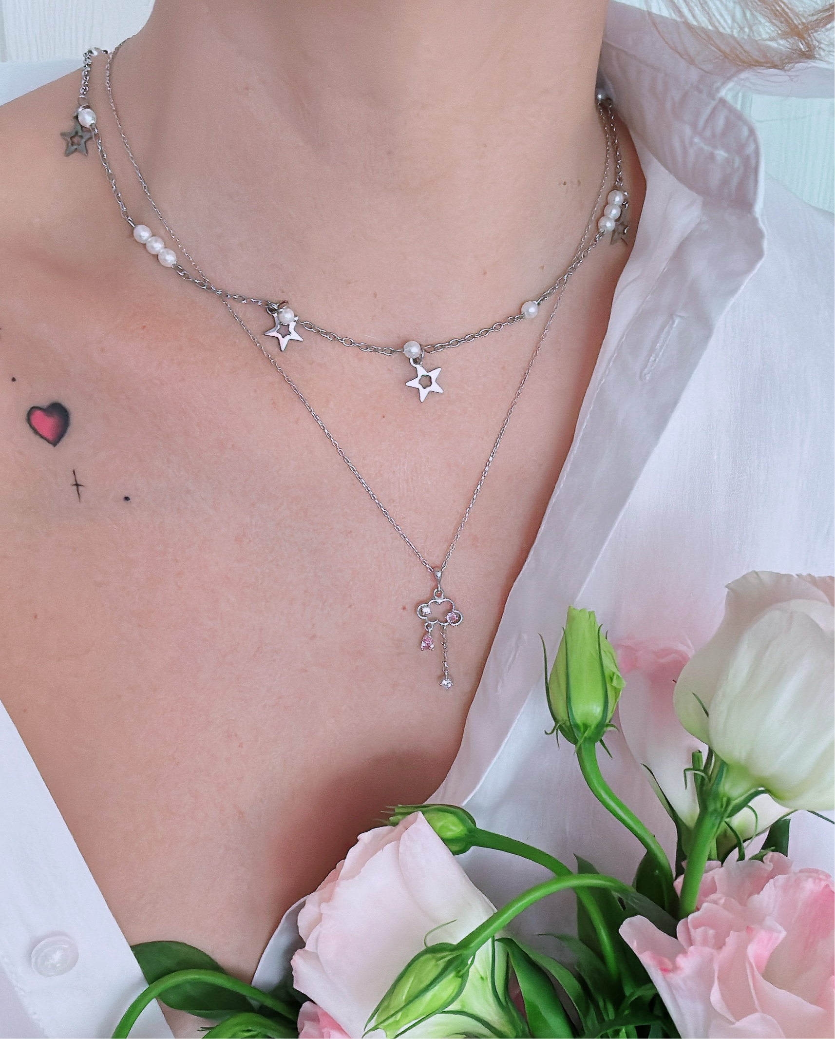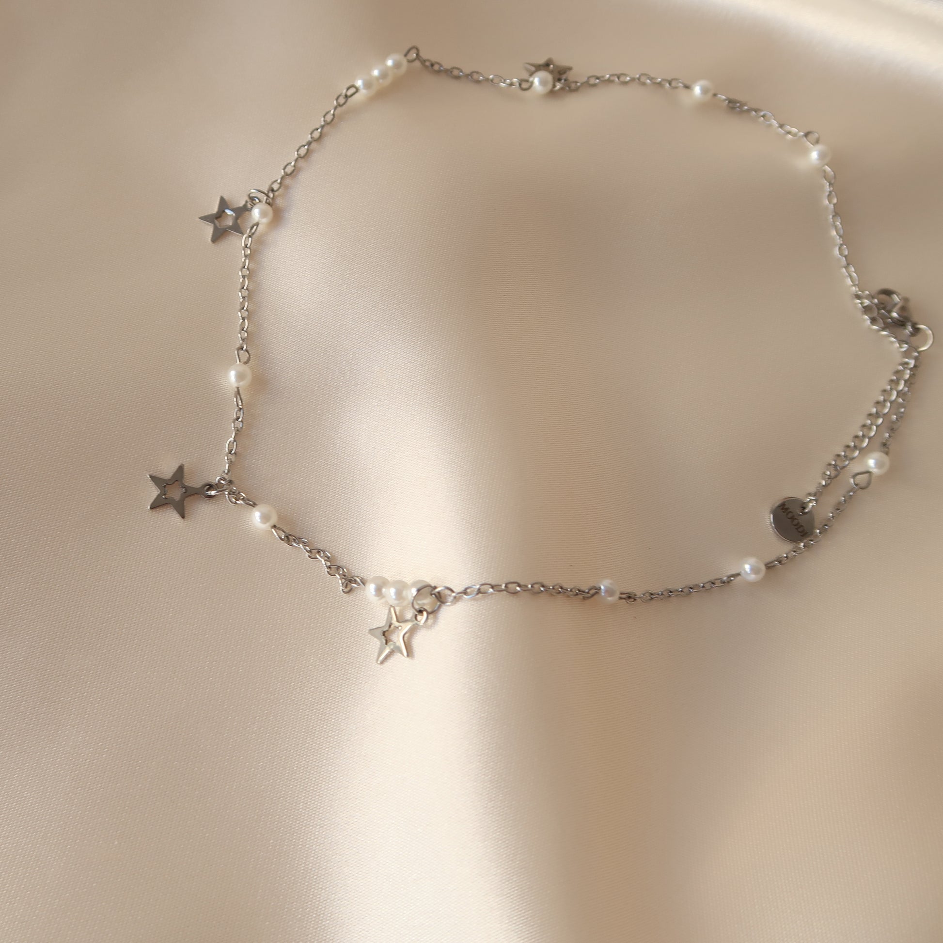 - Материал: Перлено колие с малки стъклени перли на стоманена верижка със стоманени звезди