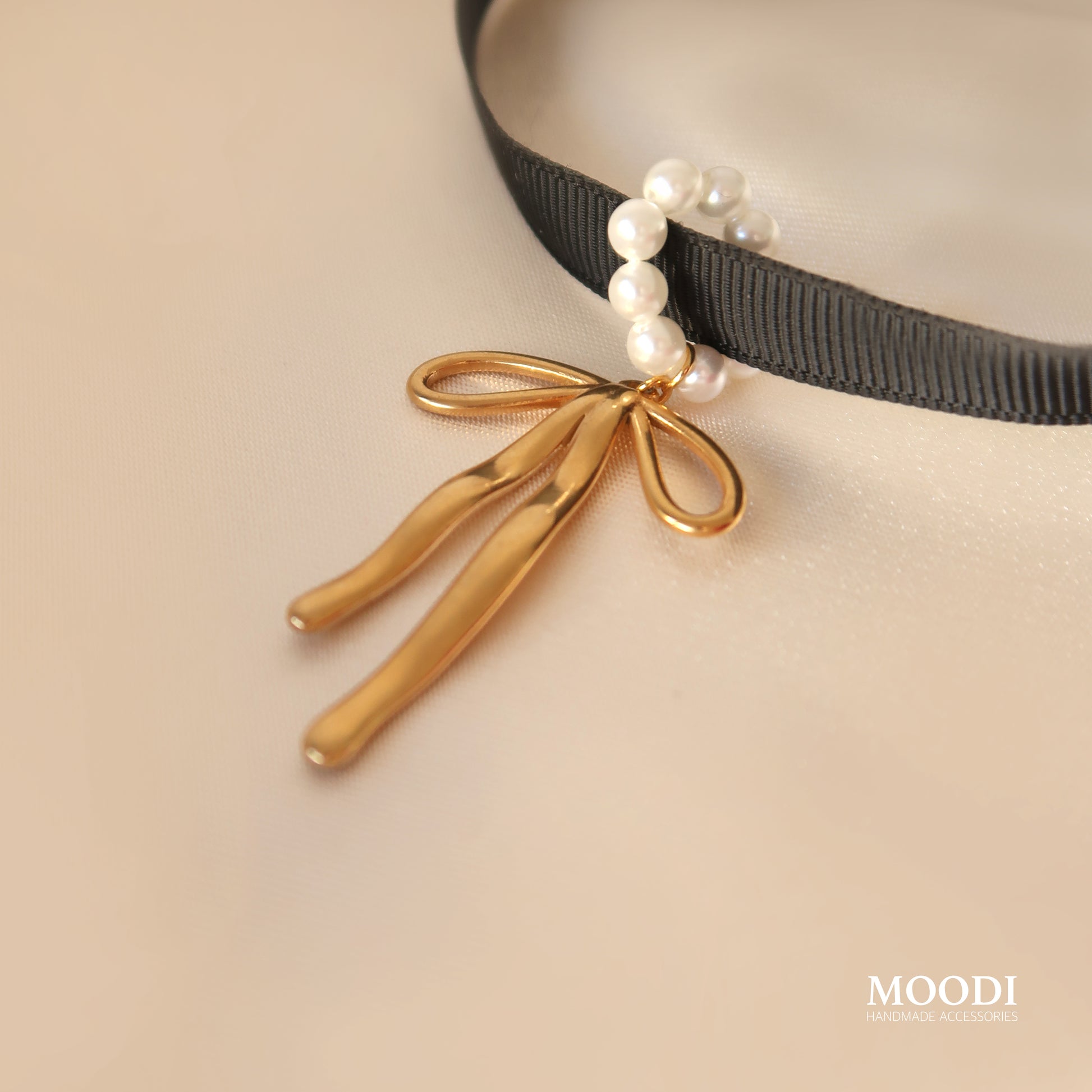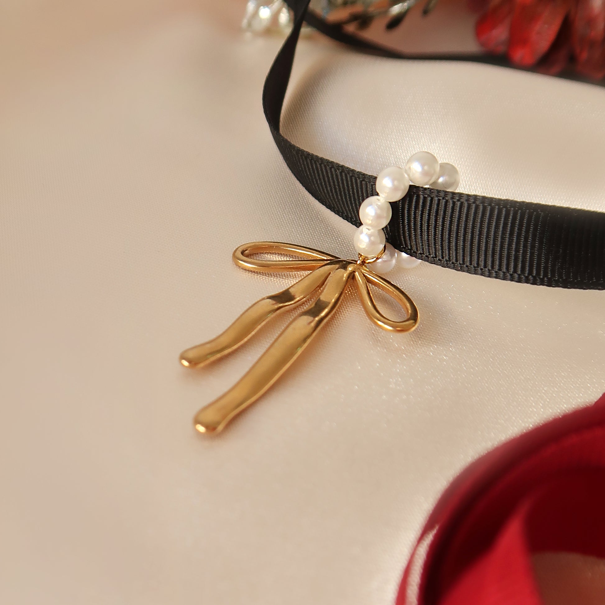 Представяме ви нашия нов Ribbon чоукър – перфектното допълнение за уютни и стилни дни. Нежно изработен с блестящи перлички и стоманена висулка във формата на панделка, този чоукър е едновременно елегантен и лесен за носене.