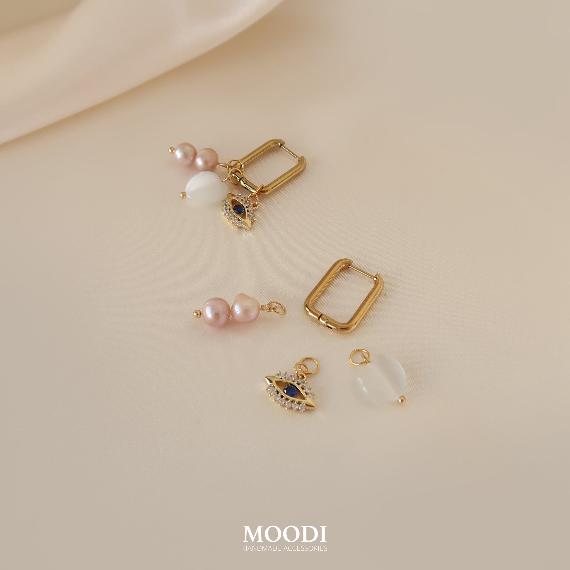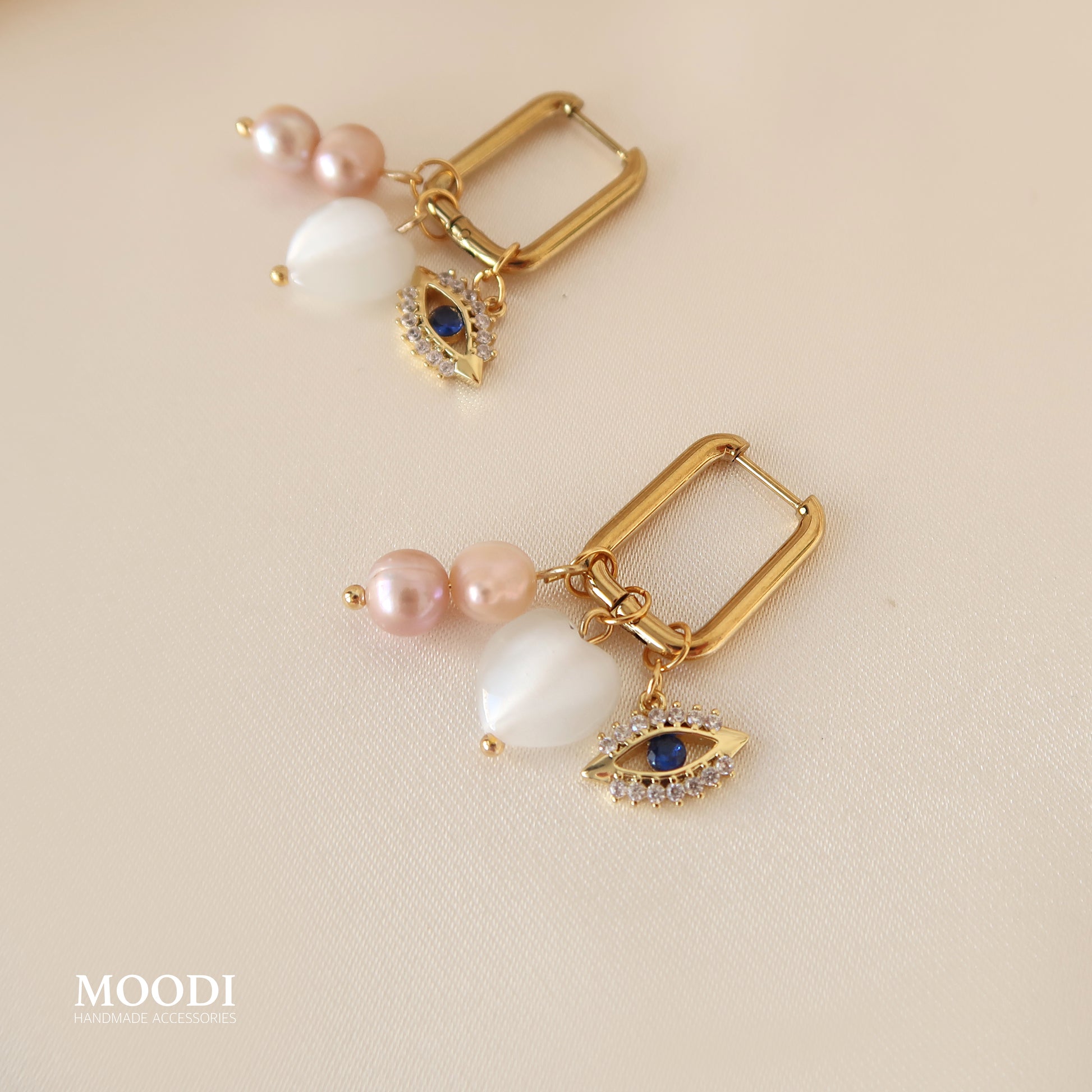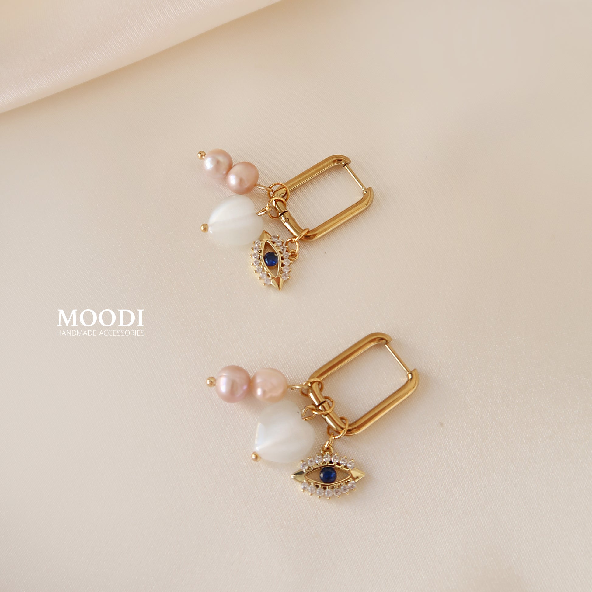 - Материал: Обеци от медицинска стомана клас 316L, Висулка око със циркониеви камъни, Розови естествени перли, Висулки сърца от естествени камъни Бяло котешко око
