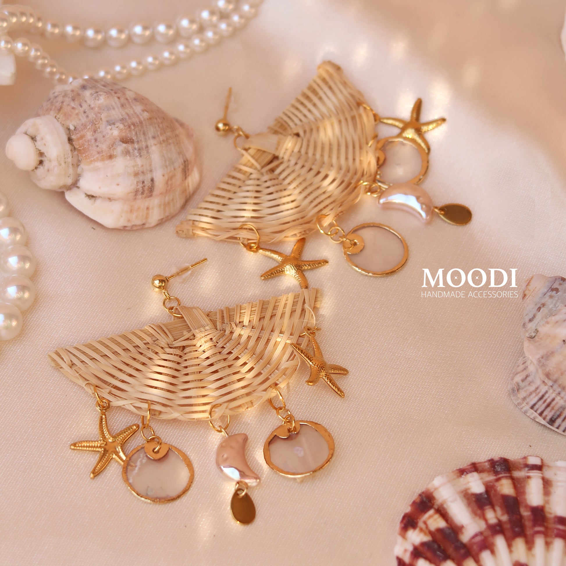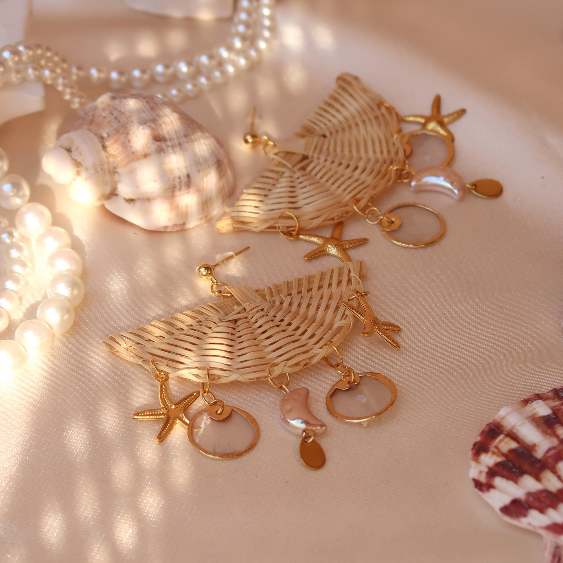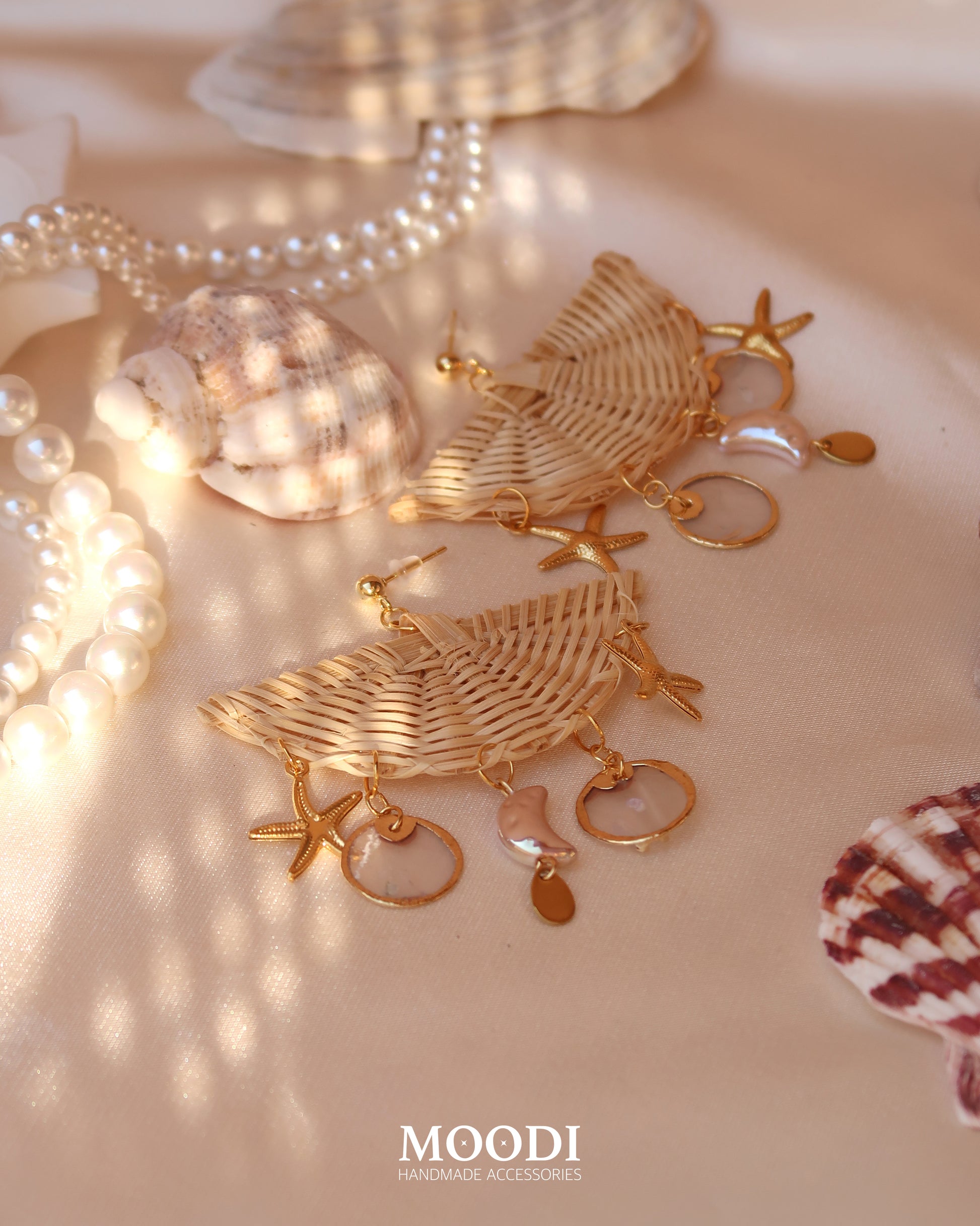 Материал: Обеци от медицинска хипоалергенна позлатена стомана тип Пин / Ратанови основа във форма на ветрило / Виксулки : Стоманени части морски звезди, Седефени плочки, Висулки седефирани луни