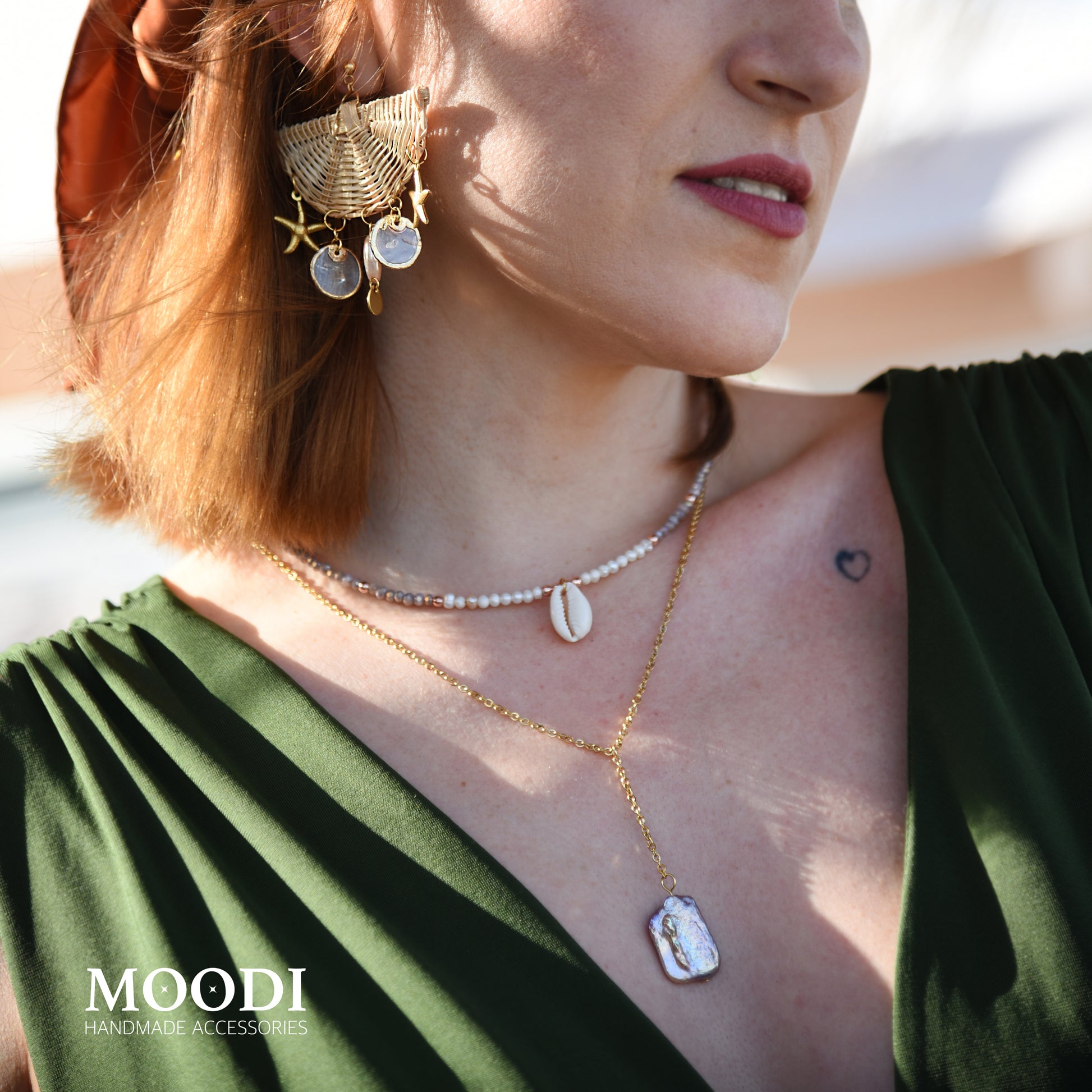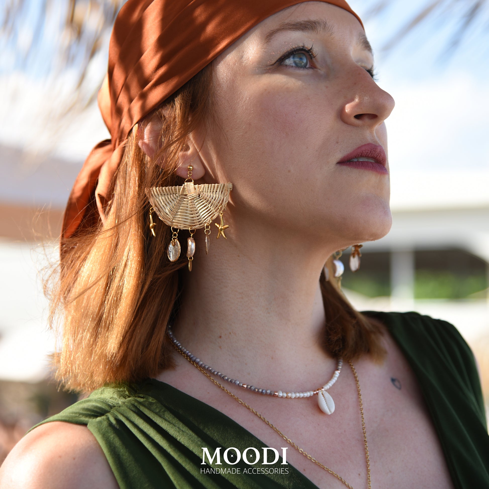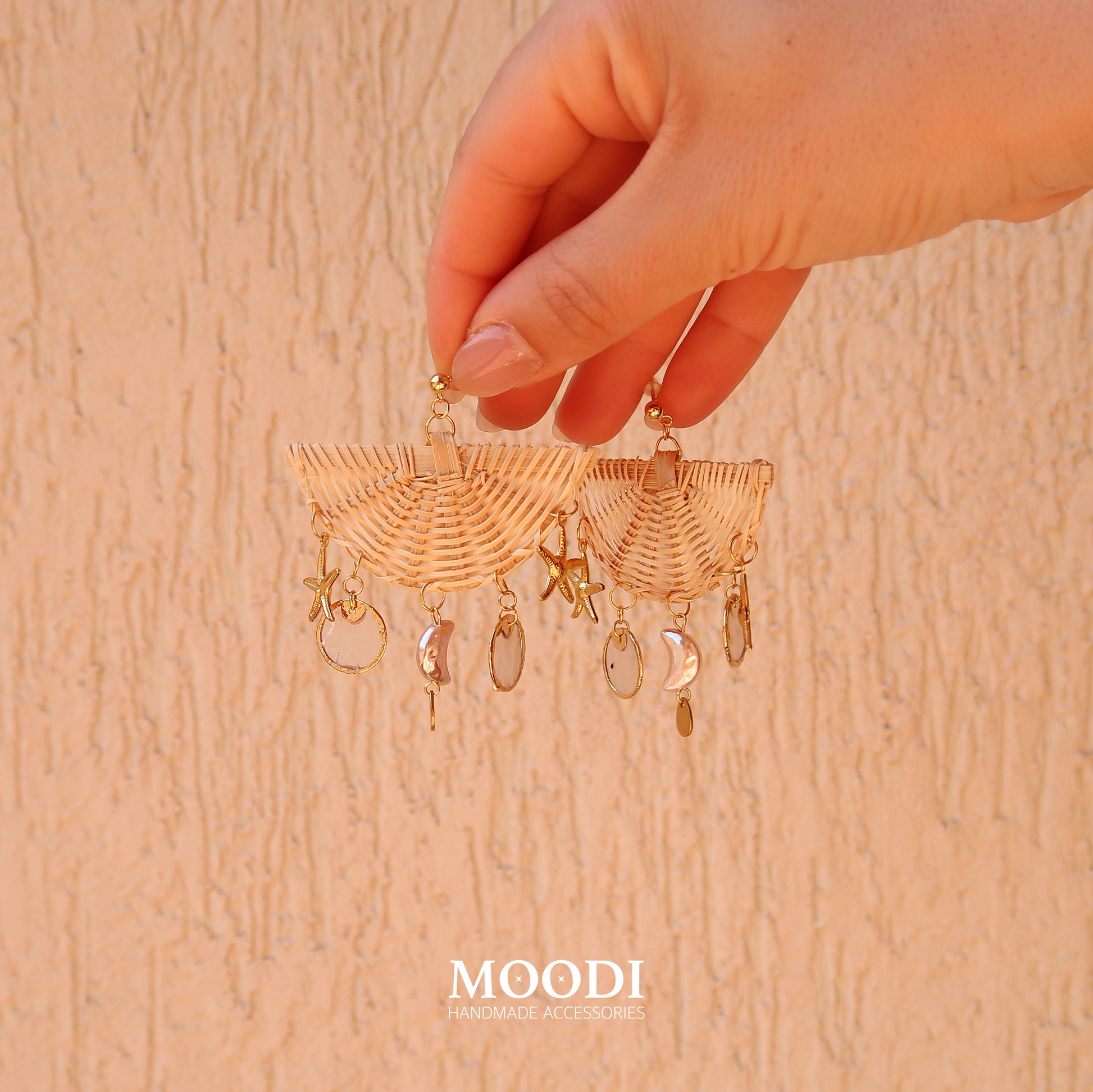 Материал: Обеци от медицинска хипоалергенна позлатена стомана тип Пин / Ратанови основа във форма на ветрило / Виксулки : Стоманени части морски звезди, Седефени плочки, Висулки седефирани луни