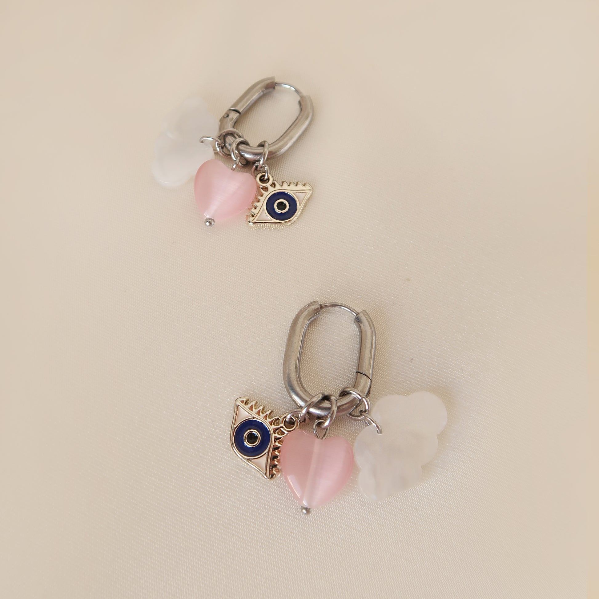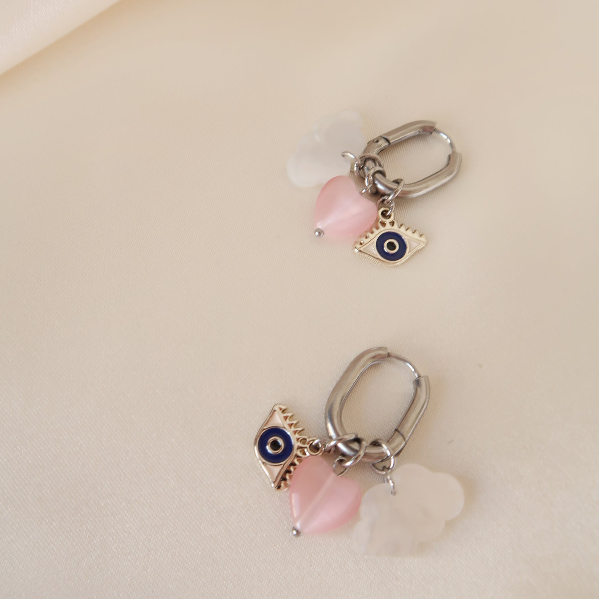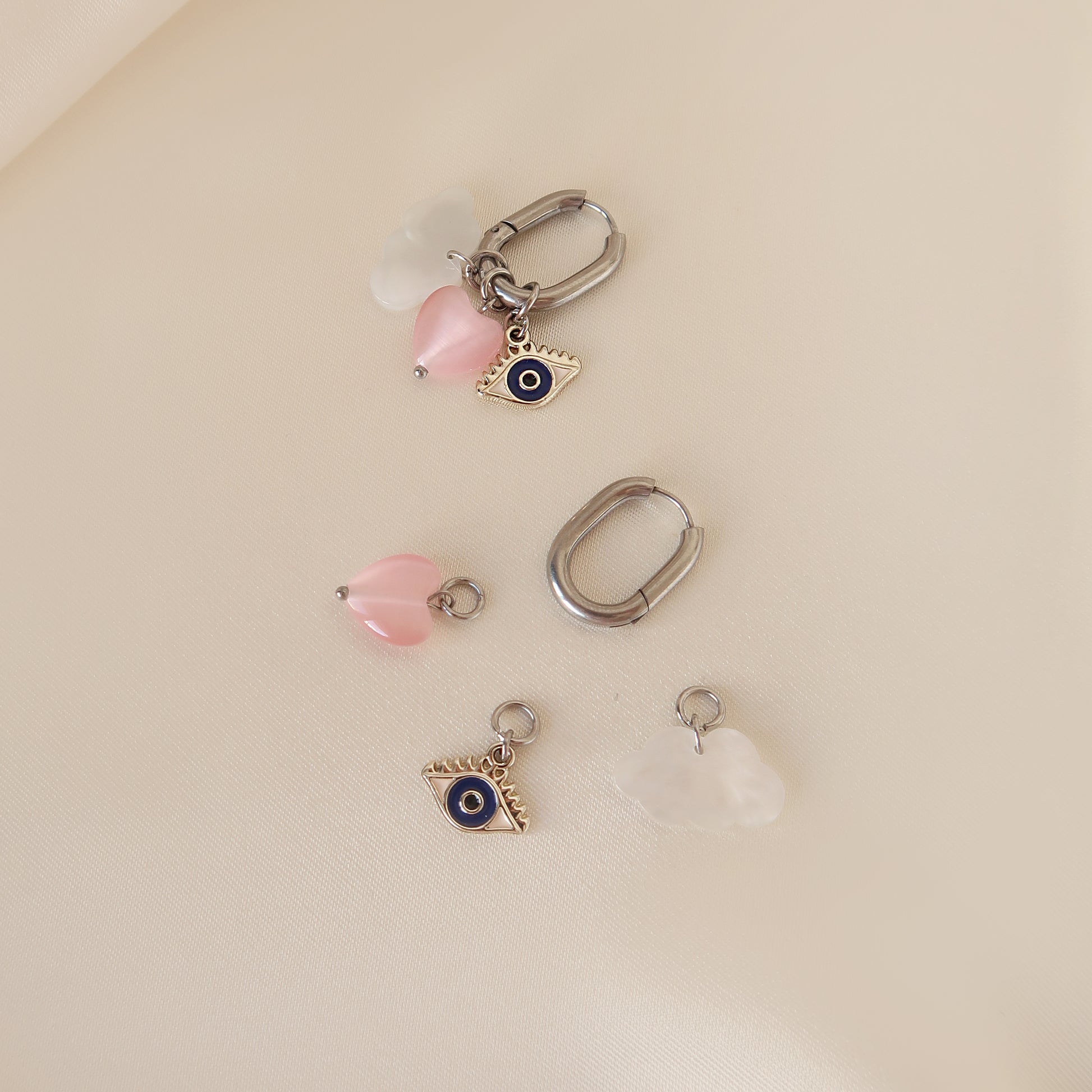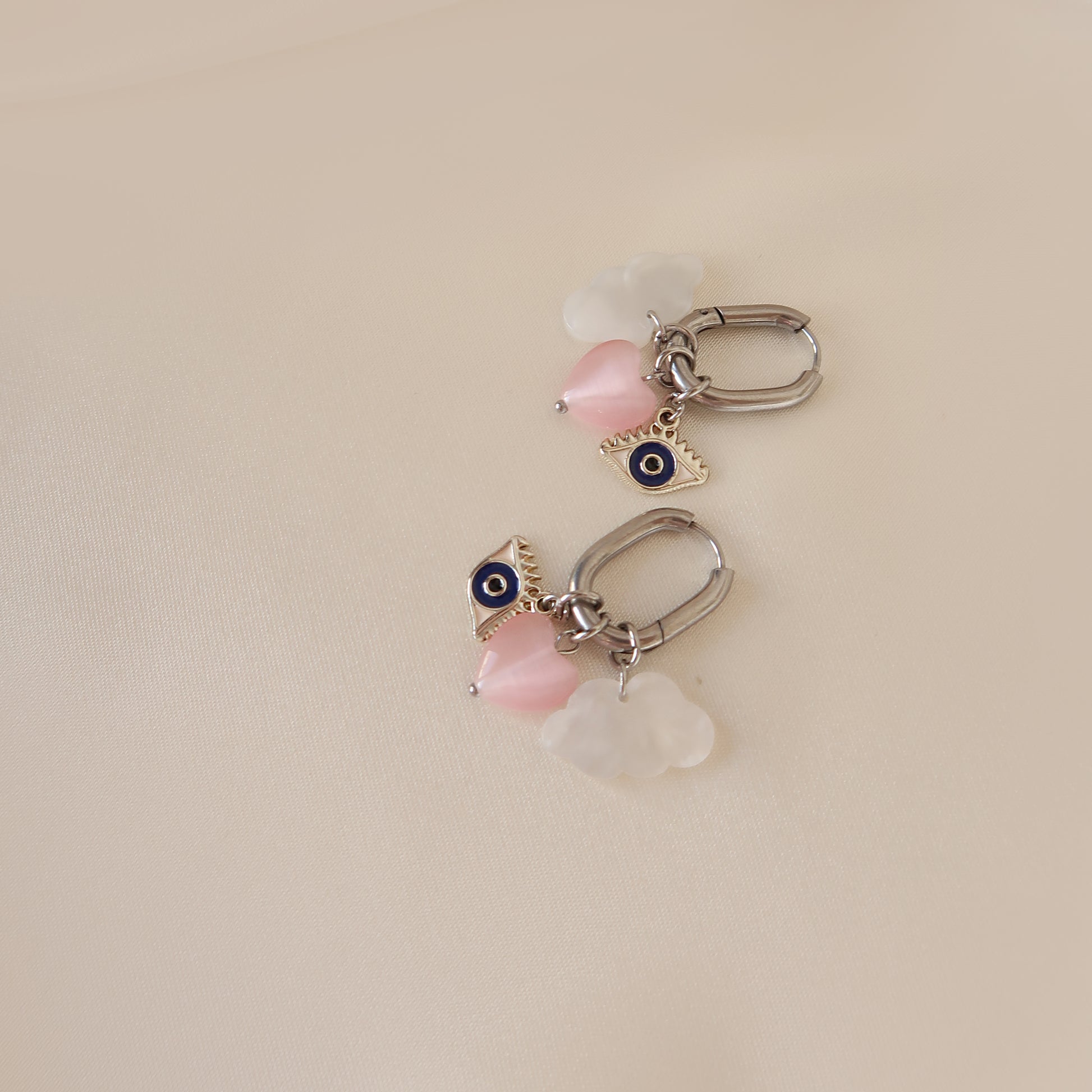 - Материал: Обеци медицинска стомана / висулки от розови сърца от естествени кмаътни котешко око / висулки облаци от седеф / висулки око