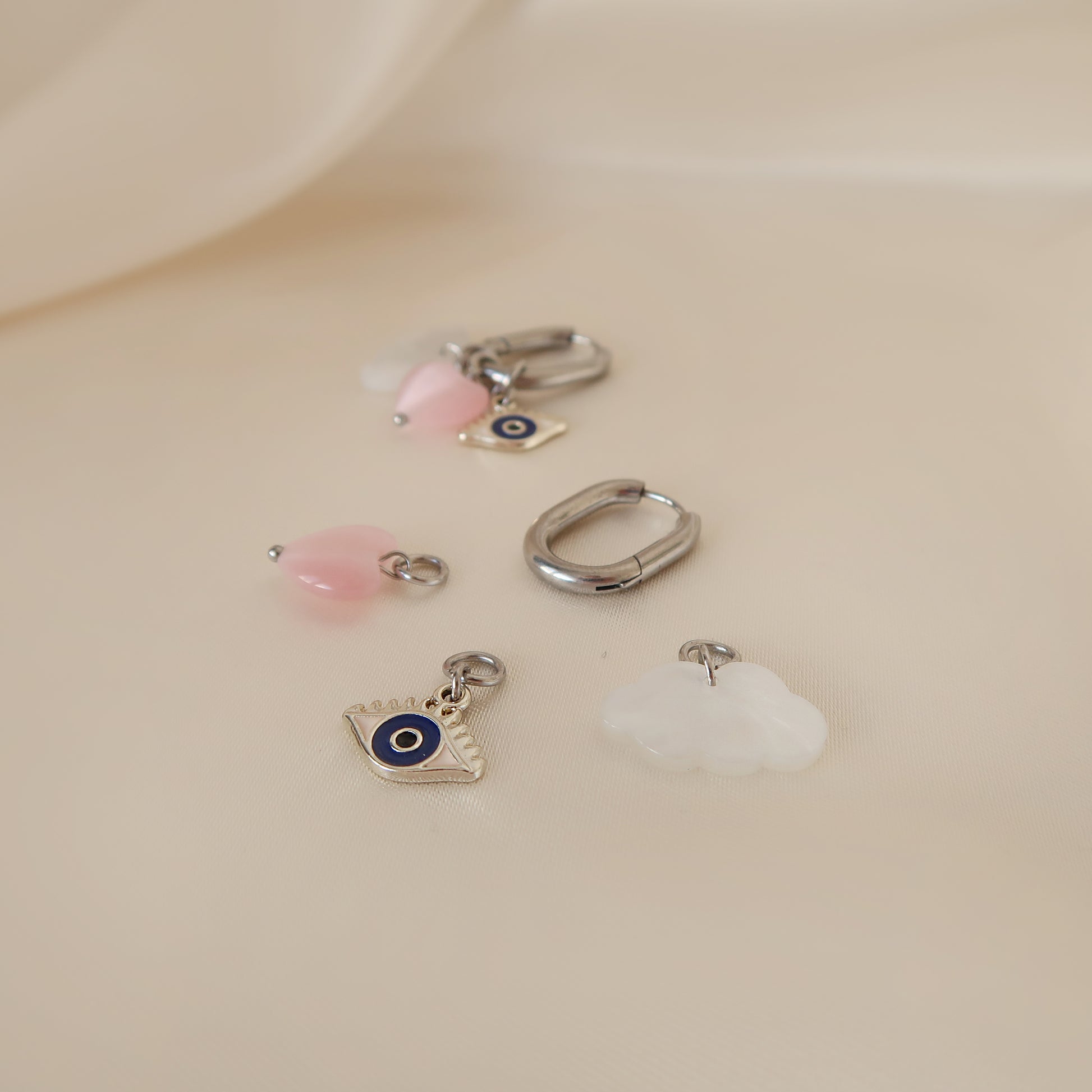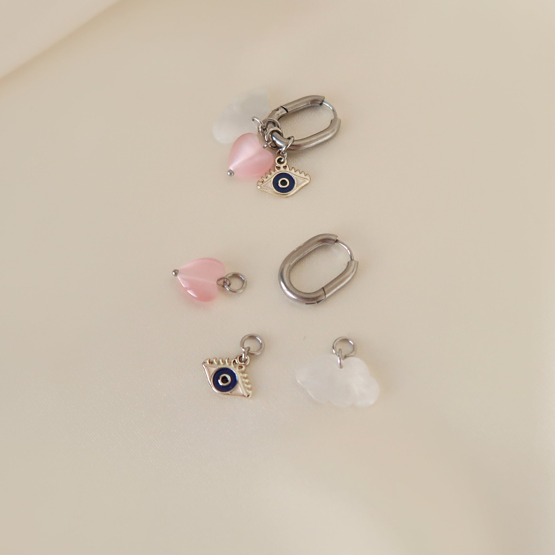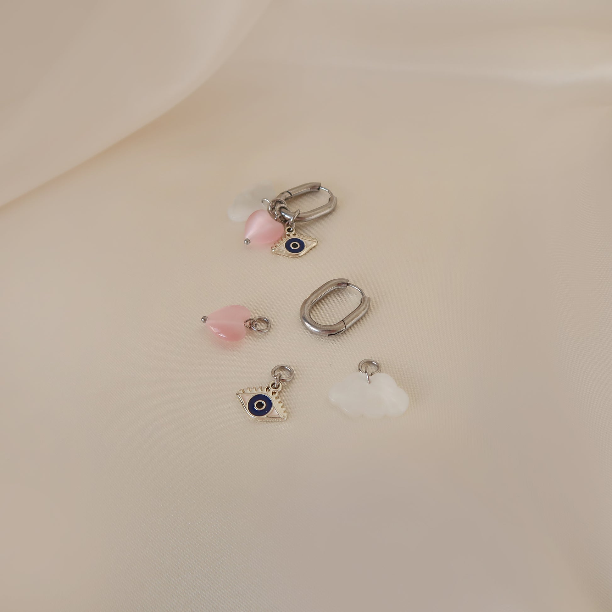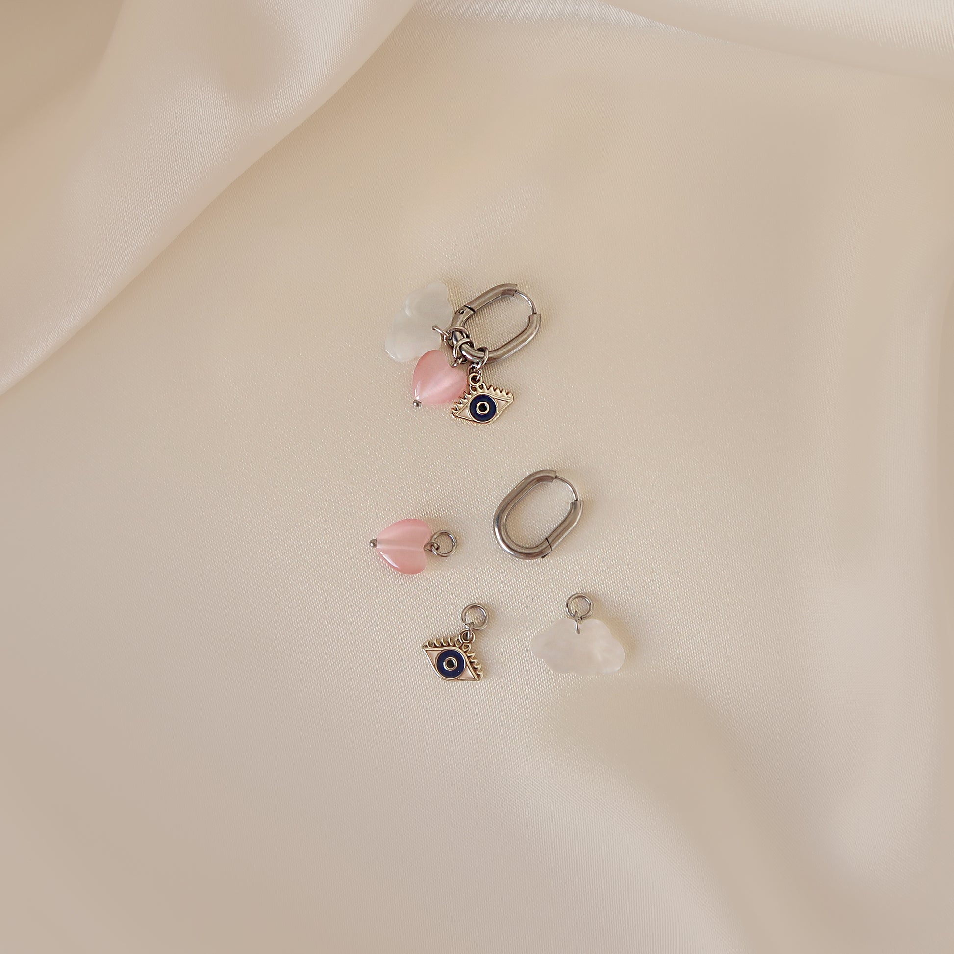 - Материал: Обеци медицинска стомана / висулки от розови сърца от естествени кмаътни котешко око / висулки облаци от седеф / висулки око