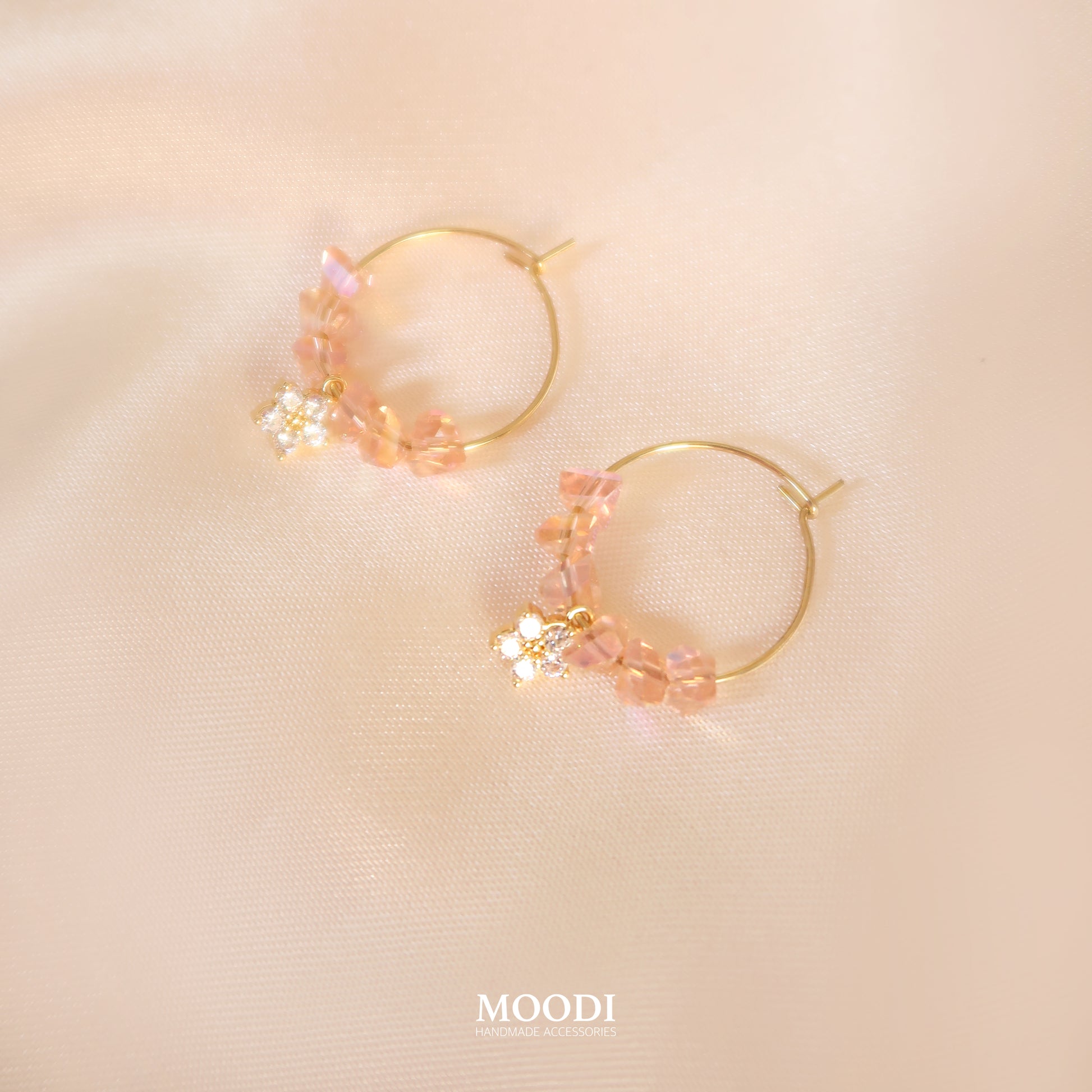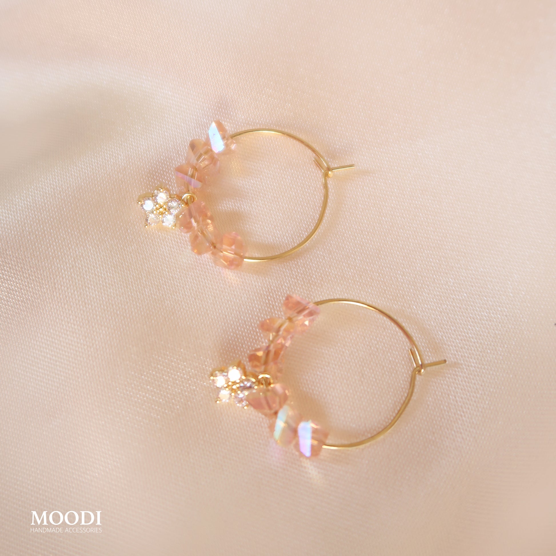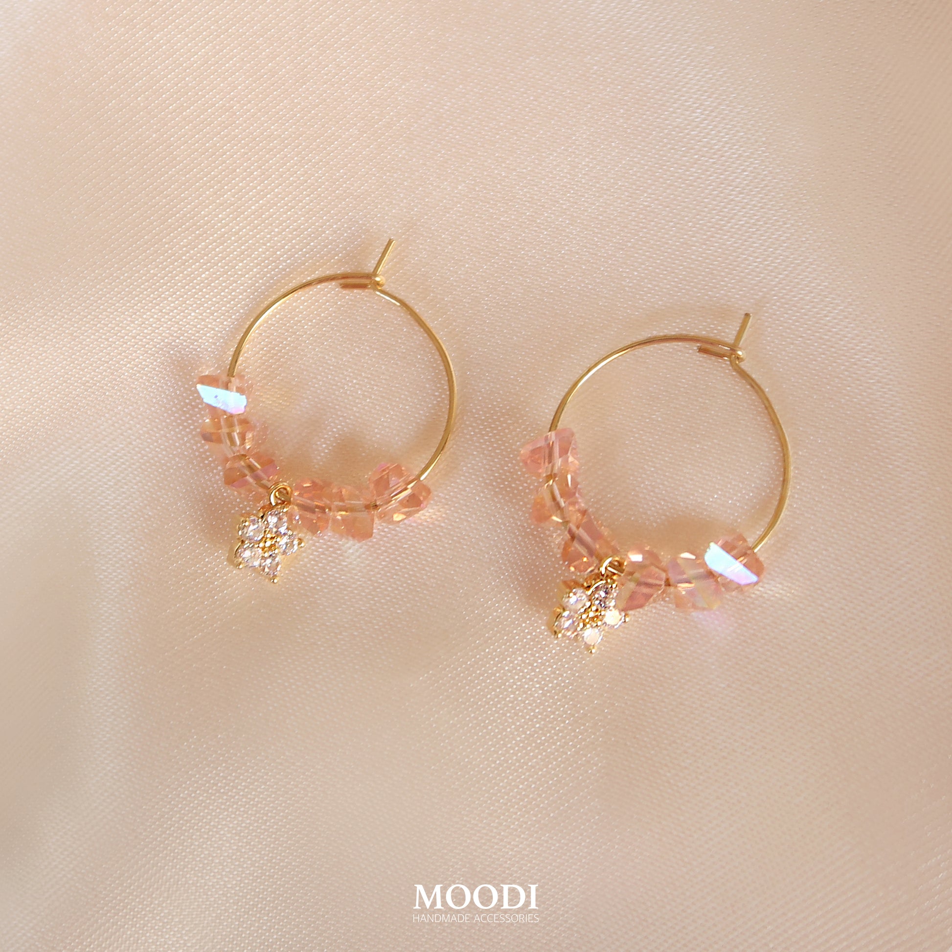- Материал: Обеци от медицинска стомана клас 316L, Ромбовидни кристали в цвят праскова, Висулки цвете от месинг и циркониеви камъни