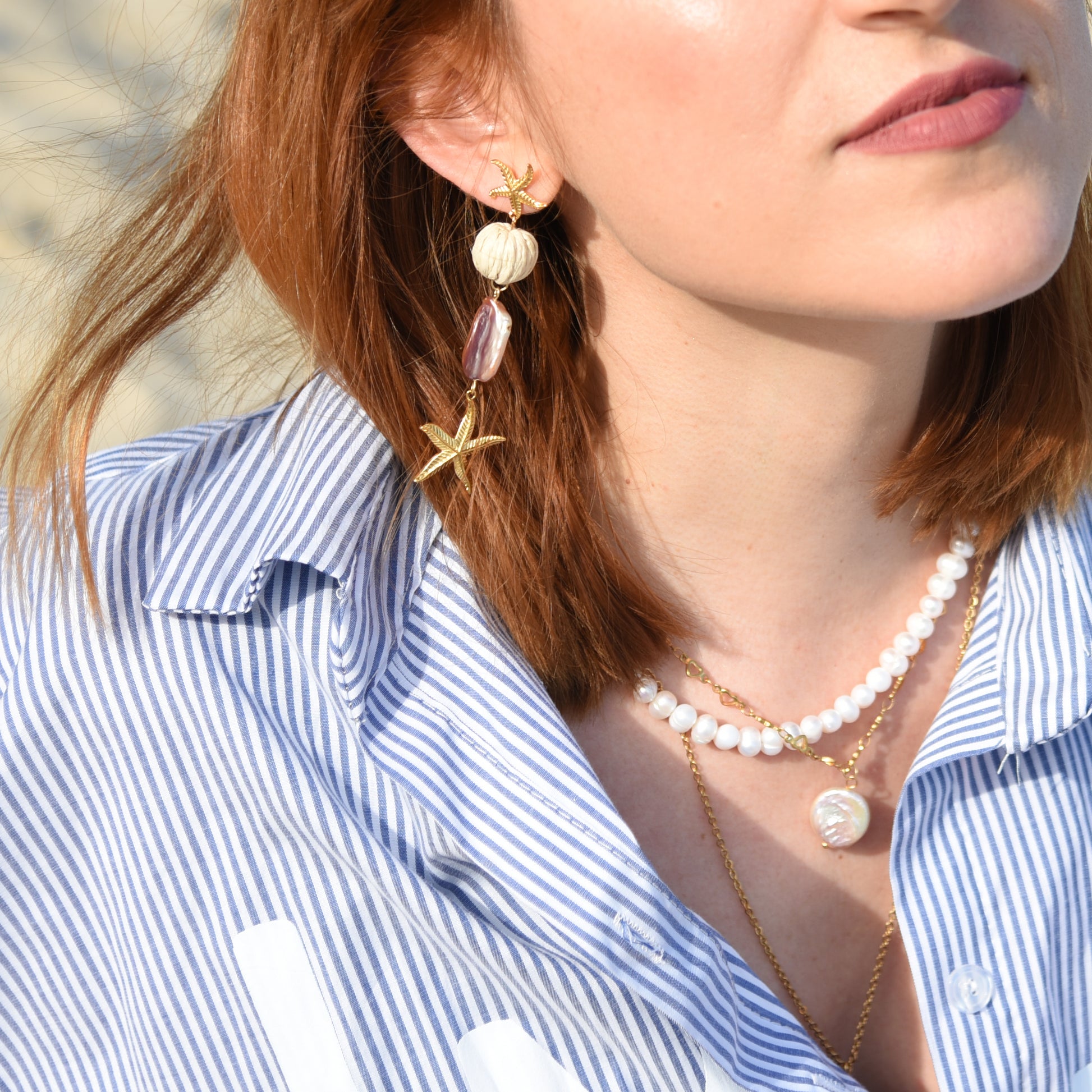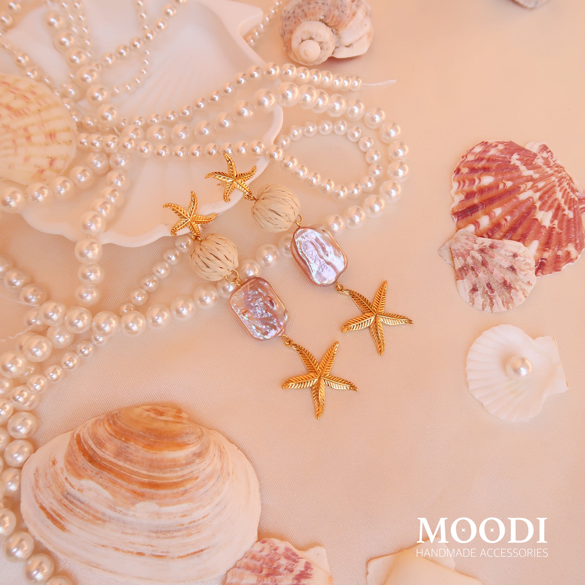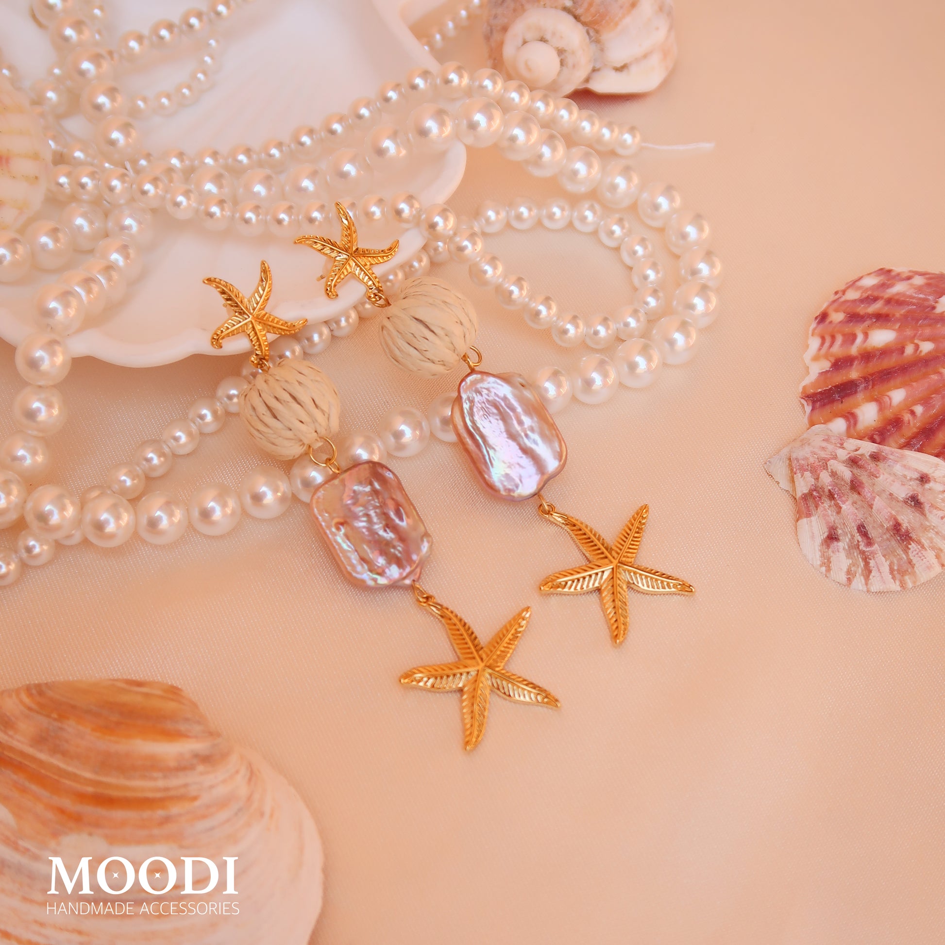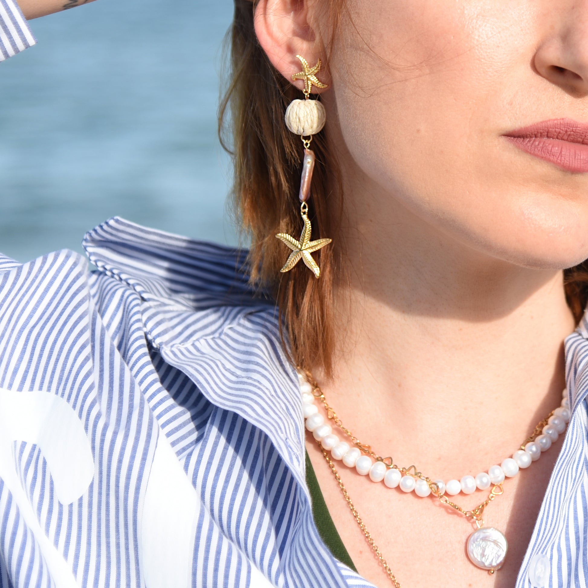 Материал: Обеци от позлатена медицинска неръждаема стомана във формата на морска звезда тип Пин / Ратанови топче висулка / Висококачествена Барокова перла / Висулка по-голяма морска звезда - позлатена, неръждаема стомана
