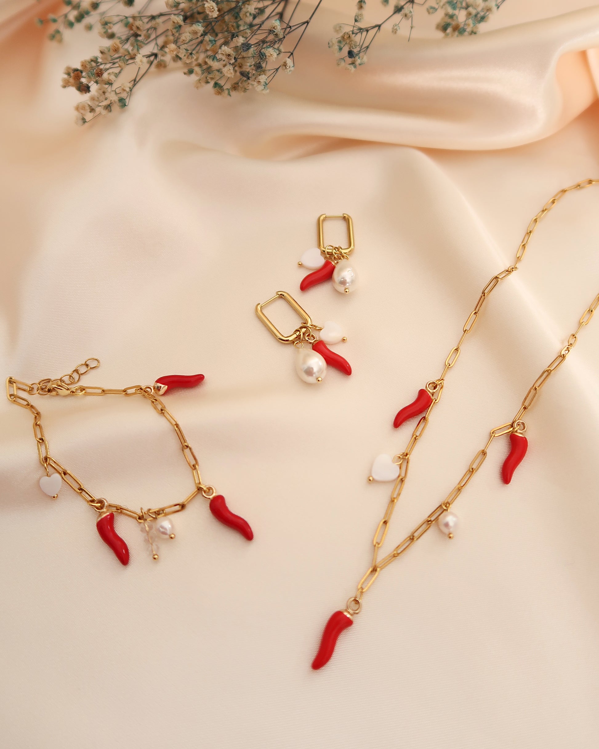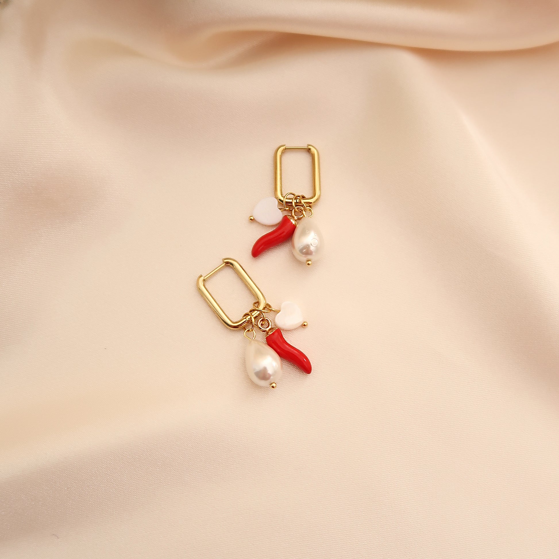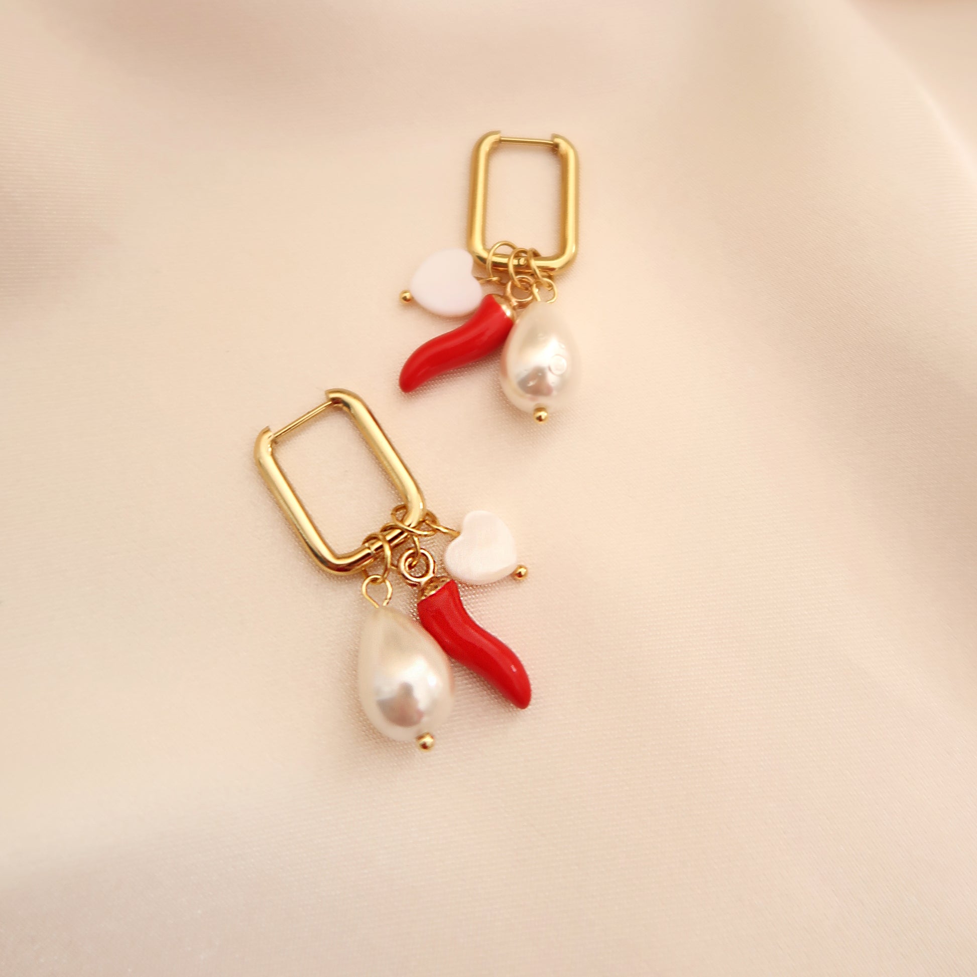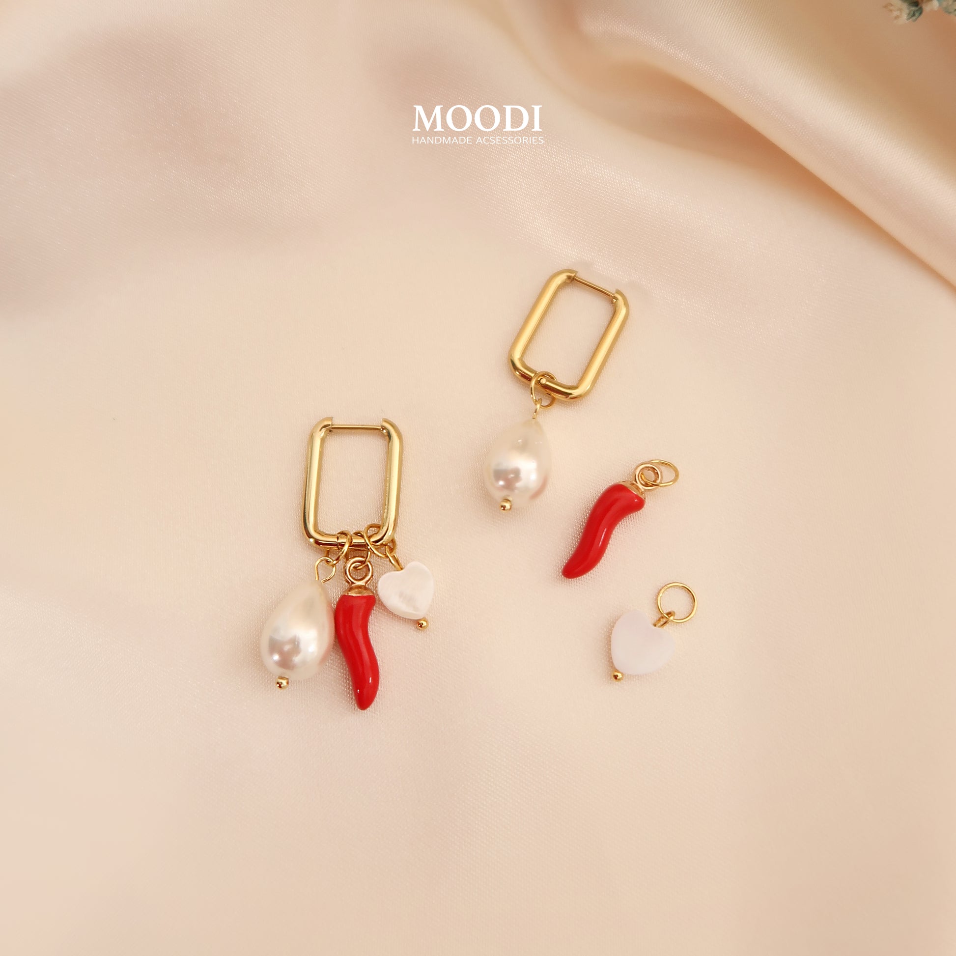 Време е да си лютиво гореща! Привлекателни обеци с червени чили чушки, перли и звезди. Комбинация, създадена за любов от пръв поглед. Обеците са тип ( 3 в 1 ) могат да се аранжират според ежедневното ви настроение.
