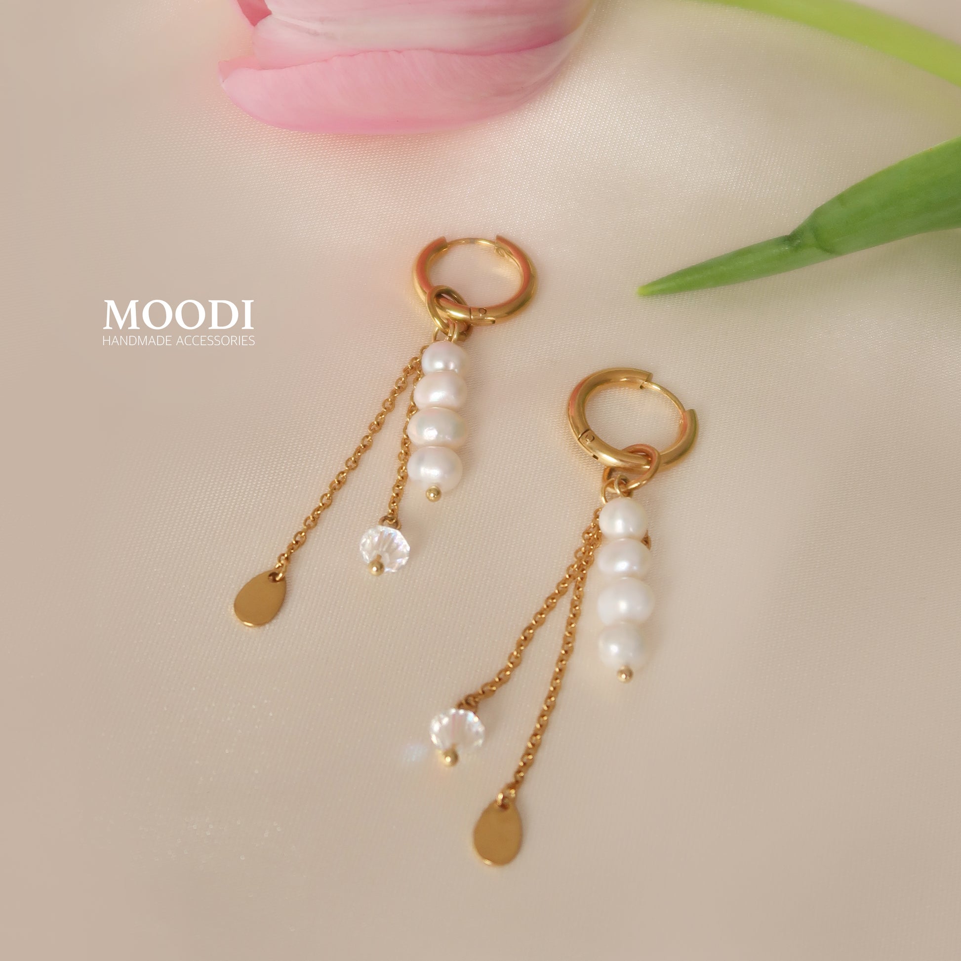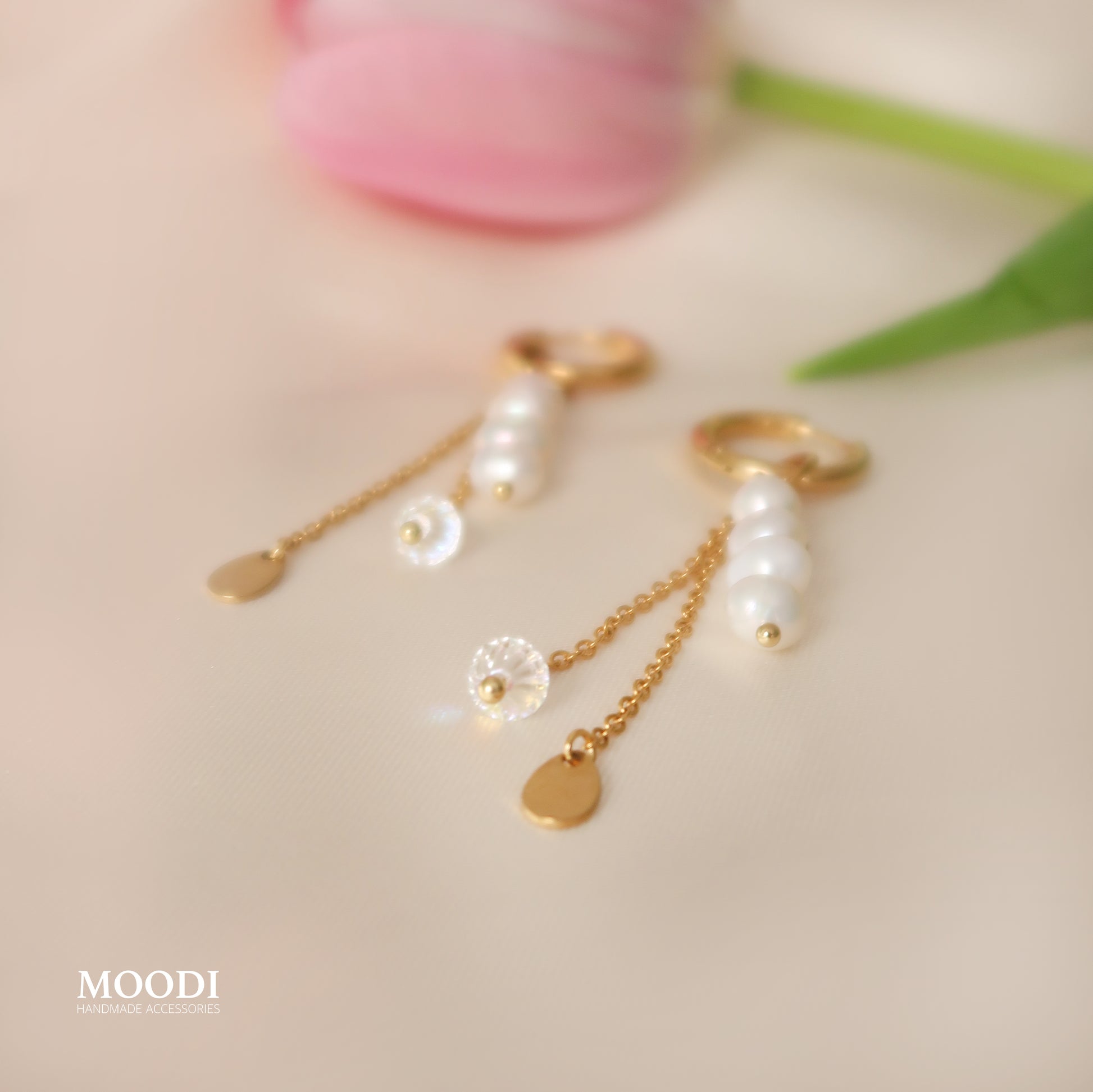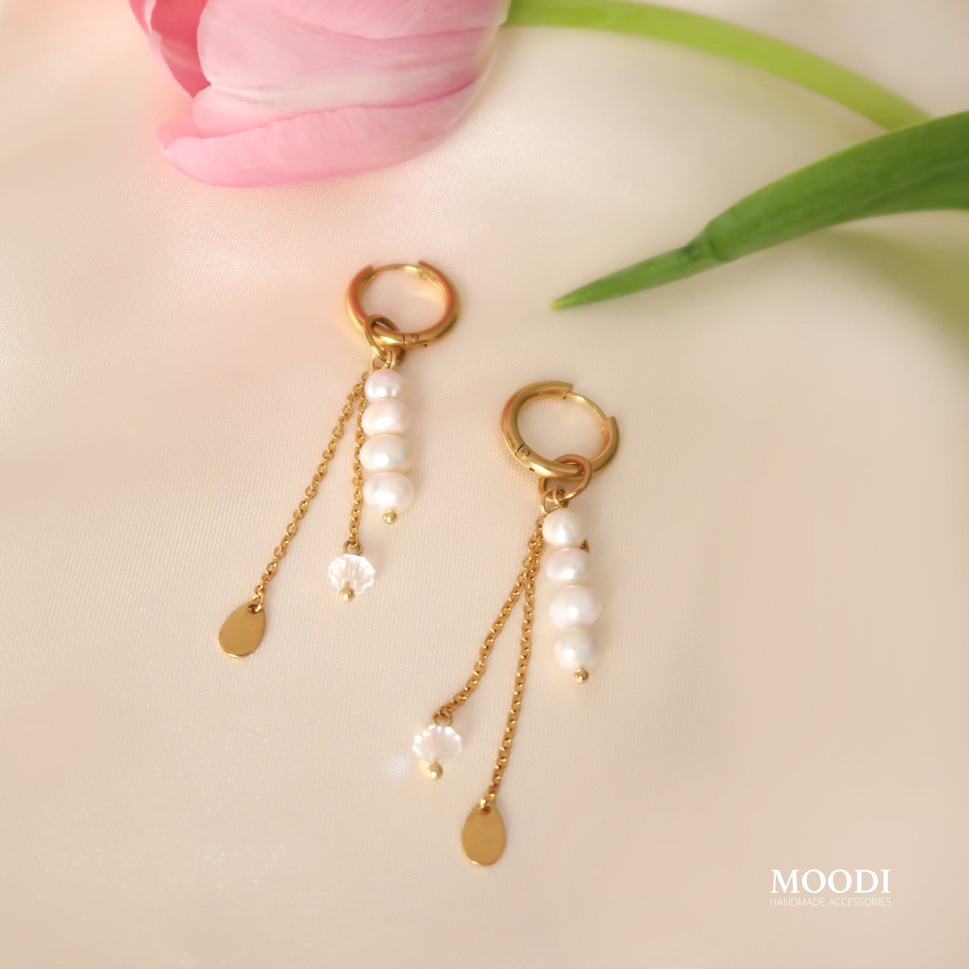 Ръчно изработени с любов, те съчетават мекотата на естествените перли, свободата на нежно падащите стоманени синджири и магичния блясък на кристали Swarovski.