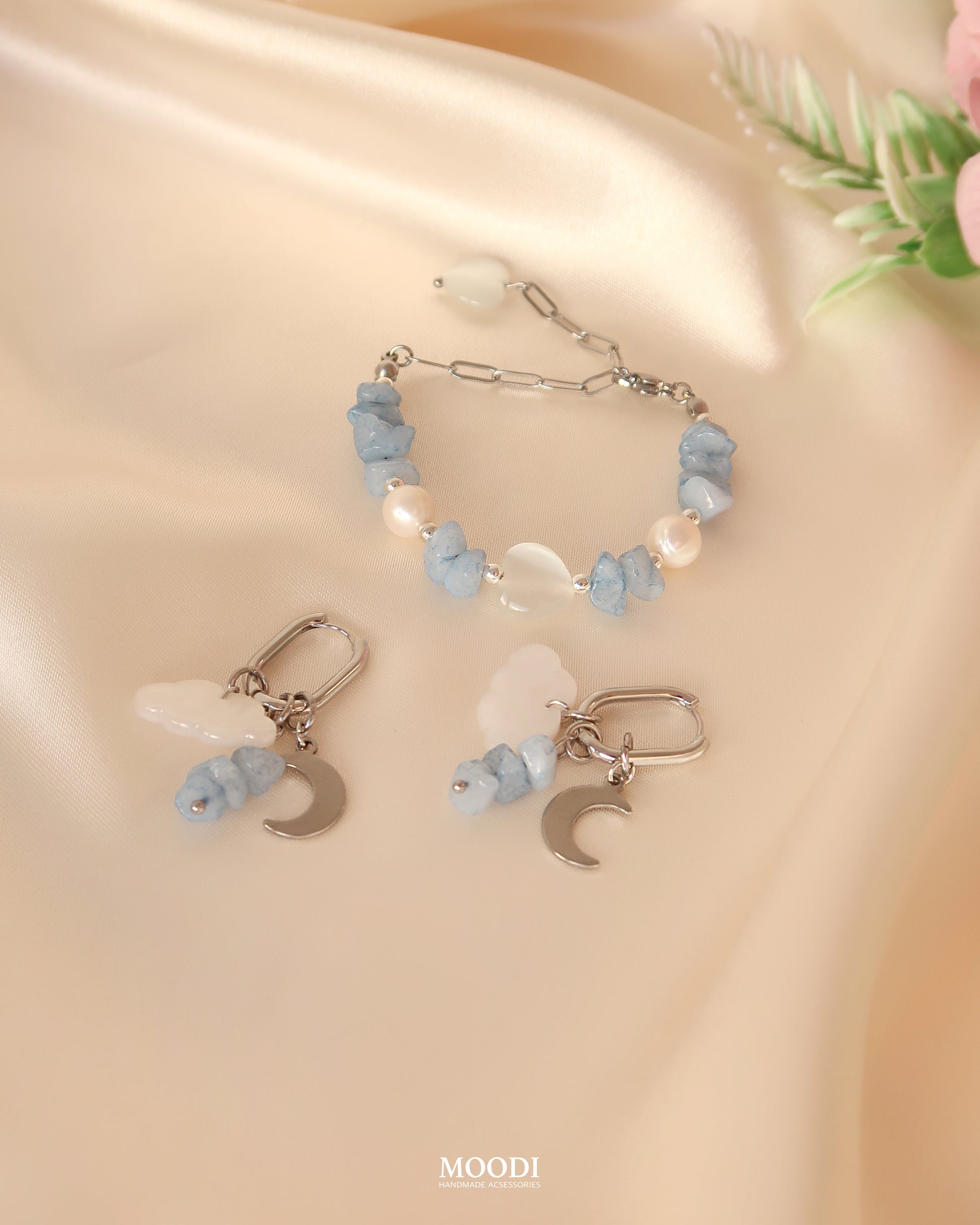 - Материал: Обеци, висулки - медицинска стомана клас 316L, Облачета от естествен седеф, камъни Аквамарин