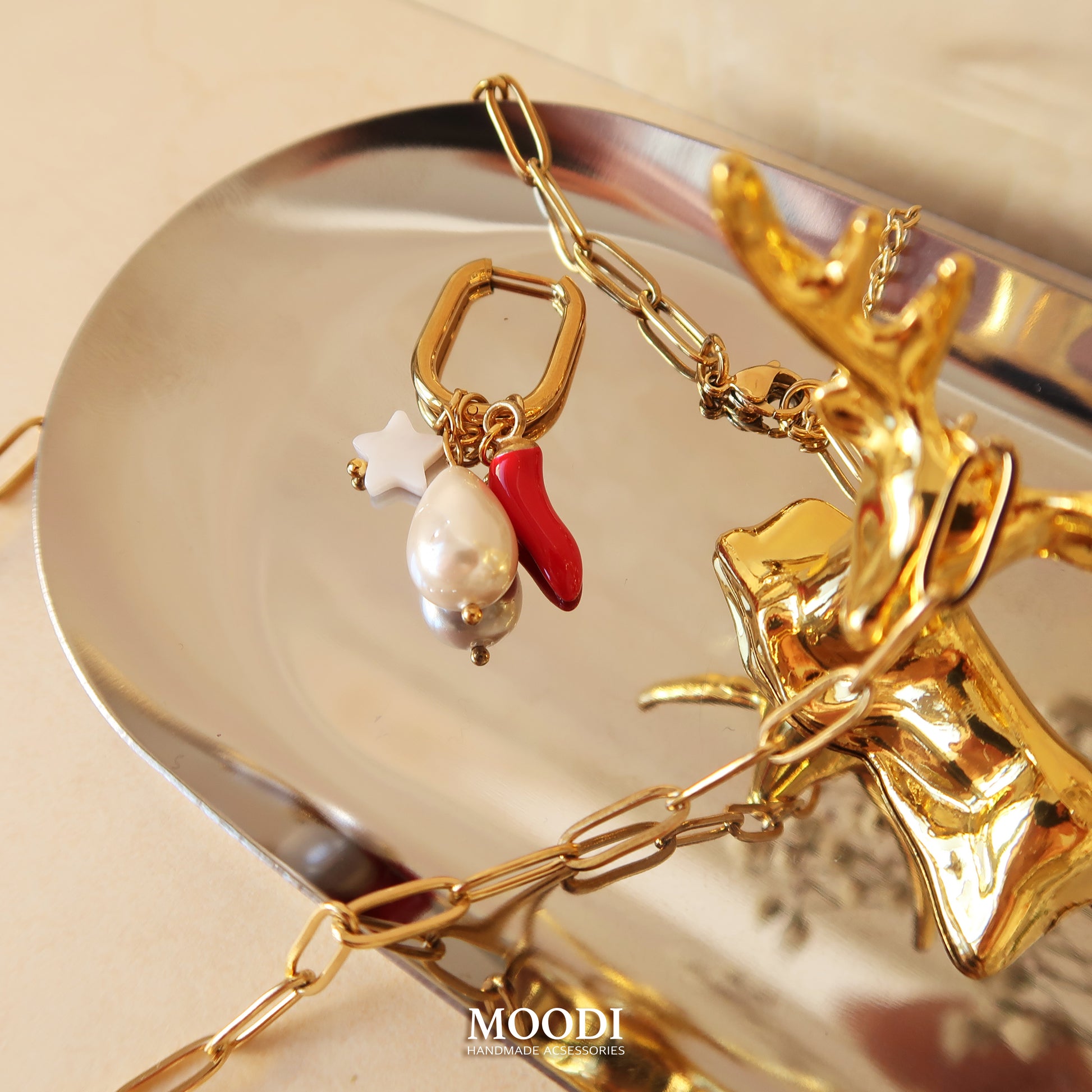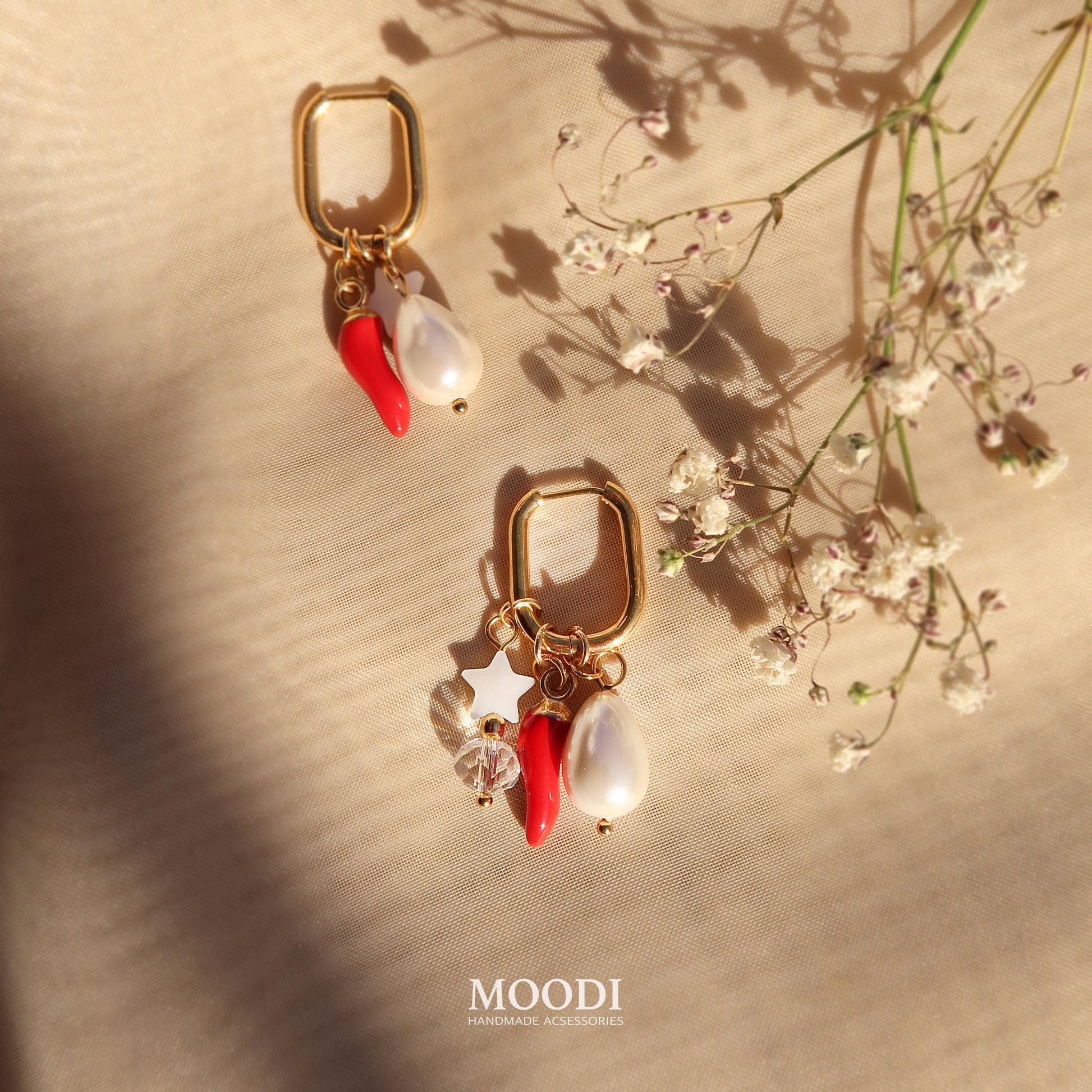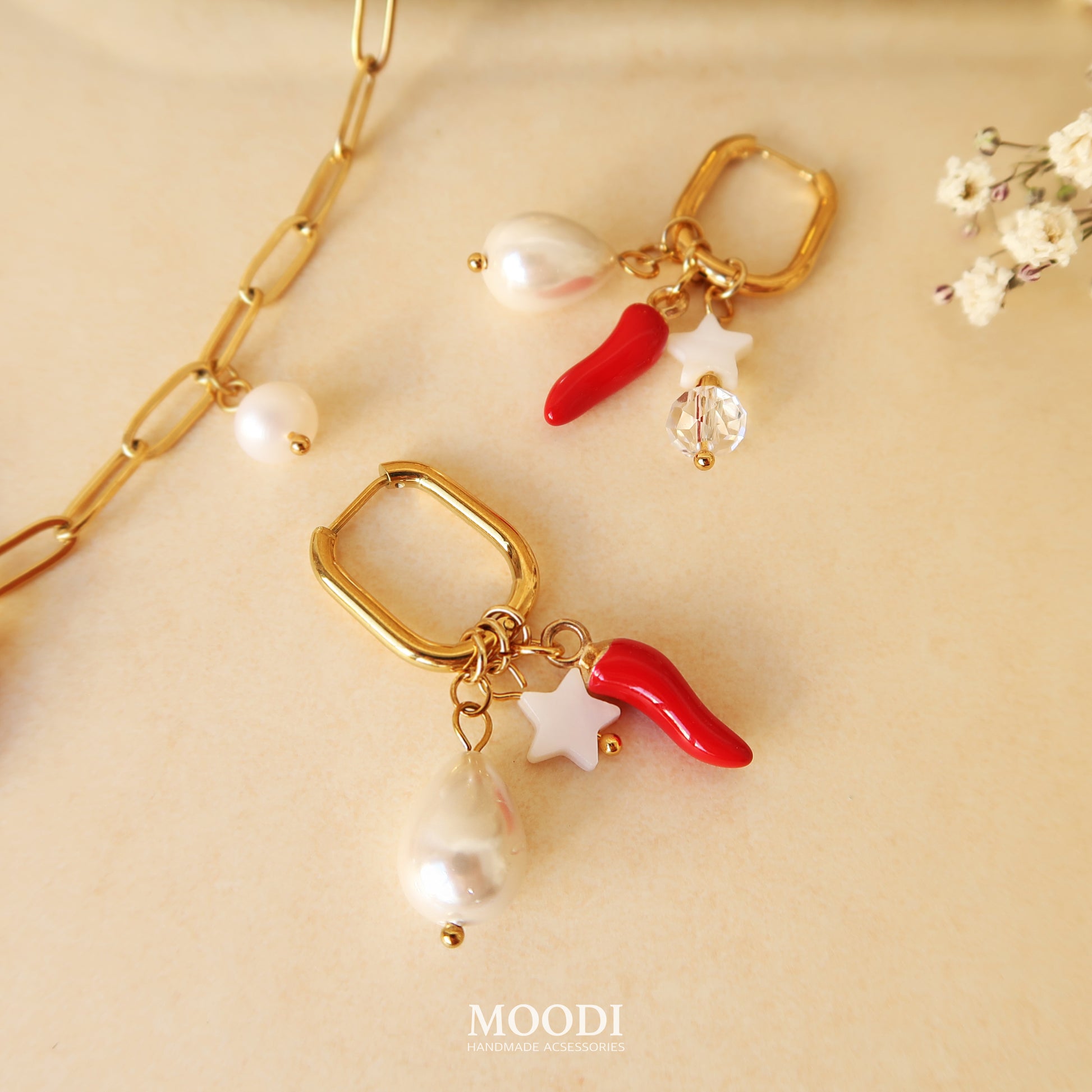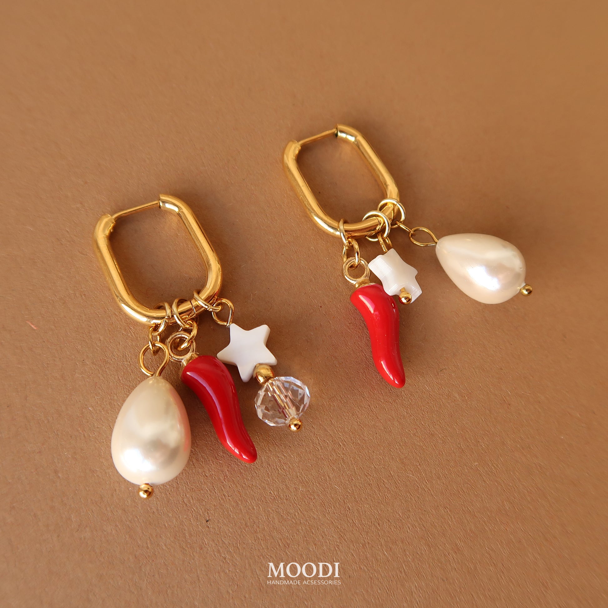 Време е да си лютиво гореща! Привлекателни обеци с червени чили чушки, перли и звезди. Комбинация, създадена за любов от пръв поглед. Обеците са тип ( 3 в 1 ) могат да се аранжират според ежедневното ви настроение.
