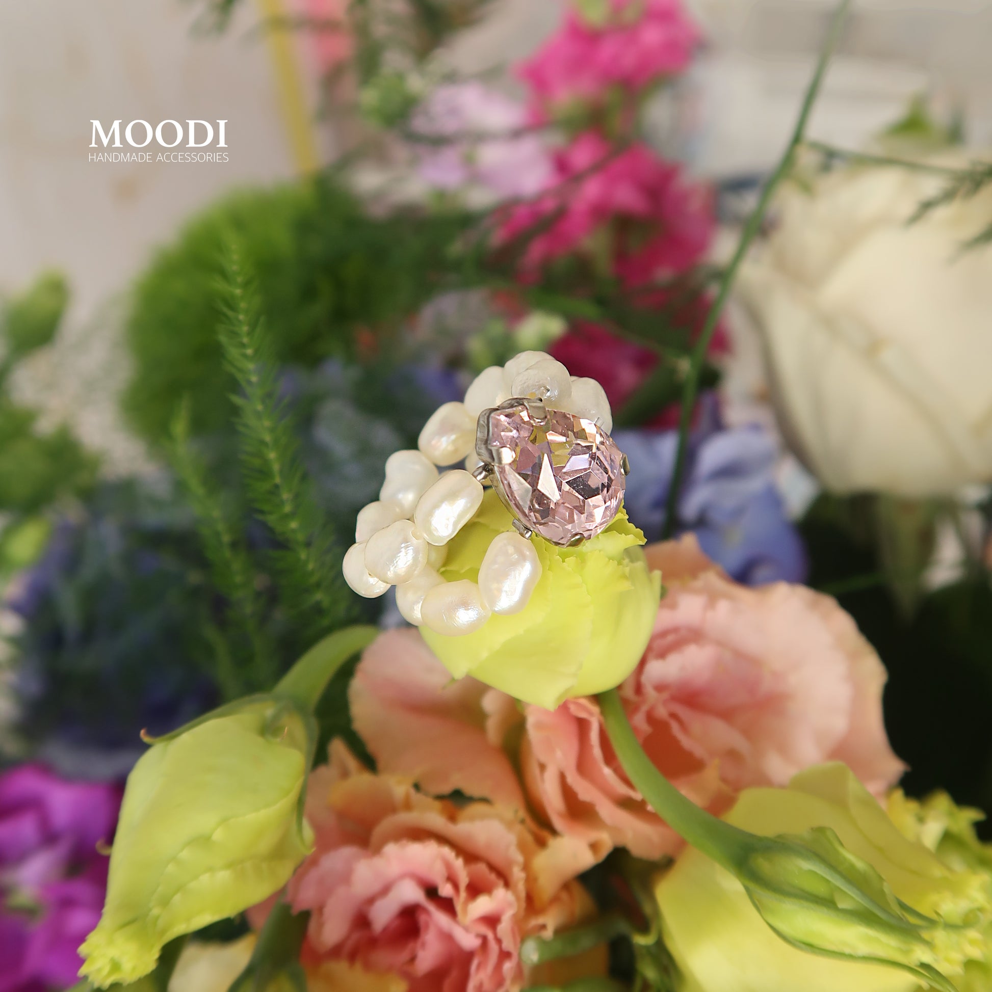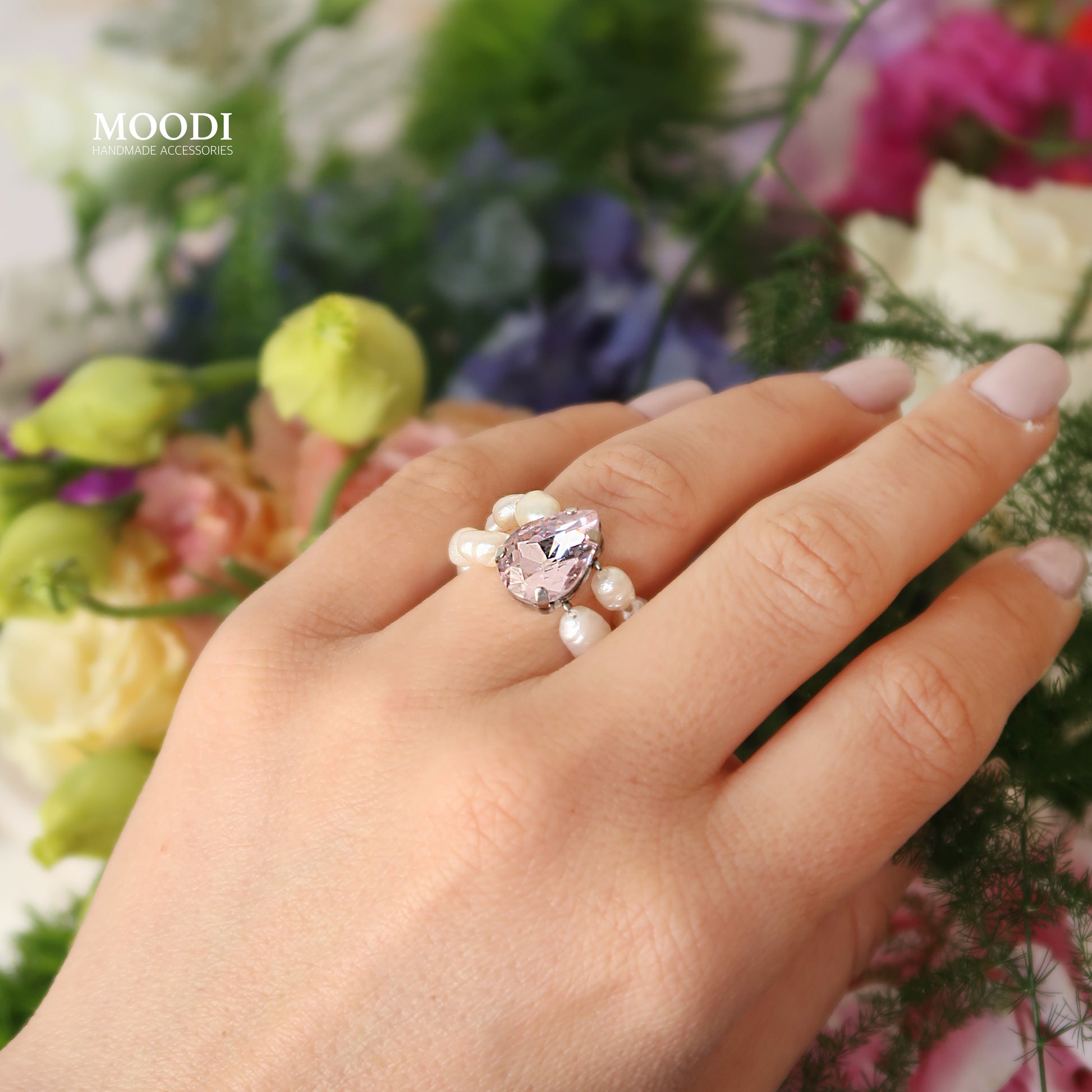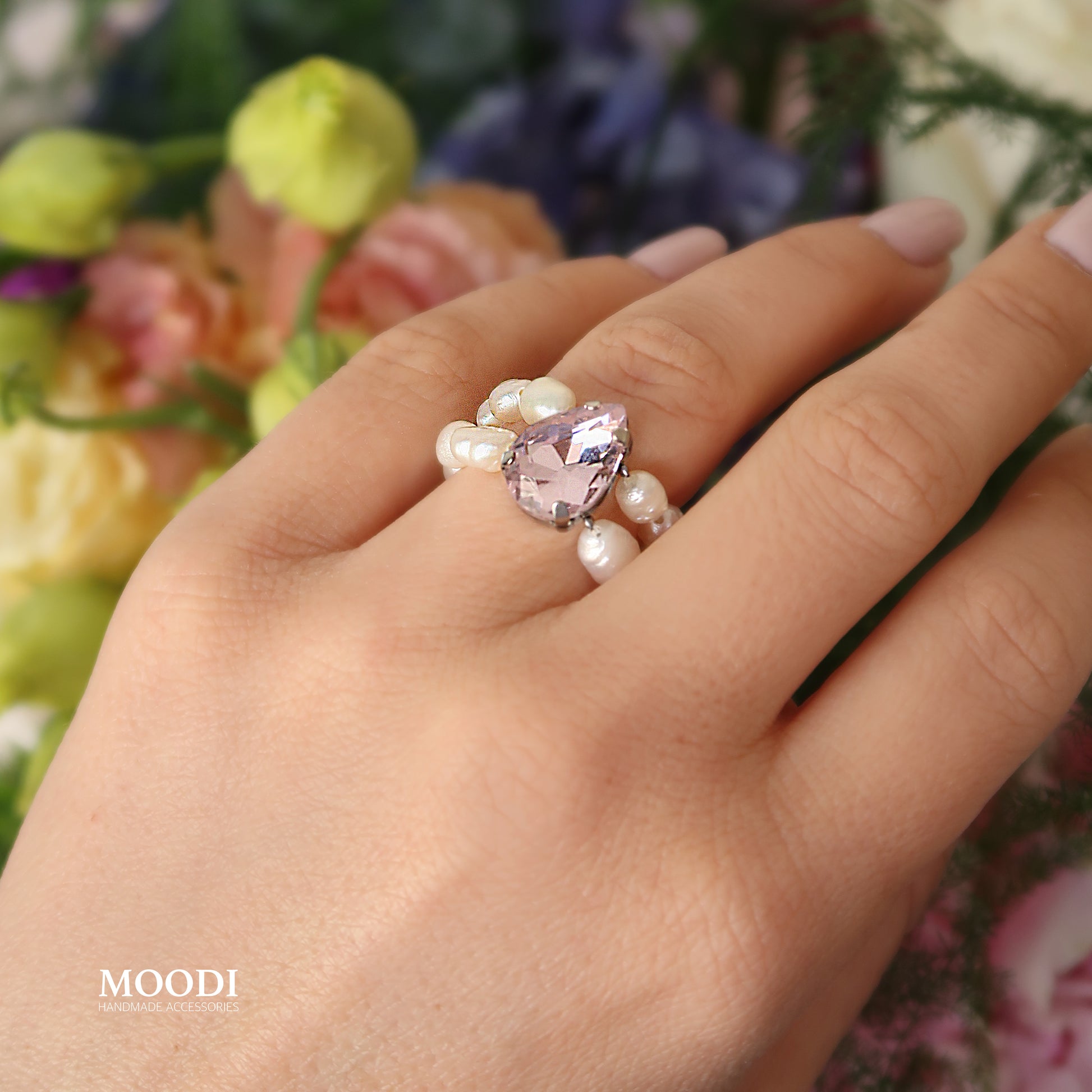 Два реда от сияйни естествени перли прегръщат пръста като вълна от нежност – деликатни, но категорични. В сърцето на всяко бижу блестят кристали под формата на капки и овал – като застинали сълзи от лунна светлина, събрани в един безвременен детайл.