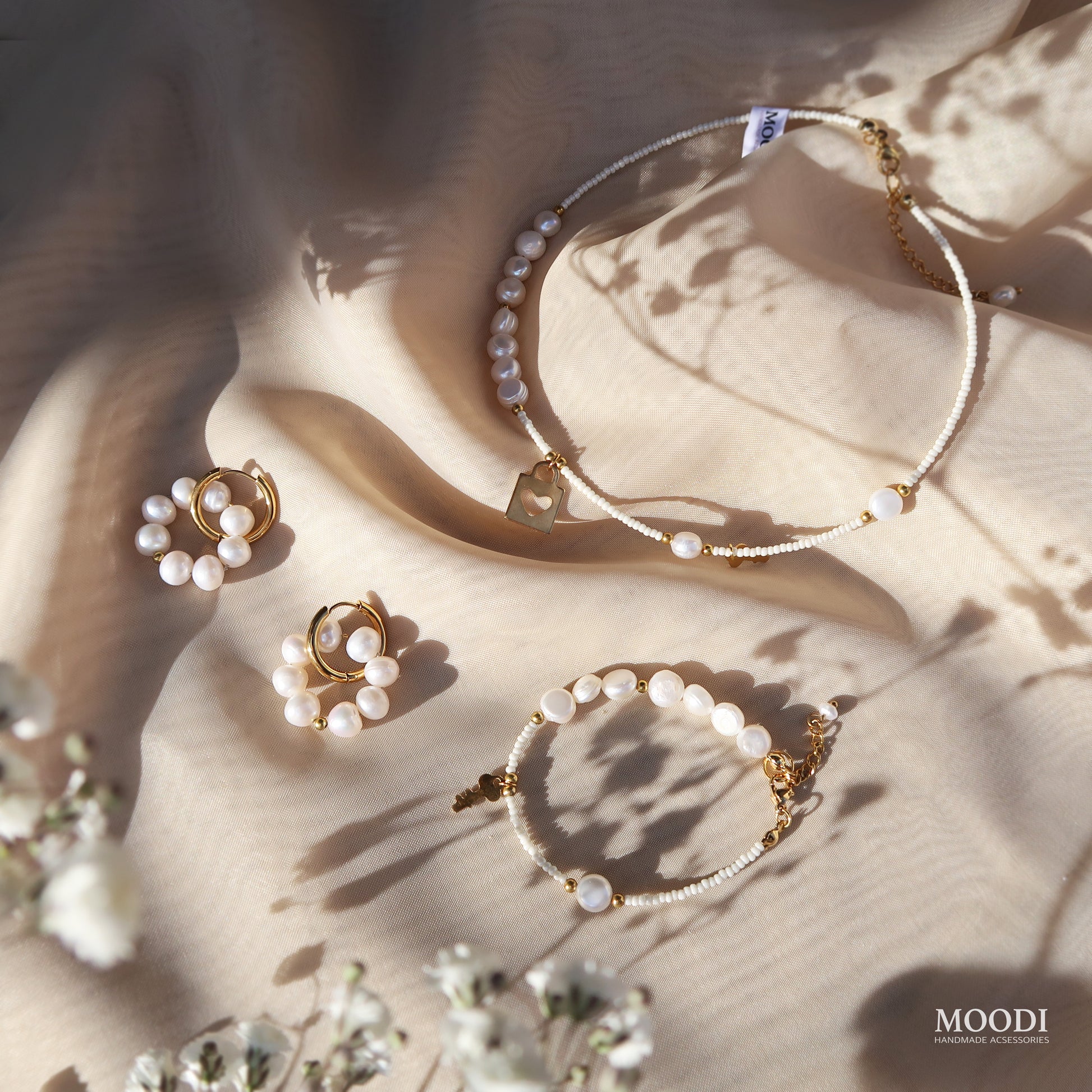 - Материал: Естествени перли клас АА / ситни миюки мъниста и от позлатена стомана / висулки от медицинска стомана / закопчалки - медицинска стомана