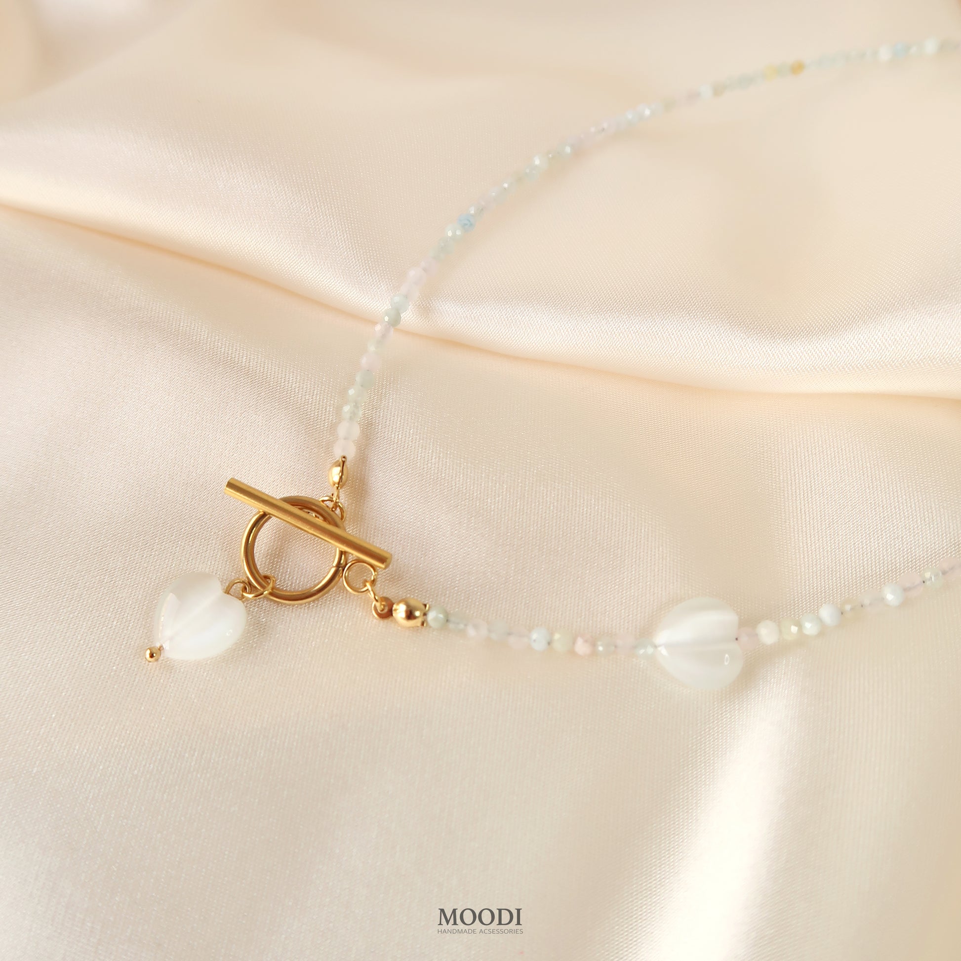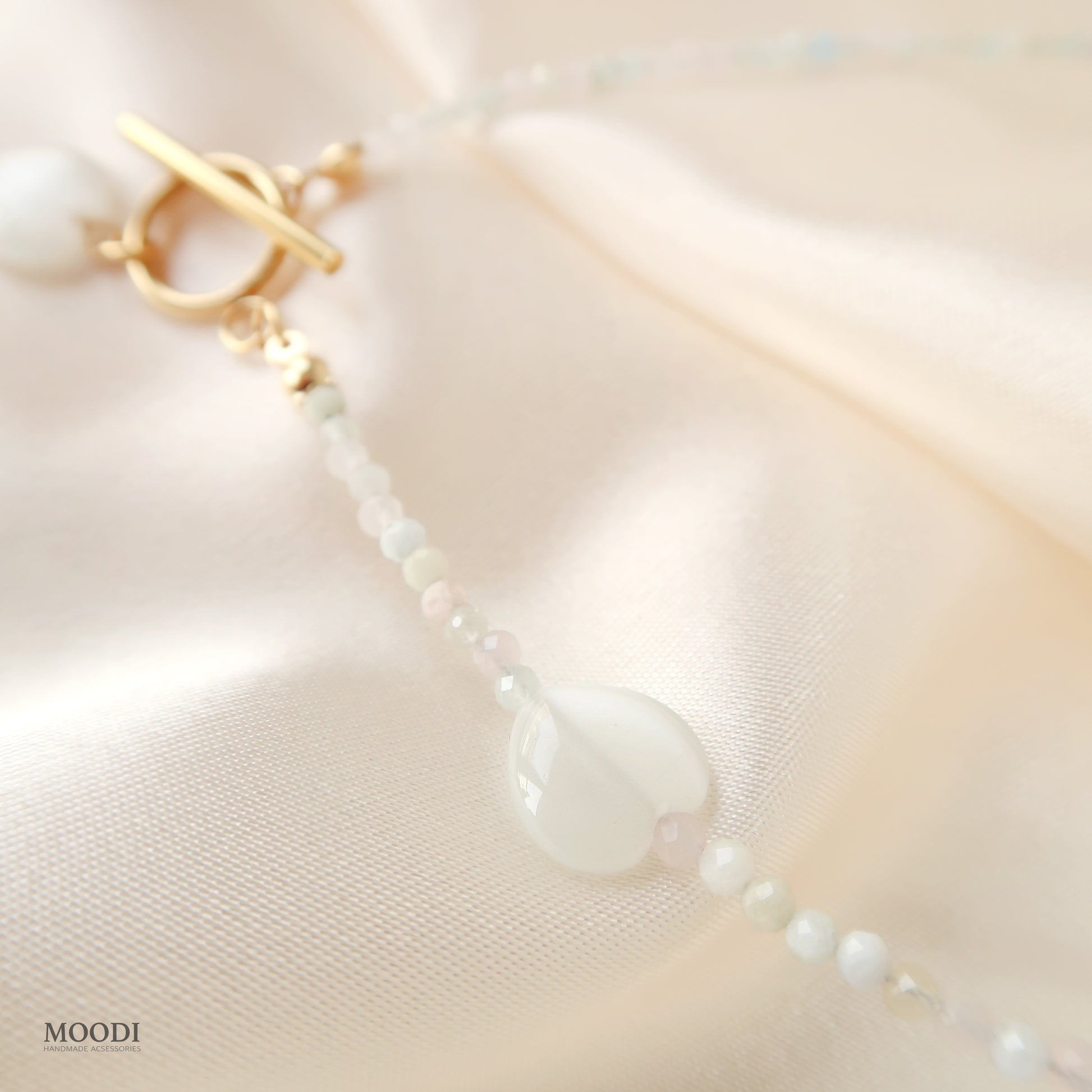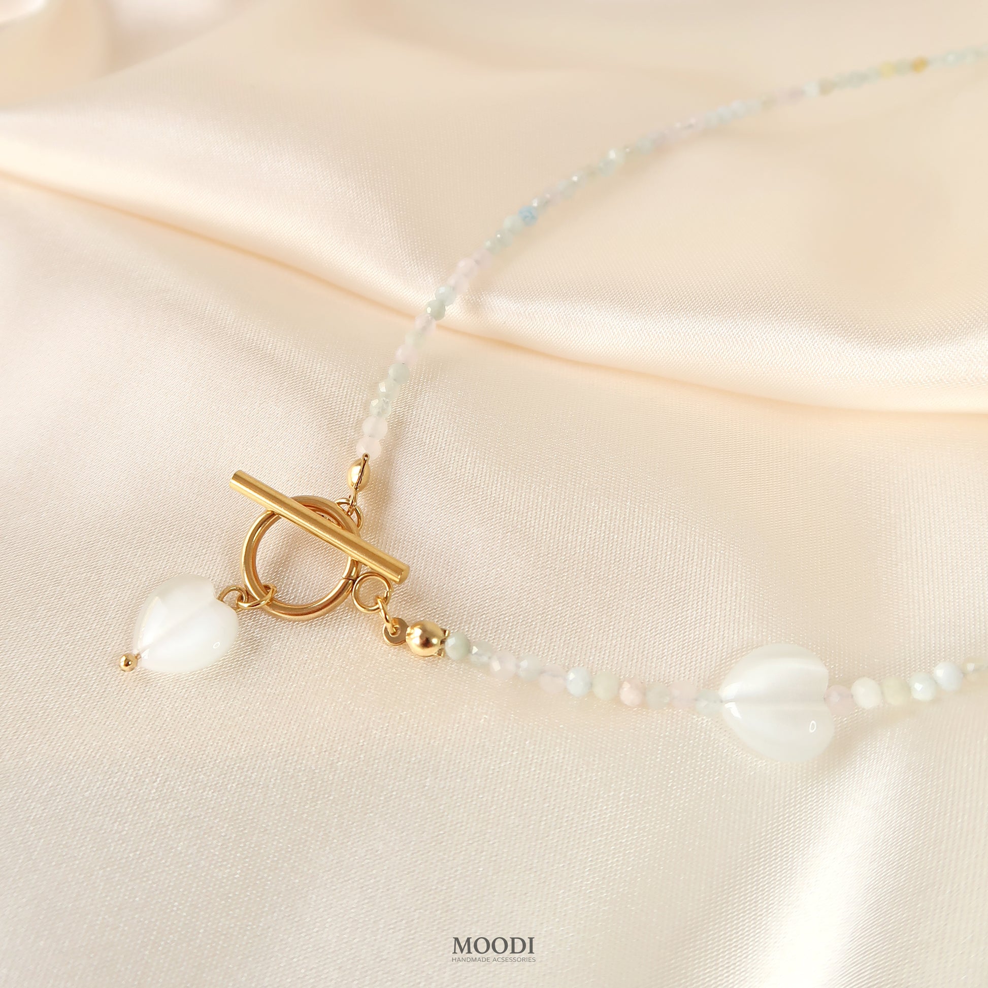 Нежно колие с предно закопчаване от камъни Берил Морганит с малки и голямо сърце от Котешко око.
