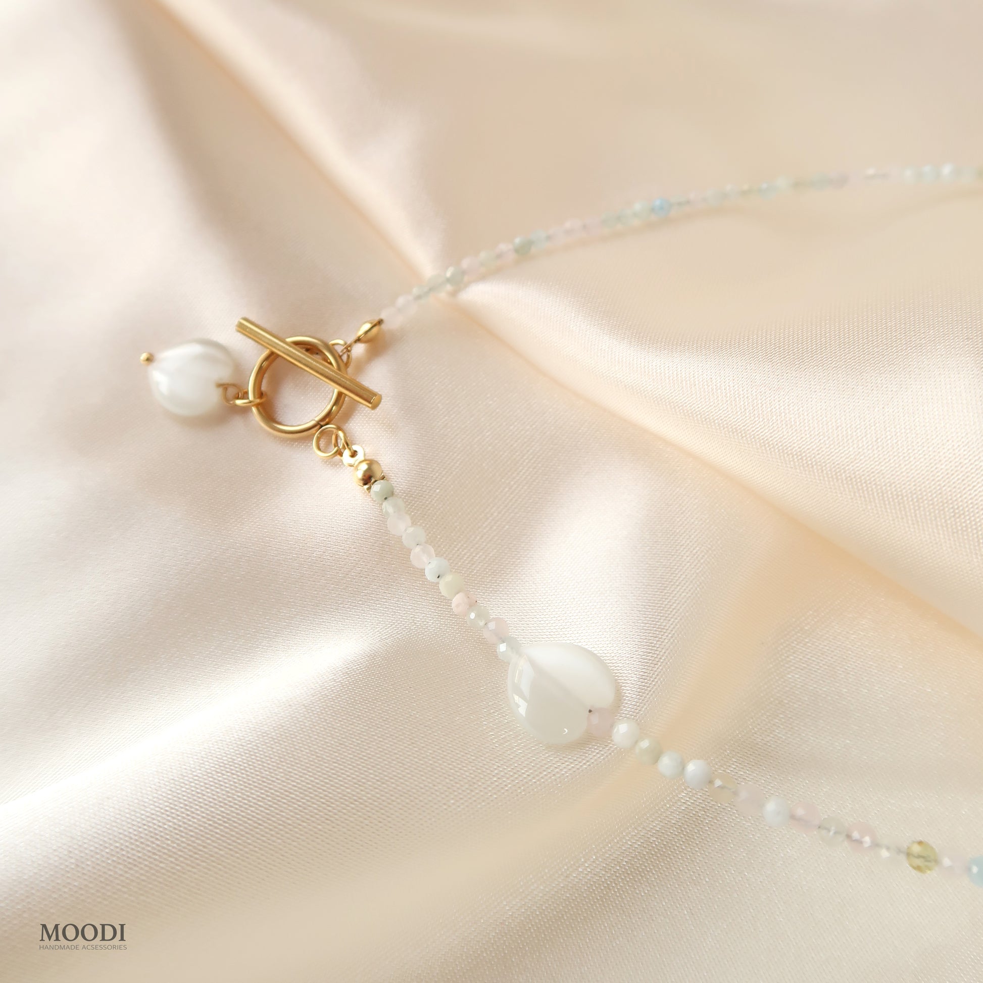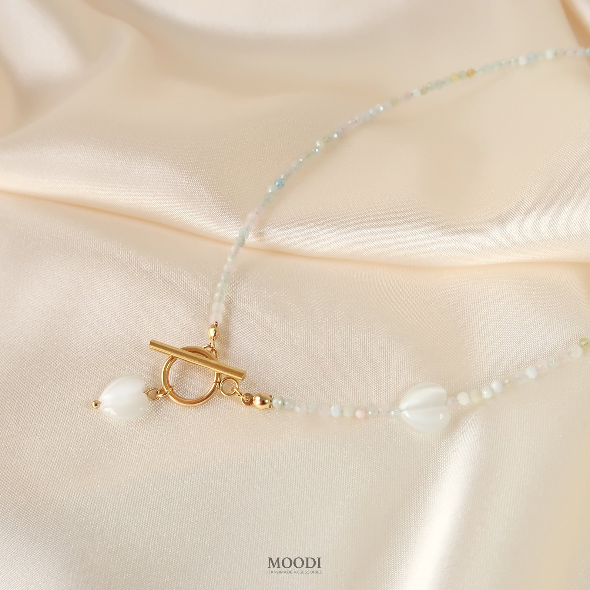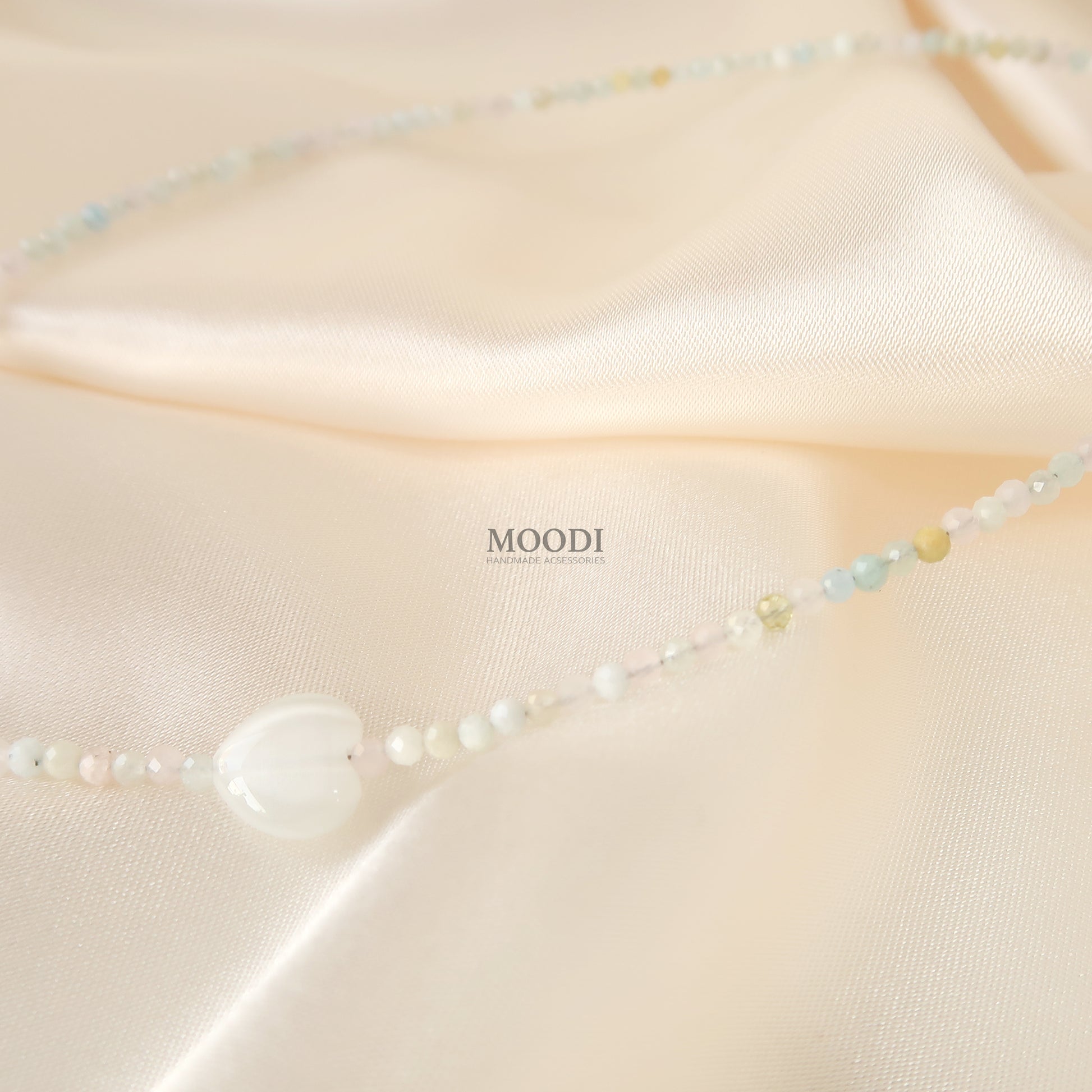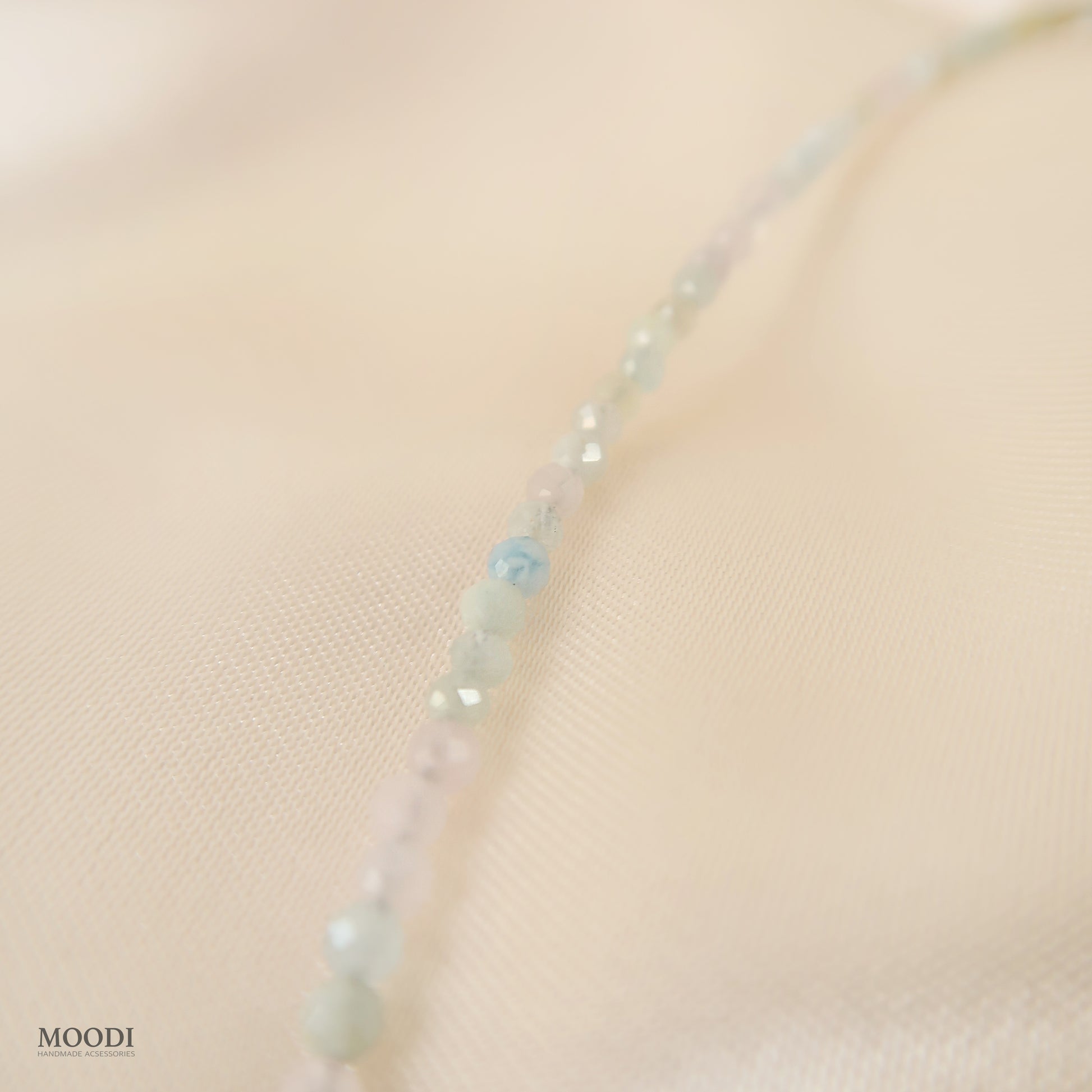 Нежно колие с предно закопчаване от камъни Берил Морганит с малки и голямо сърце от Котешко око.