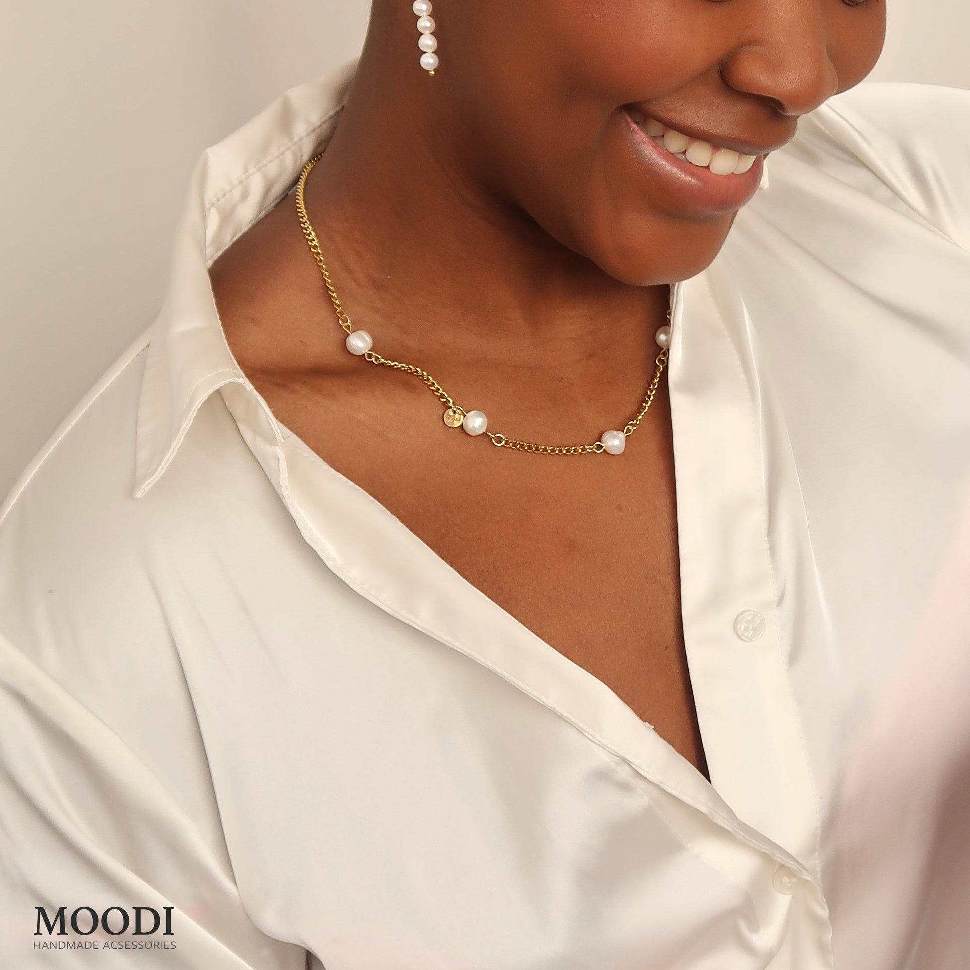Колие "Lia" с естествени барокови перли на синджир тип плетка от позлата 316L е бижуто коeто ще допълни вашата елегантност в работна, официална или по casual визия.