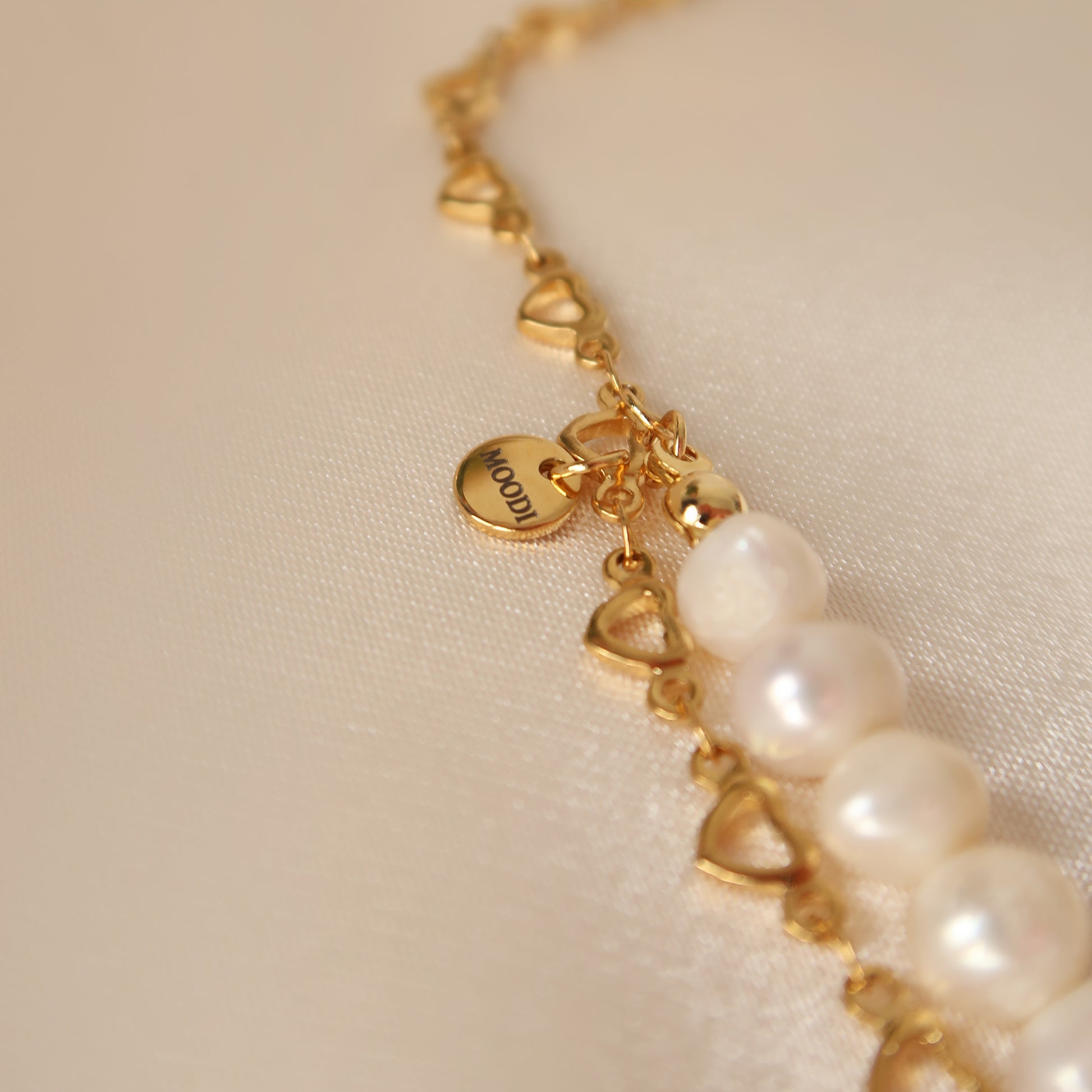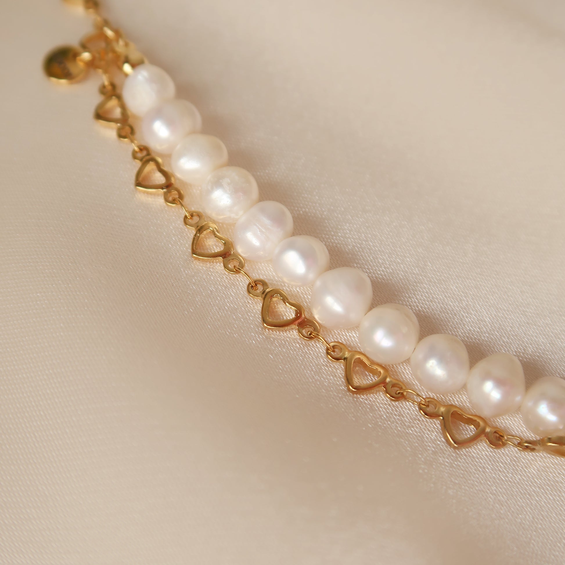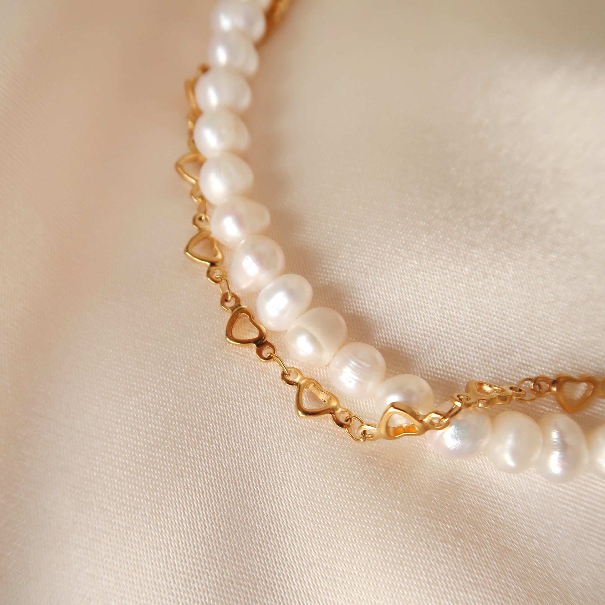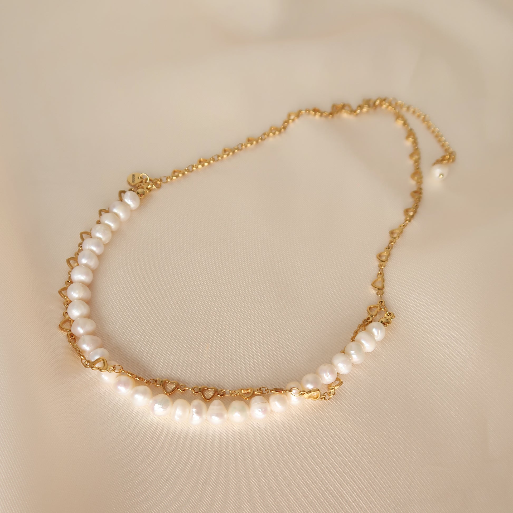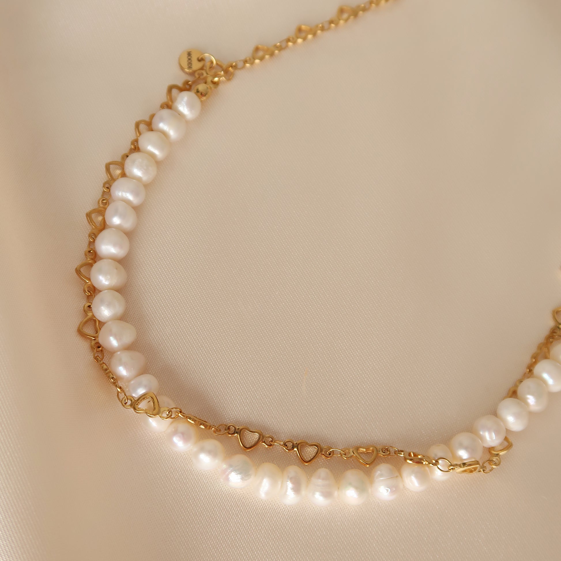Чудесно колие с естествени сладководни бели перли "Hera" е на красива стоманена верижка от мини сърца. Просто е чудесно попълнение към вашия уникален стил.