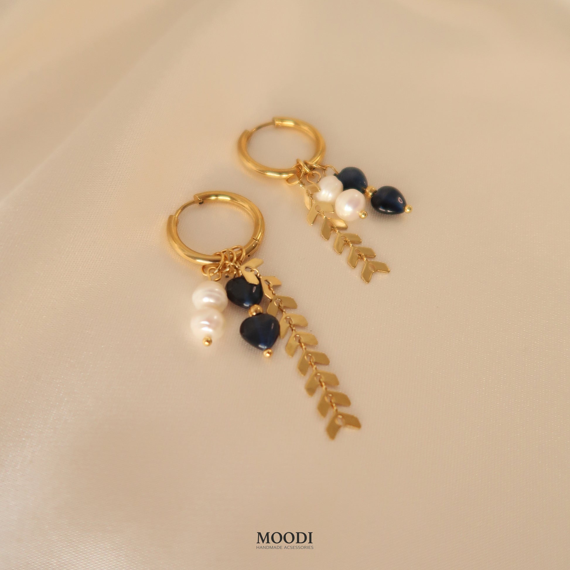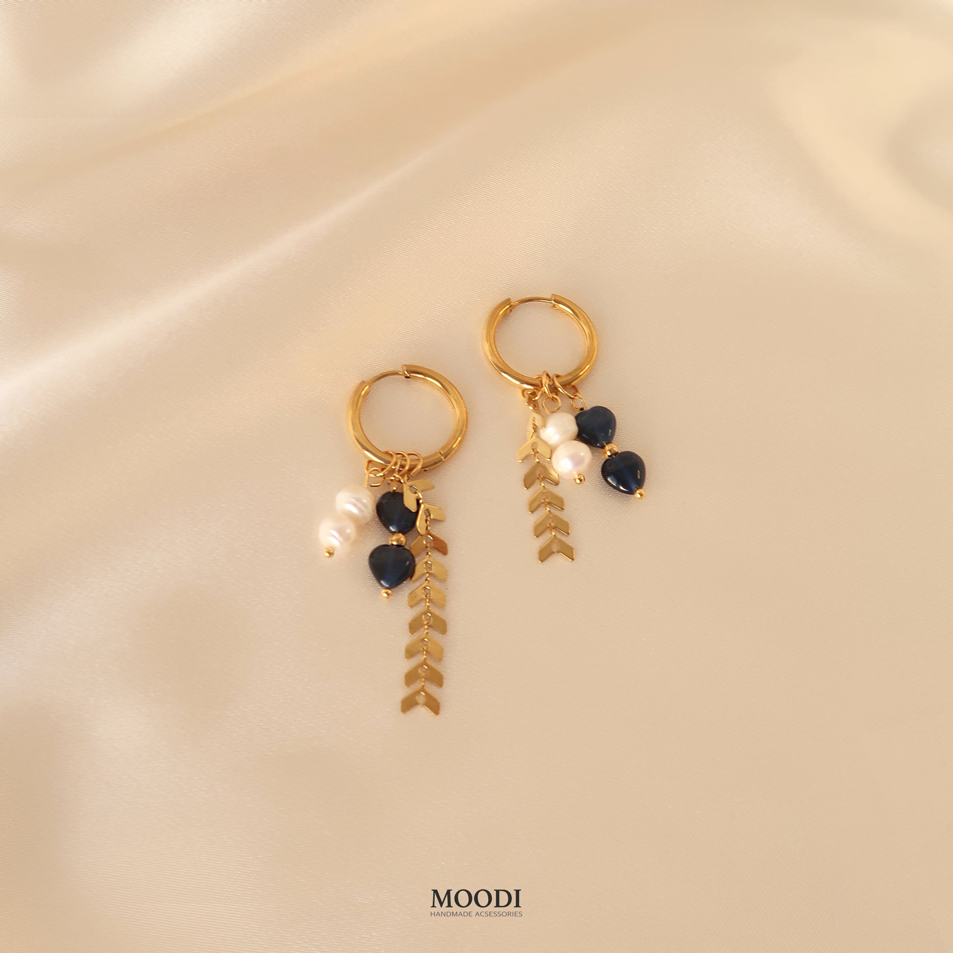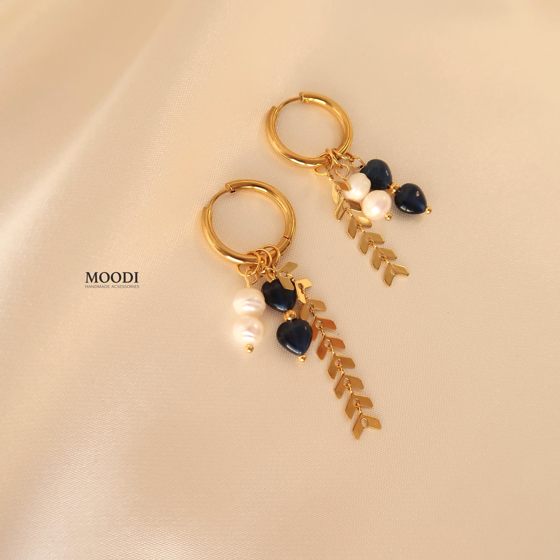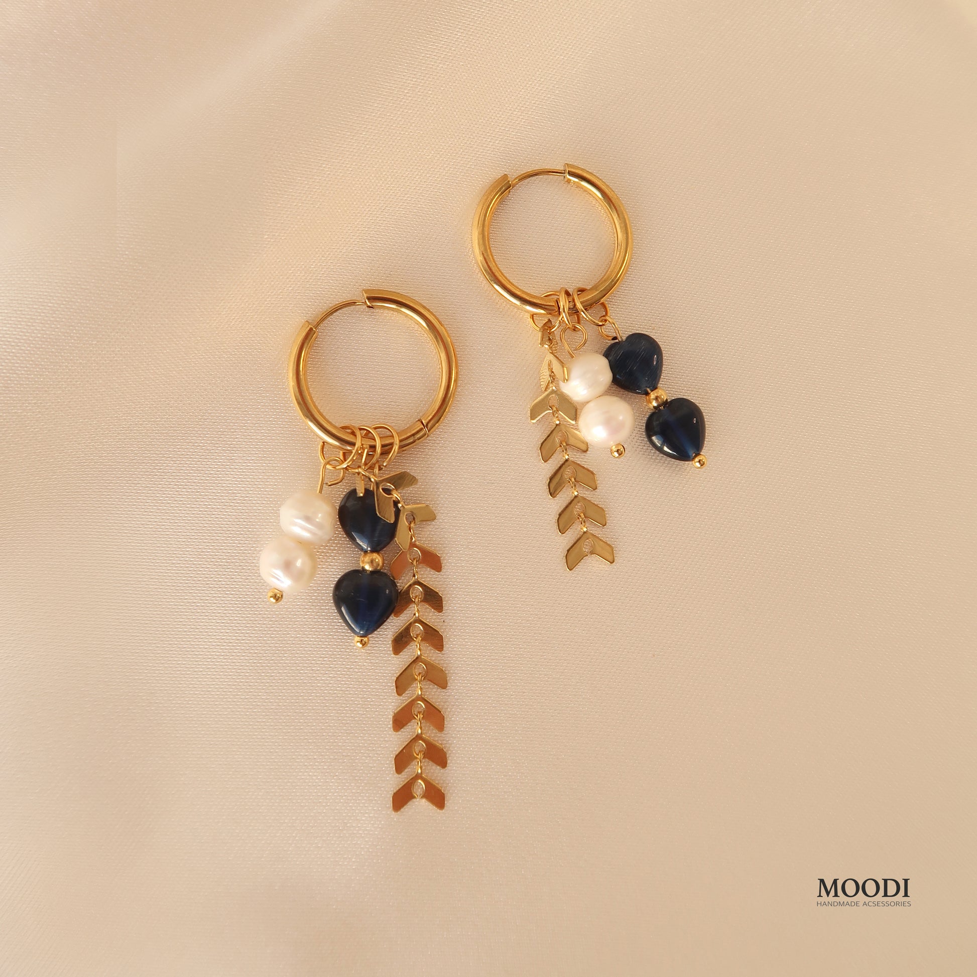 Красиви обеци в тъмно синьо със Серца от естествени камъни котешко око, естествени перли и висяши верижки тип плетка от неръждаема стоамана