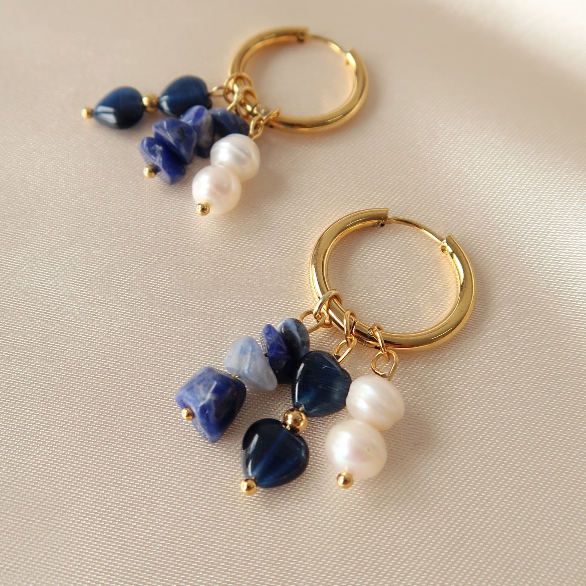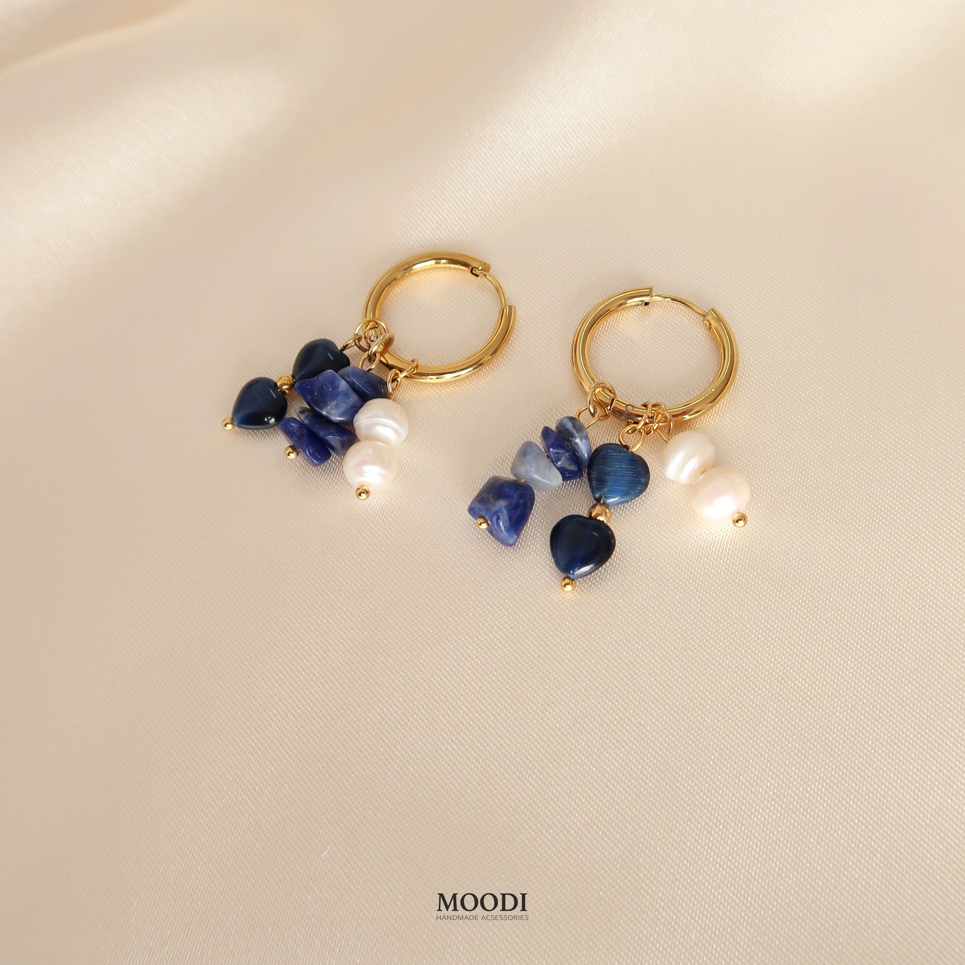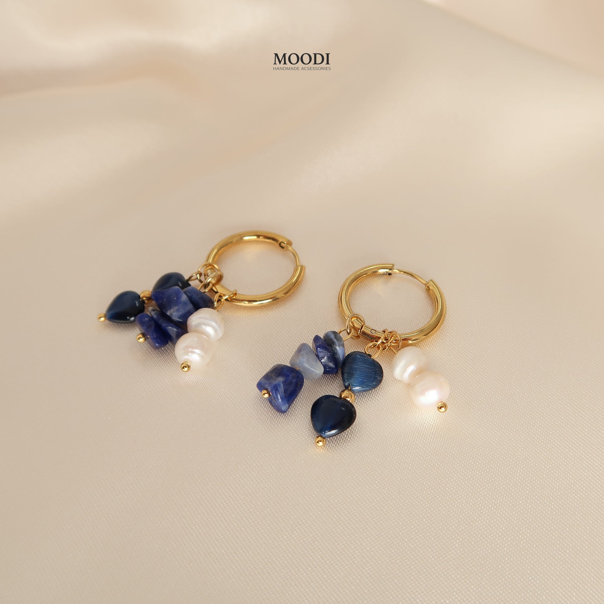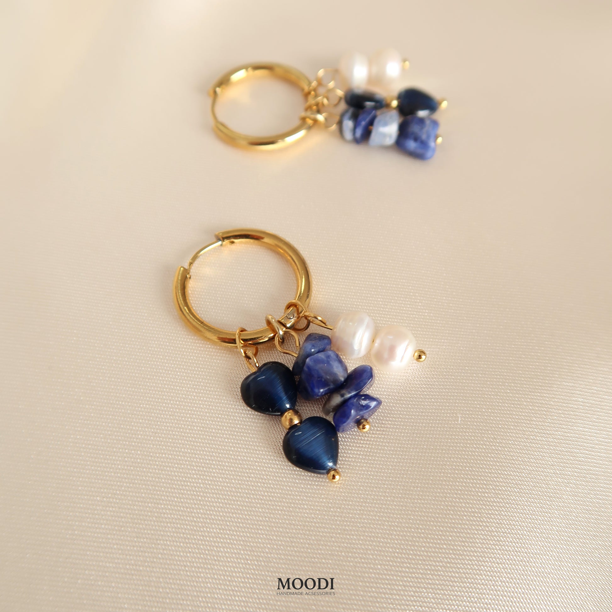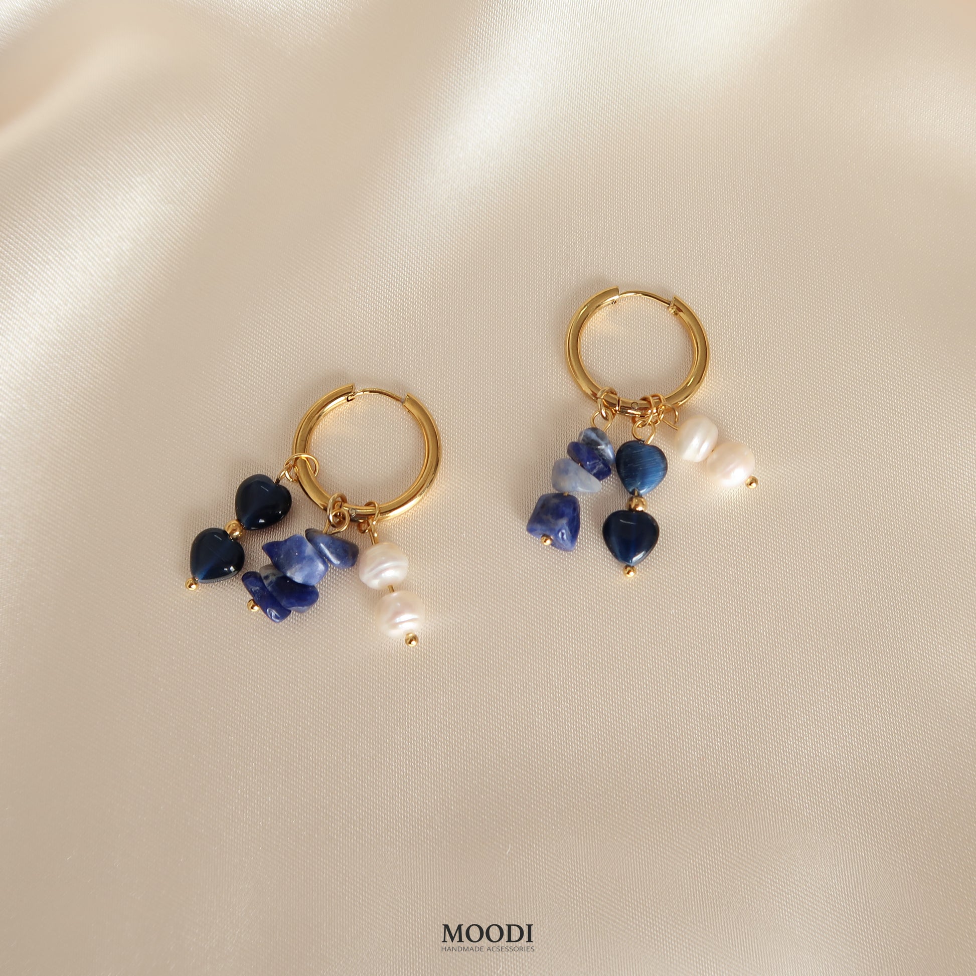 Красиви обеци в тъмно синьо от Серца от естествени камъни котешко око, необработени Естествени камъни Содалит и естествени перли